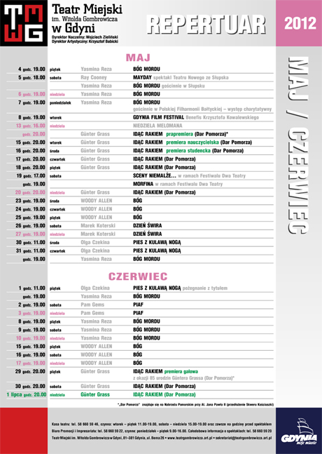 Teatr Miejski im. Witolda Gombrowicza w Gdyni zaprasza 24 i 25 kwietnia o godz.19.00 na kultową sztukę Marka Koterskiego „DZIEŃ ŚWIRA" w reżyserii Tomasza Mana. W roli głównej: Bogdan Smagacki.Jak wygląda dzień świra? „Higiena, jedzenie, praca, dzieci, jedzenie, drzemka, praca, jedzenie, praca, palenie, proszki, sen...". A jak wygląda Twój dzień? Tak samo? Może przynajmniej podobnie? Na pewno. Poznaj naszego bohatera - Adasia Miauczyńskiego. Będzie Cię denerwował i wzruszał, smucił i śmieszył, ale odnajdziesz w nim siebie. Bo „my wszyscy z niego...".On budzi się rano, i musi wstać, zacząć nowy dzień, przeżyć go jakoś, spotkać sąsiadów, pójść do lekarza, zobaczyć się z synem i byłą żoną. To musi. A czego chce? Tego, czego chce każdy z nas. Być szczęśliwy, spokojny, spotkać swoją wielką niespełnioną miłość...Trochę śmieszna trochę smutna, wzruszająca i zawsze aktualna historia bohatera naszych czasów - to właśnie „Dzień świra". Musicie go zobaczyć!Teatr Miejski im. Witolda Gombrowicza w Gdyni, ul. Bema 26.Kasa biletowa: 58 660 59 46 czynna: wtorek - piątek: godz. 11.00 - 19.00, sobota - niedziela: godz. 15.00 - 19.00 i zawsze na godzinę przed spektaklem.Więcej informacji na stronie internetowej: www.teatrgombrowicza.art.pl. Repertuar tearalny w maju: Opublikowano: 19.04.2012 00:00 Autor: Małgorzata Omachel - Kwidzińska (malgorzata.omachel-kwidzinska@gdynia.pl)