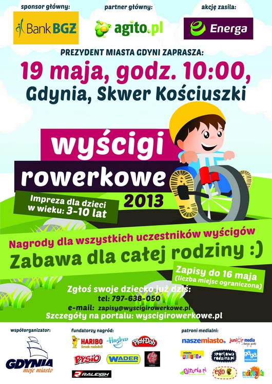 „Wyścigi Rowerkowe" to całodzienna impreza rodzinna w atmosferze pikniku, w której najmłodsi mieszkańcy miast angażują się bezpośrednio w formie zdrowej rywalizacji i uczą się zasad fair play. To też okazja do świetnej zabawy na świeżym powietrzu, w gronie rodzinnym.Ogromnym atutem samej formuły wyścigów jest niewątpliwie moment koronacji zawodników. Dzięki podziałowi na kategorie wiekowe i grupy trzyosobowe, po każdym wyścigu na stopniach podium stają wszyscy uczestnicy i wszyscy otrzymują nagrody.Atrakcje podczas imprezy:· Wyścigi Rowerkowe dla około 200 dzieci w kategoriach wiekowych 3-10 lat· policyjna służba bezpieczeństwa i znakowanie rowerów· pokazy ratownictwa medycznego i szkolenia z pierwszej pomocy· pamiątkowe zdjęcia na podium wszystkich zawodnikówNa uczestników czekać będzie również mnóstwo konkursów, gier i zabaw, w których do wygrania będą atrakcyjne nagrody.Ramowy scenariusz imprezy:10.00 - rozpoczęcie imprezy przez prowadzącego, zaproszenie do namiotu organizatora, gdzie następuje wydawanie numerków startowych. Prowadzący wyjaśnia zasady zawodów oraz prezentuje kolejność startów zawodników według kategorii wiekowych.11.00 - 15.00 - zawody w poszczególnych kategoriach wiekowych (rozpoczynają 3-latki). Po każdym wyścigu cała trójka zawodników staje na podium i wszyscy dostają nagrody.11.00, 12.00, 13.00, 14.00 - o każdej pełnej godzinie - konkursy z nagrodami15.00 - koniec zawodów16:00 - koniec imprezyGdzie i kiedy wystartujemy?godz. 10.00, 19 maja 2013 r. Gdynia, Skwer Kościuszki, Jak się zgłosić:W wyścigu mogą uczestniczyć dzieci w wieku 3-10 lat. Warunek uczestnictwa to sprawny rower, kask rowerowy i zgłoszenie dziecka przez rodzica do wyścigu pod nr. tel.: 797 638 050 lub e-mail: zapisy@wyscigirowerkowe.pl.Ilość miejsc ograniczona. Opublikowano: 16.05.2013 00:00 Autor: Małgorzata Omachel - Kwidzińska (malgorzata.omachel-kwidzinska@gdynia.pl)