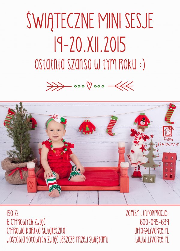 Świąteczne mini sesje dla małych i dużych - zapisy na ostatnie miejsca: 19 i 20 grudnia 2015 Serdecznie zapraszamy w najbliższy weekend 19 i 20 grudnia 2015 roku na ostatnie w tym roku mini sesje w świątecznym klimacie... Zobacz więcej