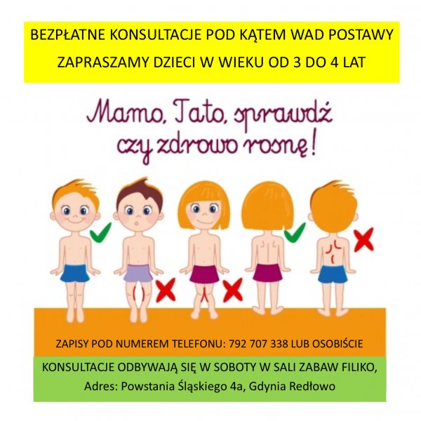Bezpłatne konsultacje w zakresie wad postawy. Zapraszamy dzieci w wieku od 3 do 4 lat. Drodzy Rodzice, serdecznie zapraszamy na BEZPŁATNE konsultacje pod kątem wady postawy dzieci w wieku od 3 - 4 lat. Konsultacje... Zobacz więcej