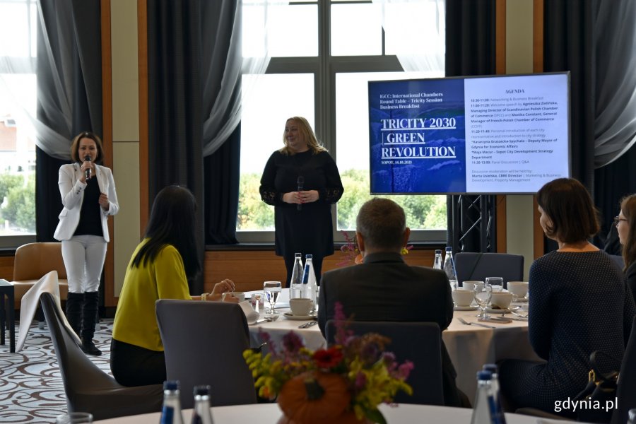 Jak kształtuje się wizja rozwoju zielonego i ekologicznego Trójmiasta? Jaki potencjał tkwi we współpracy inwestorów z samorządami? Jak dbać o lepszą jakość życia w miastach? Między innymi o tym dyskutowali przedstawiciele międzynarodowych firm i samorządowcy podczas spotkania zorganizowanego w ramach International Group of Chambers of Commerce. Odbyło się ono w czwartek, 14 października w Sopocie. Gdynię reprezentowała wiceprezydent Katarzyna Gruszecka-Spychała. Zrównoważony rozwój Trójmiasta był tematem międzynarodowego spotkania, które zorganizowano w ramach International Group of Chambers of Commerce. Miało ono formułę okrągłego stołu i odbyło się w czwartek, 14 października w hotelu Sheraton w Sopocie. – Mam zaszczyt być współorganizatorem tego wydarzenia razem z całą siecią izb gospodarczych, dla których bardzo ważny jest zrównoważony rozwój, ochrona środowiska, zredukowanie emisji dwutlenku węgla. Rozmawiamy o tym, jak biznes może wspierać władze lokalne w tym procesie, ale też, jak władze lokalne mogą wesprzeć biznes w rozwoju nowoczesnych technologii, które sprzyjają niwelowaniu negatywnego wpływu człowieka na środowisko. Celem tego spotkania jest stworzenie systemu wsparcia, który będzie miał realny wpływ na to, jak Trójmiasto się rozwija – mówi Agnieszka Zielińska, dyrektor zarządzająca Skandynawsko-Polskiej Izby Gospodarczej.– Spotykamy się w międzynarodowym gronie, bo w ramach International Group of Chambers of Commerce jednoczymy wiele izb. Firmy w nich stowarzyszone potrzebują spotkań między sobą i z partnerami zewnętrznym. I tymi partnerami są przedstawiciele samorządów. Wiodącym tematem już od wielu miesięcy jest transformacja ekologiczna. Dotyka ona każdego z sektorów – nie tylko firmy, które produkują energię i ją przetwarzają, które są obecne w tym sektorze. Zmiany dotykają wszystkich przedsiębiorstw. Od kilku dni obserwujemy niesamowity wzrost cen energii w całej Europie. Polska i tak ma stosunkowo niskie ceny energii w porównaniu z tym, co się dzieje w Hiszpanii, Francji, Włoszech czy Niemczech. Ten temat dotyka bardzo mocno również firm w Polsce. Mam wrażenie, że to spotkanie, które jest zaplanowane na 2 godziny, mogłoby trwać 2 dni, a i tak nie odpowiedzielibyśmy sobie na wszystkie pytania. Mam nadzieje, że dyskusja podniesie świadomość i wesprze te firmy, które poszukują dobrych praktyk i dobrych rozwiązań – mówi Monika Constant, dyrektor generalna Francusko-Polskiej Izby Gospodarczej. W spotkaniu uczestniczyli m.in. przedstawiciele firm skandynawskich francuskich, niemieckich, belgijskich czy szwajcarskich, a także samorządowcy z Gdyni i Sopotu oraz ambasador Danii – Ole Toft i Alain Mompert – konsul honorowy Francji na Pomorzu. Nasze miasto reprezentowała wiceprezydent Katarzyna Gruszecka-Spychała. – Nie od dzisiaj wiadomo, że bezpośrednie inwestycje zagraniczne to dziedzina, która znacząco wpływa na kondycję gospodarki, a często wręcz ją determinuje, dlatego kontakty z zagranicznymi izbami gospodarczymi są dla nas niezwykle ważne. Przez wiele miesięcy nie było jak się spotykać. Teraz ta szansa się pojawia. Bardzo się cieszę, że współpracujemy z wieloma izbami, że to nie jest przedstawicielstwo tylko jednego kraju, ale wielu. Rozmawiamy o różnych kwestiach, które są żywotne dla Gdyni, jak np. energetyka wiatrowa i cała tematyka offshore, która bardzo interesuje Danię. Będziemy też przedstawiać nasze plany inwestycyjne dotyczące dekarbonizacji, zielonej polityki, które są interesujące dla drobnych inwestorów zagranicznych, którzy mają w swoich politykach firmowych konieczność dbałości o te tematy i zanim zdecydują się zainwestować w jakimś mieście, chcą sprawdzić, czy ono respektuje te zasady – mówi Katarzyna Gruszecka-Spychała, wiceprezydent Gdyni ds. gospodarki.– Bardzo ważna jest dla nas współpraca w regionie Morza Bałtyckiego. Ten region ma duży potencjał. Widzimy duży potencjał w zielonej transformacji tego regionu. Zauważamy też wielki potencjał w rozwijającym się w Polsce przemyśle morskiej energetyki wiatrowej, szczególnie w Gdyni. Mamy nadzieję, że powstanie tu centrum rozwoju i współpracy w tym sektorze – mówi Ole Toft, ambasador Danii. Po oficjalnym otwarciu wydarzenia odbyła się dyskusja panelowa. Wzięły w niej udział: Katarzyna Gruszecka-Spychała – wiceprezydent Gdyni ds. gospodarki oraz Maja Macur z Urzędu Miasta Sopotu. Rozmowę poprowadziła Marta Usielska – dyrektor CBRE. Główne tematy, które poruszali uczestnicy spotkania, dotyczyły dążenia do gospodarki bezemisyjnej, co jest sednem Europejskiego Zielonego Ładu. Miasta w całej Europie zobowiązały się do znacznego ograniczenia emisji gazów cieplarnianych do 2030 roku i osiągnięcia neutralności klimatycznej do 2050 roku. Prelegenci zastanawiali się, jakie ma to odzwierciedlenie w długofalowej strategii w Trójmieście. Uczestnicy dyskusji starali się też m.in. odpowiedzieć na pytania: jak zaoszczędzić na rosnących kosztach energii, jaka jest wizja zielonego Trójmiasta, jak miasta wpływają na nasze zdrowie psychiczne i fizyczne oraz jaki mają wpływ na całe społeczności, klimat i środowisko, w którym żyjemy, co możemy lepiej zaplanować w mieście, jaki potencjał tkwi we współpracy samorządów z lokalnymi inwestorami, a także czy projekty zielonej transformacji mają wpływ na proces budowania topowych talentów Trójmiasta. Galeria zdjęć Pobierz galerię Od lewej: Monika Constant, dyrektor generalna Francusko-Polskiej Izby Gospodarczej oraz Agnieszka Zielińska, dyrektor zarządzająca Skandynawsko-Polskiej Izby Gospodarczej witają uczestników spotkania zorganizowanego w ramach współpracy IGCC // fot. Magdalena Czernek Pobierz zdjęcie Przy pierwszym stoliku od lewej: Maja Macur z Urzędu Miasta Sopotu, Katarzyna Gruszecka-Spycha