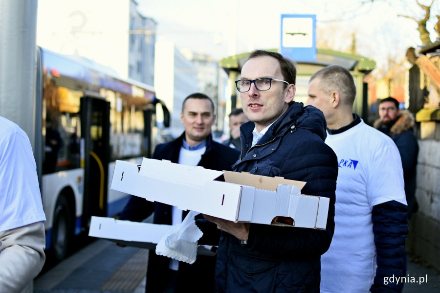 Z samego rana, gdy przed piekarniami ustawiały się długie kolejki po pączki, na ulice miasta wyruszył nowoczesny autobus elektryczny przystrojony w dobrze znany tłustoczwartkowy przysmak. A na pokładzie między innymi prezydent Gdyni Wojciech Szczurek, wiceprezydent ds. innowacji Michał Guć, pracownicy gdyńskiego PKA i przedstawiciele Mercedesa. Pasażerowie, którzy czekali na przystankach mogli liczyć na drobny poczęstunek.