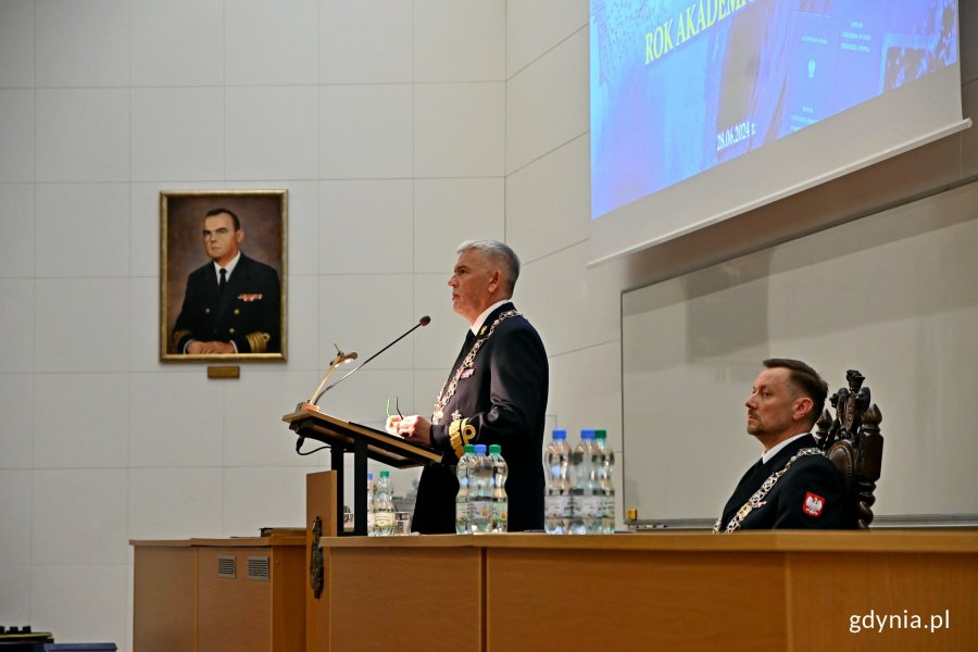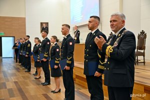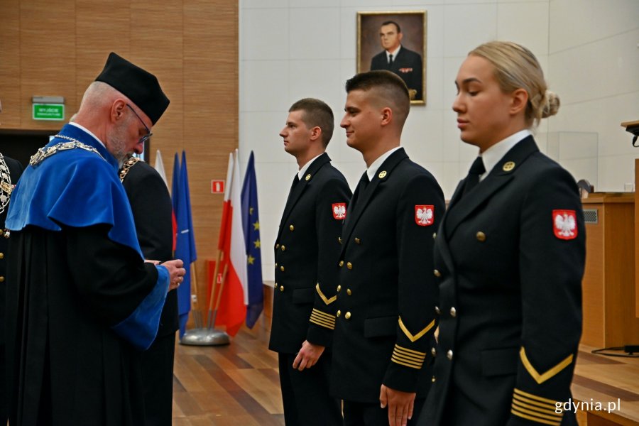 Mają za sobą pięć lat studiów oraz intensywne praktyki. 89 absolwentów Akademii Marynarki Wojennej odebrało dyplomy ukończenia studiów II stopnia. Uroczystość odbyła się w piątek, 28 czerwca w audytorium Biblioteki Głównej AMW. Natomiast w sobotę, 29 czerwca absolwenci otrzymają promocję na pierwszy stopień oficerski. Za nimi wymagające studia i szkolenie wojskowe. Przed nimi otwarte drzwi do kariery wojskowej. Absolwenci studiów II stopnia Akademii Marynarki Wojennej odebrali dyplomy. Podczas uroczystości w audytorium Biblioteki Głównej AMW wręczyli im je kadm. prof. dr hab. Tomasz Szubrycht – rektor-komendant uczelni oraz dziekani poszczególnych wydziałów. Poza społecznością akademicką w wydarzeniu uczestniczyli również m.in. Aleksandra Kosiorek – prezydent Gdyni oraz rodziny i bliscy absolwentów. – Mogę powiedzieć, że od momentu, kiedy rozpoczęli służbę wojskową do jutra minie 1800 dni, niełatwych dni. Tak naprawdę oni musieli wypełnić wszystkie wymogi, które mają studenci cywilni na poszczególnych kierunkach studiów. Plus cały blok szkolenia wojskowego. Zatem można powiedzieć, że półtorej albo dwa dyplomy mieszczą się w tym jednym. Czy ciężko pracowali? Jak najbardziej. Wykazali się wszelkimi predyspozycjami, żeby być oficerami Marynarki Wojennej, oficerami Wojska Polskiego. Było ich 120, a kończy prawie 90. Także co czwarty student nie doczekał tego momentu – mówi kadm. prof. dr hab. Tomasz Szubrycht, rektor-komendant Akademii Marynarki Wojennej w Gdyni.– Mamy nadzieję, że nasi absolwenci z akademii trafią prosto do struktur Marynarki Wojennej i że zostaną w naszym mieście. Bardzo się cieszę, bo uczelnia ta jest niezwykle renomowana i zapewnia napływ wykształconych młodych ludzi do struktur, które dbają o nasze bezpieczeństwo, więc taki dzień jest niezwykle istotny. Dla mnie również istotny prywatnie, bo mój małżonek przez 20 lat służył w Marynarce Wojennej, więc to symboliczne – podkreśla Aleksandra Kosiorek, prezydent Gdyni. Studia II stopnia ukończyło łącznie 89 absolwentów, w tym 16 kobiet. Z Wydziału Nawigacji i Uzbrojenia Okrętowego Akademii Marynarki Wojennej – 28 osób, z Wydziału Mechaniczno-Elektrycznego Akademii Marynarki Wojennej – 26 osób oraz z Wydziału Dowodzenia i Operacji Morskich Akademii Marynarki Wojennej – 35 osób. Prymusem, czyli absolwentem, który uzyskał najlepszą lokatę, został bsm. pchor. Bartosz Słupczewski. II lokatę zdobył bsm. pchor. Filip Mucha. III lokatę uzyskała bsm. pchor. Aleksandra Poletyło. – Pięć lat ciężkiego wysiłku za nami. Dzisiaj jest taki dzień, w którym zbieramy żniwa. Świętujemy zakończenie studiów, ale równocześnie każdy z nas ma świadomość, że to jest początek czegoś nowego. I nie koniec naszej przygody, a początek nauki na nowych stanowiskach służbowych i dalsza praca, ciężka praca. Uważam, że każdy kto chce, powinien spróbować, chociaż oczywiście wiąże się to z dodatkowymi obowiązkami i trzeba mieć silną motywację, żeby przez te 5 lat tutaj przebrnąć bez większych problemów i ukończyć tę szkołę z dobrymi wynikami – mówi bsm. pchor. Bartosz Słupczewski, prymus Akademii Marynarki Wojennej.– Akademia na pewno odegrała dużą rolę w rozwoju ku naszemu zawodowi. Jesteśmy już wyznaczeni na kolejne stanowiska służbowe. W następnej kolejności będziemy się przygotowywać do pracy już jako oficer – mówi bsm. pchor. Aleksandra Poletyło, najlepsza absolwentka Akademii Marynarki Wojennej.– Zdecydowanie uczelnia wojskowa to nie tylko rozwijanie umiejętności twardych związanych z wykonywanym zawodem, ale również umiejętności miękkie – społeczne kontakty z przyszłymi podwładnymi czy przełożonymi. To również było w nas tutaj pielęgnowane i każdy z nas przez 5 lat mógł się tego nauczyć – dodaje bsm. pchor. Filip Mucha, jeden z najlepszych absolwentów Akademii Marynarki Wojennej. Prymus bsm. pchor. Bartosz Słupczewski otrzymał również Nagrodę Prezydenta Gdyni, którą wręczyła mu Aleksandra Kosiorek.Prezydent Gdyni Aleksandra Kosiorek wręcza Nagrodę Prezydenta Gdyni prymusowi - bsm. pchor. Bartoszowi Słupczewskiemu (fot. Magdalena Czernek)Po zakończeniu uroczystości odsłonięto tablicę pamiątkową „Promocja 2024”, którą umieszczono wśród tablic z absolwentami AMW od początku powstania uczelni. Natomiast po południu absolwentom wręczono patenty oficerskie.Jednak najważniejsza ceremonia dopiero przed nimi. W sobotę, 29 czerwca o godz. 11.00 na pokładzie okrętu-muzeum ORP „Błyskawica” odbędzie się uroczysta promocja na pierwszy stopień oficerski. – Do pełni szczęścia brakuje jeszcze tylko jednego elementu. To uderzenie w ramię, czyli promocja oficjalna na pokładzie ORP „Błyskawica”, która będzie w sobotę. Promocja na tym historycznym okręcie jest taką klamrą pokazującą, że Marynarka Wojenna to ciągłość, tradycja i cierpliwość – mówi kadm. prof. dr hab. Tomasz Szubrycht, rektor-komendant Akademii Marynarki Wojennej w Gdyni. Absolwenci wypowiedzą słowa ślubowania. Dla uhonorowania nowo mianowanych podporuczników zostanie też oddany salut armatni. Galeria zdjęć Pobierz galerię Poczet sztandarowy wkraczający do audytorium Biblioteki Głównej AMW podczas uroczystości wręczenia dyplomów ukończenia studiów II stopnia absolwentom uczelni (fot. Magdalena Czernek) Pobierz zdjęcie Absolwenci studiów II stopnia Akademii Marynarki Wojennej podczas uroczystości wręczenia dyplomów (fot. Magdalena Czernek) Pobierz zdjęcie Poczet sztandarowy podczas uroczystości wręczenia dyplomów ukończenia studiów II stopnia absolwentom AMW (fot. Magdalena Czernek) Pobierz zdjęcie Wśród gości uroczystego wręczenia dyplomów absolwentom studiów II stopnia Akademii Marynarki Wojennej znalazła się m.in. prezydent Gdyni Aleksandra Kosiorek (fot. Magdalena 