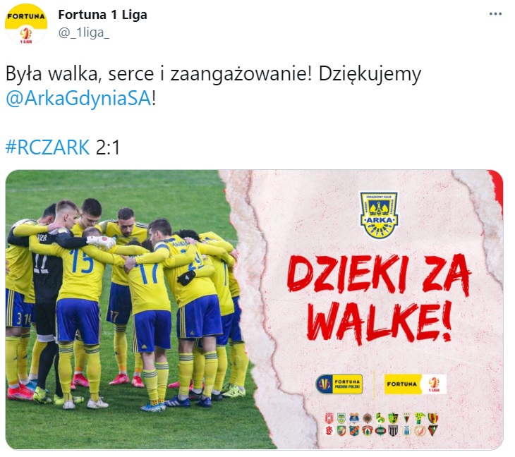 Niestety, nie tym razem - można by było powiedzieć po finałowym spotkaniu Fortuna Pucharu Polski, w którym Arka mierzyła się z Rakowem Częstochowa. Po emocjonującej końcówce gdynianie przegrali 1:2. To był trzeci finał z udziałem Żółto-Niebieskich w ciągu pięciu ostatnich edycji. Już samo to było spektakularnym sukcesem. Zawodnicy z miasta morza i marzeń nie należeli również do faworytów w decydującej rozgrywce. Raków to przecież wicelider polskiej Ekstraklasy, który już zapewnił sobie medal mistrzostw Polski. Każdy inny wynik niż triumf częstochowian byłby niespodzianką. Dobre złego początki Gdynianie znakomicie taktycznie podeszli do spotkania. Trener Dariusz Marzec miał pomysł, który jego piłkarze zrealizowali w stu procentach. Zneutralizowanie ofensywnych atutów Rakowa Częstochowa, a z czasem próby własnych sił pod polem karnym przeciwnika.Jeden z takich ataków przyniósł upragnione prowadzenie. Strzelec Mateusz Żebrowski, choć ewidentnie chciał podawać, trafił w piłkę tak, że ta idealnie zmieściła się w bramce.Do napisania kolejnej niebywałej historii zabrakło jednak dziesięciu minut. Raków wyrównał, a dwie minuty przed końcem regulaminowego czasu gry wyszedł na prowadzenie 2:1. Ponownie dumni! Postawa Żółto-Niebieskich wymaga jednak podziękowań. Mało kto spodziewał się, że Arka będzie aż tak trudnym oponentem dla zdecydowanego faworyta. Tymczasem gdynianie po raz kolejny pokazali, że ich obecność w kolejnym finale nie była przypadkowa. - Brawa dla pokonanych, bo ta strategia, taktyka i pomysł sprawiły Rakowowi niemało problemów - podsumował spotkanie komentujący finał Bożydar Iwanow. Opublikowano: 02.05.2021 18:11 Autor: Dawid Kowalski (d.kowalski@gdynia.pl) Zmodyfikowano: 04.05.2021 10:09 Zmodyfikował: Redakcja portalu Gdynia.pl