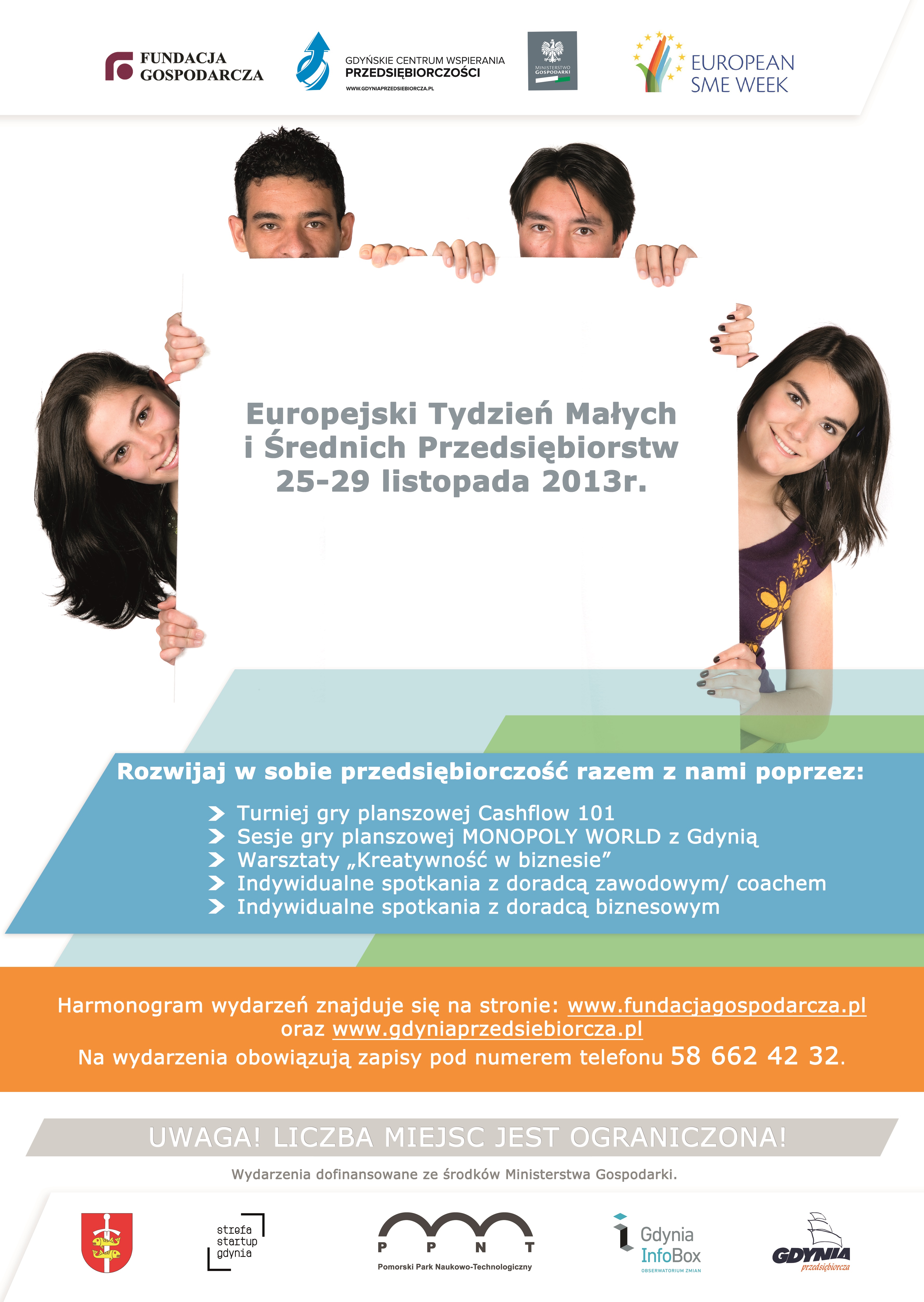 Fundacja Gospodarcza wraz z Gdyńskim Centrum Wspierania Przedsiębiorczości organizuje w Gdyni w dniach 25 – 29 listopada 2013 r. Europejski Tydzień Małych i Średnich Przedsiębiorstw. Celem wydarzenia jest rozpowszechnianie informacji na temat wsparcia, jakie Unia Europejska oraz organy administracji szczebla krajowego, regionalnego i lokalnego mogą zaoferować mikroprzedsiębiorstwom oraz małym i średnim firmom.W trakcie Europejskiego Tygodnia Małych i Średnich Przedsiębiorstw w Gdyni organizowanych będzie szereg różnorodnych działań dedykowanych mikro, małym i średnim przedsiębiorcom z Gdyni zainteresowanym rozwojem swojej firmy, a także osobom fizycznym, pragnącym wzmocnić swój potencjał przedsiębiorczy, aby w przyszłości efektywnie zarządzać własną firmą. W wydarzeniach mogą również wziąć udział uczniowie i studenci gdyńskich szkół, którzy są zainteresowani rozwijaniem w sobie postaw przedsiębiorczych. Każdego dnia wydarzenia będą organizowane w innym miejscu: Fundacji Gospodarczej, Gdyńskim Centrum Wspierania Przedsiębiorczości, InfoBoxie oraz Pomorskim Parku Naukowo – Technologicznym. Szczegółowy harmonogram wydarzeń znajduje się na stronach internetowych www.fundacjagospodarcza.pl oraz www.gdyniaprzedsiebiorcza.pl. Liczba miejsc ograniczona. Na wydarzenia obowiązują zapisy pod numerem telefonu 58 662 42 32.W ramach Tygodnia zaplanowano przeprowadzenie turniejów gry Cashflow 101, sesje gry Monopoly z Gdynią, warsztaty z kreatywności, coaching biznesowy, doradztwo biznesowe oraz zawodowe. To edukacyjna gra planszowa zaprojektowana tak, aby umożliwić uczestnikom poznanie tematyki związanej z rachunkowością i finansami. Uczy podstaw inwestowania w akcje, biznes i nieruchomości, umieszczając gracza w interaktywnym środowisku pozwalającym na eksperymentowanie z własną strategią. Każdego dnia odbywać się będą dwa moduły gry (każdy o innej tematyce), a uczestnik, który weźmie udział we wszystkich dziesięciu modułach zyska kompleksową wiedzę z zakresu biznesu, finansów oraz rachunkowości. Uzupełnieniem działań promujących edukację przedsiębiorczą oraz postawy biznesowe będą sesje gry planszowej Monopoly, w której jednym z miast na planszy jest Gdynia. Gra uczy obracania wielkimi pieniędzmi, pokory wobec losu i niezłomności w pokonywaniu trudności, a także doskonale wprowadza graczy w świat zależności rynkowych i podstaw przedsiębiorczości.Kontakt: Ewa Ropela, Fundacja Gospodarcza w Gdyni, tel.: 58 662 42 39.Harmonogram wydarzeń - pobierzPlakat ETMiŚP - pobierz Opublikowano: 21.11.2013 00:00 Autor: Sebastian Drausal, Gdyńskie Centrum Kontaktu (s.drausal@gdynia.pl)