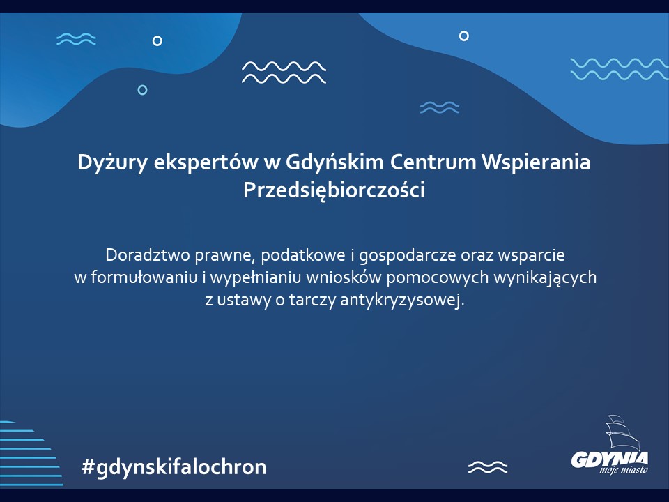 - dyżury ekspertów w Gdyńskim Centrum Wspierania Przedsiębiorczości: doradztwo prawne, podatkowe i gospodarcze oraz wsparcie w formułowaniu i wypełnianiu wniosków pomocowych wynikających z ustawy o tzw. Tarczy Antykryzysowej