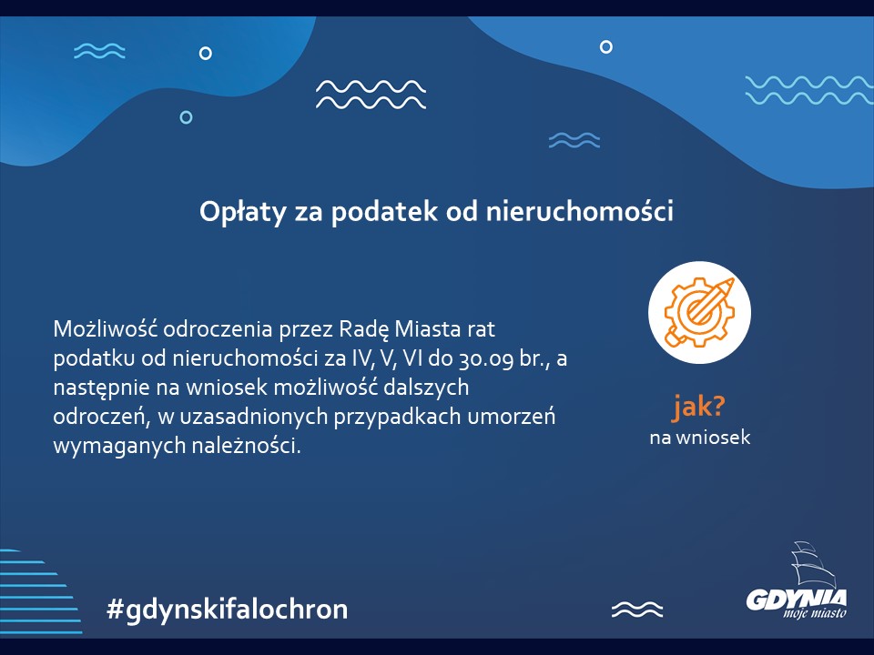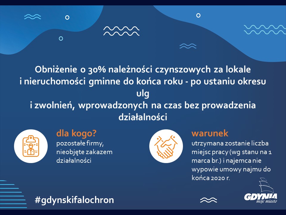 - obniżka czynszu za lokale i nieruchomości gruntowe będące własnością gminy  dla pozostałych dotkniętych skutkami COVID-19 podmiotów o 50% za okres od marca do końca miesiąca, w którym ustanie zakaz. Warunkiem jest utrzymanie liczby miejsc pracy wg stanu z dnia 1 marca 2020 roku i niewypowiadania umowy najmu do końca roku 2020. Wystarczy oświadczenie w formie wniosku. Dotrzymanie warunków obniżki czynszu będzie weryfikowane później.