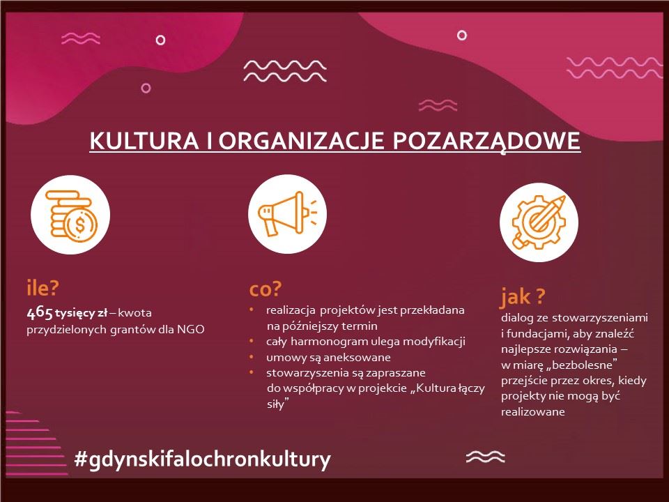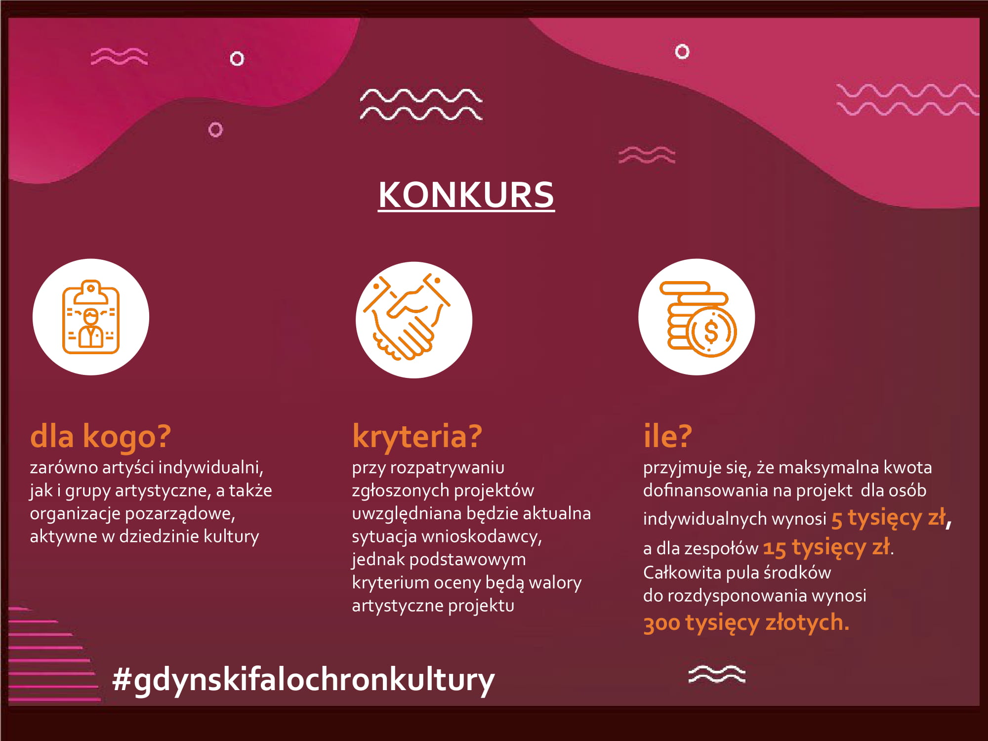 Gdynia od lat jest miastem kultury - tak twierdzą sami gdynianie, podkreślając, że bogata i wysokiej jakości oferta kulturalna jest dla nich ważnym czynnikiem jakości życia. Tak twierdzą media i turyści, patrząc na miasto z zewnątrz i czyniąc z niego cel eskapad służących udziałowi w różnych wydarzeniach: spektaklach, festiwalach, koncertach czy wystawach. Tymczasem konieczny czas „ społecznej kwarantanny” ciężko uderza w życie ludzi i instytucji kultury. Nie mogło być inaczej - Falochron powstał również dla tej dziedziny życia.Sztuka i kultura zazwyczaj wymagają interakcji z odbiorcą, by w ogóle istnieć. Malarze czy poeci mogą tworzyć w samotności, ale i oni na koniec chcą zapoznać świat ze swoim dziełem. Większość artystów potrzebuje tego kontaktu szybciej. Kiedy nie tworzą - również nie zarabiają.- Nie wyobrażam sobie, abyśmy nie stworzyli programu pomocowego dedykowanego kulturze. Nie w Gdyni, w której choćby z czysto ekonomicznego punktu widzenia tzw. przemysł czasu wolnego jest bardzo ważną dziedziną gospodarki. A przecież umiemy spojrzeć szerzej, nie „tylko” na ekonomię. Wiemy doskonale, że z upadkiem niektórych cyklicznych wydarzeń, o organizacjach nie wspominając, nie pogodziliby się nie tylko artyści, ale i wierna publiczność, gdynianie oraz turyści, na których ci pierwsi w normalnych czasach zarabiają. Dlatego zaprojektowaliśmy narzędzia, które dają artystom pracę i wymagają od nich najwyższej staranności, a widzom i odbiorcom dają radość obcowania ze sztuką. Inaczej niż zawsze, ale nie gorzej – mówi prezydent Gdyni, Wojciech Szczurek.- Pora na kolejną odsłonę gdyńskiego Falochronu, który ma za zadanie chronić wszystkich i nie pomijać nikogo. Dziś mówimy o ludziach kultury – tych, którzy ją tworzą, ale i o tych, którzy, jak to w Gdyni, nie wyobrażają sobie życia bez kultury. To program, który składa się z dwóch zasadniczych filarów, choć każdy z nich jest szeroki i zróżnicowany. Dostarczamy rozwiązań, które są właściwe dla każdej z organizacji, tak aby każda z nich miała szansę przetrwać i dalej tworzyć ku radości nas wszystkich. Gdyński Falochron Kultury to program przewidziany na bardzo długo. Jego specyficzna wersja trwa teraz, w czasie kwarantanny, ale nie skończy się przez wiele miesięcy po jej zakończeniu, tak abyśmy nadal mogli twierdzić, że Gdynia to miasto kwitnącej kultury - wyjaśnia Katarzyna Gruszecka-Spychała, wiceprezydent Gdyni ds. gospodarki. KULTURA ŁĄCZY SIŁY Pierwszym z filarów Falochronu Kulturalnego jest uruchomiony już w pierwszych dniach pandemii program „Gdyńska Kultura łączy siły”. Łączy siły, bo grupuje wiele osób i instytucji po to, by dodawać sił poprzez umożliwienie śledzenia online różnych wydarzeń artystycznych. Cele są dwa. Po pierwsze: dać artystom możliwość pracy. Miasto płaci za ich twórczość, co pozwala przetrwać trudny czas bez honorariów. Ludzie sztuki często nie są związani żadnymi umowami o pracę, nie mają żadnego stałego wynagrodzenia, a kiedy kończą się honoraria - kończą się jakiekolwiek przychody. Cel drugi to wsparcie dla gdynian w ciężkim czasie, zapewnienie im możliwości kontaktu z kulturą jak zawsze, nawet wtedy, gdy muszą zostać w domach przez dłużące się tygodnie. KULTURA I ORGANIZACJE POZARZĄDOWE Drugi filar to baza wsparcia dla organizacji pozarządowych, które stają do konkursów miejskich, proponując swoje działania w w sferze kultury, a kiedy je wygrają – zyskują środki na ich realizację. Pandemia przeszkodziła wielu projektom. Niektórych z nich nie da się w ogóle zrealizować z powodu rządowych zakazów. Inne trzeba przełożyć na później i zmodyfikować. Falochron daje urzędnikom narzędzie do tworzenia indywidualnych rozwiązań na miarę w każdej sytuacji. Pozwala modyfikować terminy i inne postanowienia umowne, ratować wydarzenia i ludzi oraz organizacje, które za nimi stoją. KONKURS Konkurs na projekty artystyczne będzie mieć elastyczną formułę, swobodniejszą niż regularne projekty grantowe. Zakładany obszar tematyczny konkursu to szeroko pojęta działalność kulturalna realizowana w naszym mieście. DORADZTWO Wydział Kultury Urzędu Miasta Gdyni oferuje doradztwo prawne w zakresie realizowania projektów kulturalnych w czasie epidemii. Uruchamiono infolinię dla osób i podmiotów ubiegających się o wsparcie: +48 787 469 763. Numer jest dostępny dla osób aplikujących w programie od 7 do 20 kwietnia tj. do ostatniego dnia programu. Pytania można również kierować pod adres mailowy: m.kraszewska@gdynia.pl. Opublikowano: 08.06.2020 08:40 Autor: Redakcja portalu Gdynia.pl (wydz.komsp@gdynia.pl) Zmodyfikowano: 08.06.2020 09:34 Zmodyfikował: Paweł Jałoszewski