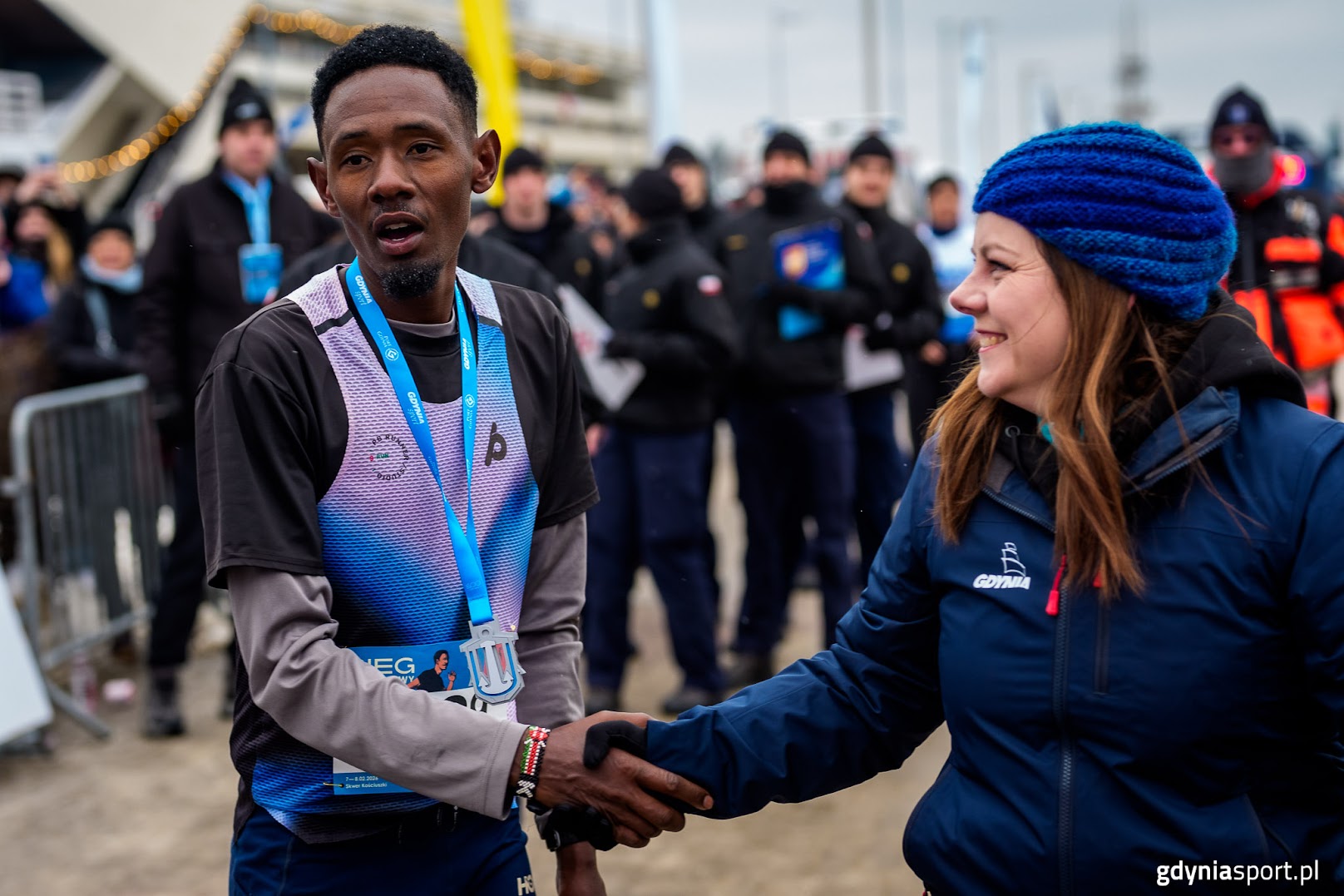 Bieg Urodzinowy z Portem Gdynia stał się nie tylko największym wydarzeniem biegowym w historii miasta, ale również symbolicznym i niezwykle mocnym otwarciem obchodów 100. urodzin Gdyni. Przez dwa dni – 7 i 8 lutego – sport, radość i ogromne emocje połączyły blisko 10 tysięcy zawodniczek i zawodników, którzy wspólnie świętowali jubileusz miasta w najlepszy możliwy sposób: aktywnie i razem. Bieg Urodzinowy z Portem Gdynia pokazał, jak wielką siłą są pasja i energia, które Gdynianie wnoszą w życie swojego miasta. Blisko 10 tysięcy osób wypełniło ulice, a ich entuzjazm stał się najpiękniejszą oprawą tego jubileuszowego wydarzenia. Setne urodziny Gdyni to czas refleksji nad jej historią jako miasta narodzonego z morza, wizji i determinacji ludzi, którzy je budowali. To także święto współczesnej Gdyni – przestrzeni pełnej życia, dynamizmu i inspiracji, która nieustannie zachwyca mieszkańców i gości. Dlatego z dumą świętujemy dziś razem, bo Gdynia zawsze była i pozostaje naszym wspólnym dziełem – podkreśla Aleksandra Kosiorek, prezydent Gdyni. Od lewej: Paweł Brutel, dyrektor Gdyńskiego Centrum Sportu, Teresa Bysewska, przewodnicząca Komisji Sportu, Turystyki i Rekreacji Rady Miasta, Aleksandra Kosiorek, prezydent Gdyni, Piotr Gorzeński, Prezes Zarządu Morskiego Portu Gdynia S.A., Tadeusz Szemiot, przewodniczący Rady Miasta Gdyni, Mariusz Bzdęga, dyrektor zarządzający ds. kultury i aktywności mieszkańców (fot. Dawid Linkowski)Impreza objęła pełne spektrum biegowych emocji – od pierwszych, niepewnych kroków najmłodszych uczestników, po zaciętą rywalizację elity na atestowanej trasie biegu głównego. Cieszymy się, że tak wiele osób w różnym wieku – od maluchów po seniorów – wybrało w tych dniach sport jako sposób wspólnego celebrowania wyjątkowych, setnych urodzin naszego miasta. Ten jubileuszowy start ma szczególną symbolikę – pokazuje, że Gdynia od stu lat rozwija się dzięki energii swoich mieszkańców i dziś nadal inspiruje do aktywnego spędzania czasu. Dziękuję wszystkim za stworzenie niezwykłej atmosfery Biegu Urodzinowego z Portem Gdynia i zapraszam do udziału w kolejnych miejskich wydarzeniach – zachęca Tadeusz Szemiot, przewodniczący Rady Miasta Gdyni. Dzień pierwszy – radość, debiuty i sportowe marzenia Sobotnie zmagania rozpoczęły się punktualnie o godzinie 10:00 Biegiem 1926 oraz marszem Nordic Walking na odcinku 1926 metrów. Ten symboliczny dystans, nawiązujący do roku nadania Gdyni praw miejskich, stał się pięknym mostem łączącym historię miasta z jego sportową teraźniejszością. Linię mety jako pierwsi przekroczyli Andrei Bahdanau i Zuzanna Głombiowska.Andrei Bahdanau przekracza linię mety jako pierwszy w Biegu 1926 (fot. Jacek Klejment) Biegać w Gdyni, w roku jej setnych urodzin, to coś absolutnie wyjątkowego – powiedziała po przekroczeniu mety jedna z zawodniczek. Chwilę później trasy opanowały dzieci i młodzież – od Biegu Juniora, przez kolejne kategorie młodzików i starszaków, aż po rozczulający i pełen uśmiechów Bieg Malucha dla najmłodszych roczników. Świetna organizacja, fantastyczna atmosfera i prawdziwe sportowe emocje – dzieci czuły się bardzo ważne – mówi tata młodego biegacza, z dumą prezentując zdobyty medal. Uśmiechnięta zawodniczka na trasie Biegu Urodzinowego z Portem Gdynia (fot. Karol Makurat)Każdy start był osobną historią – pierwszym numerem startowym, pierwszym medalem, pierwszym przekroczeniem linii mety – dla wielu młodych uczestników był to pierwszy kontakt z prawdziwą imprezą biegową, z dopingiem, spikerem i oklaskami kibiców, które niosły ich do mety mimo zimna i mrozu. Dzień drugi – rekordy, walka i niezapomniane emocje Niedziela należała do dorosłych. O godzinie 10:00 wystartował Bieg Główny na dystansie 10 km, a wraz z nim sztafety i marsz Nordic Walking. Nowa trasa, posiadająca atest PZLA, poprowadziła zawodników przez najważniejsze i najbardziej historyczne ulice Gdyni. Start i meta zlokalizowane były na Alei Jana Pawła II, a finiszowe kilometry przebiegały Bulwarem Nadmorskim, gdzie zmęczenie mieszało się z euforią, a każdy krok przybliżał do mety.Start Biegu Urodzinowego z Portem Gdynia (fot. Dawid Linkowski) W elicie biegu rywalizowali m.in.: Maciej Megier, zwycięzca urodzinowych zawodów z ubiegłego roku, Adam Głogowski – medalista mistrzostw Polski w biegach długodystansowych, Andrzej Rogiewicz – wielokrotny zwycięzca gdyńskich biegów ulicznych, Grzegorz Kujawski – jeden z najszybszych polskich mastersów oraz Szymon Skalski. Na linii startu stanęła również Julia Koralewska – jedna z najmocniejszych biegaczek młodego pokolenia, Olimpia Breza – multimedalistka Mistrzostw Polski w biegach długich, a także Katarzyna Pobłocka-Głogowska – utytułowana zawodniczka z Pomorza, regularnie stająca na podium biegów masowych.Uczestniczki na trasie Biegu Urodzinowego z Portem Gdynia (fot. Karol Makurat)Międzynarodowy charakter rywalizacji podkreślili zawodnicy z Afryki: Jebet Valentine, Kipkosgei Kirwa Novestus, Mbatha Ruth Nundu oraz Waweru John Chege. Na trasie od pierwszych metrów na prowadzenie wyszedł Waweru John Chege, mijając półmetek w czasie 14:51. Za nim biegła kilkuosobowa grupa zawodników walcząc nie tylko między sobą, ale również z mroźnymi warunkami. Publiczność mogła obserwować sport na najwyższym poziomie – dynamiczny, taktyczny i pełen napięcia aż do ostatnich kilometrów.Aleksandra Kosiorek, prezydent Gdyni gratuluje Waweru Johnowi Chegemu wygranej w Biegu Urodzinowym z Portem Gdynia (fot. Dawid Linkowski) Po samotnej ucieczce w Biegu Urodzinowym z Portem Gdynia triumfował Kenijczyk Waweru John Chege, pokonując trasę w czasie 30 minut i 23 sekundy. W rywalizacji kobiet zwyciężyła Olimpia Breza, finiszując z wynikiem 33 minuty i 24 sekundy. Podium uzupełnili My