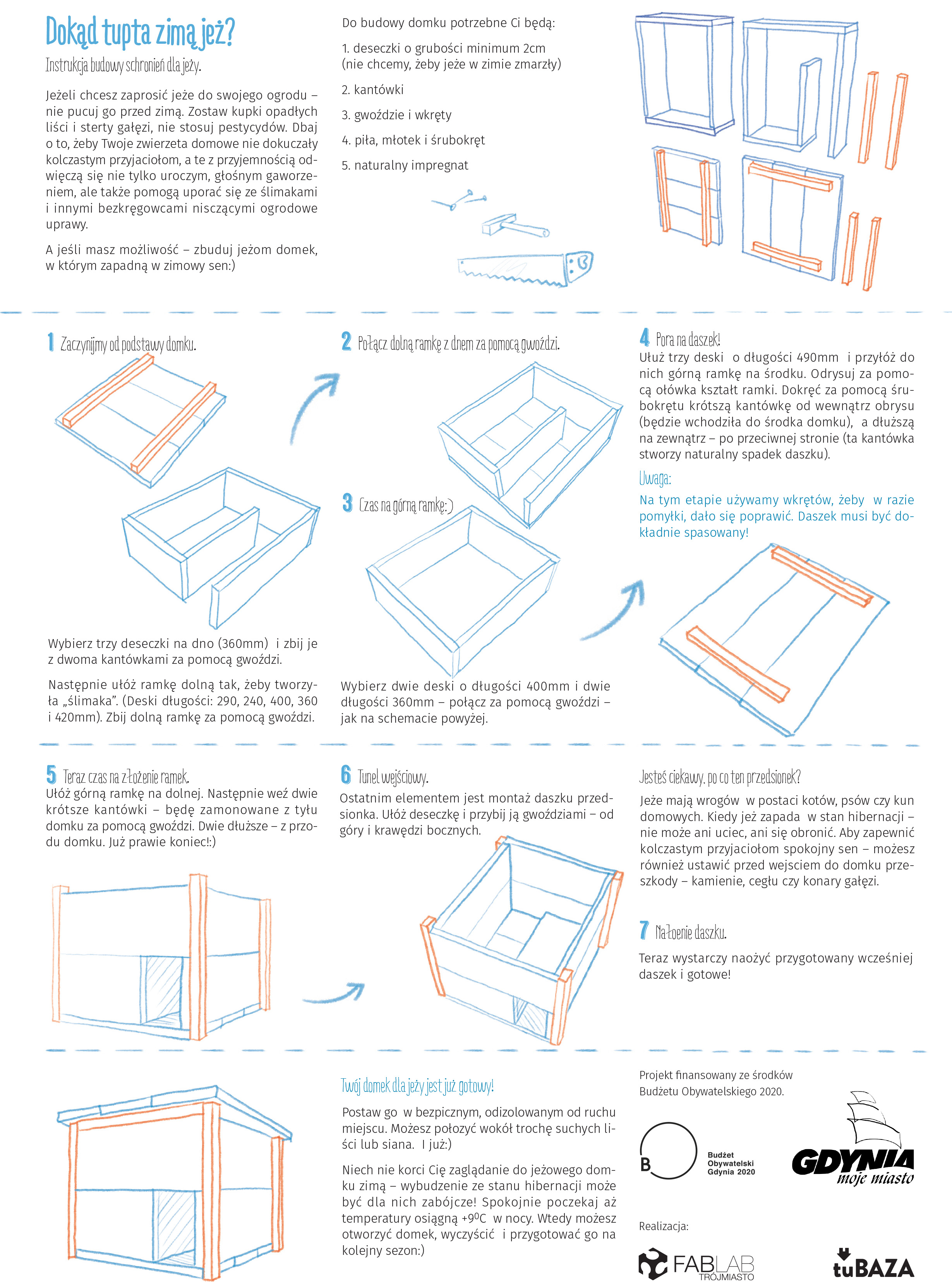 Gdy drzewa zrzucają liście, jeże szykują sobie schronienie, w którym będą mogły bezpiecznie przezimować. Często pomagają im w tym ludzie, np. stawiając specjalne domki. Tego, jak przygotować taką konstrukcję, nauczą się mieszkańcy Karwin i Działek Leśnych. Wszystko w ramach projektu sfinansowanego z ubiegłorocznego Budżetu Obywatelskiego. Cenne informacje, które zostaną zaprezentowane na szkoleniu, będą później zamieszczone na stronie Wydziału Środowiska Urzędu Miasta Gdyni. Kolorowa jesień to dla nas piękny czas zachwytu nad przyrodą. Jednak dla jeży to niezwykle pracowity i ważny czas przygotowań do snu zimowego. Zwierzęta te muszą w tym okresie znaleźć odpowiednie schronienie i odpowiednio uszczelnić je przed nadchodzącymi mrozami. Niestety – bez tego nie będą w stanie dożyć wiosny.Możemy jednak im pomóc w tych staraniach. Niedawno na naszej stronie internetowej informowaliśmy o inicjatywie, jaką podjęli uczniowie Szkoły Podstawowej nr 48 w Gdyni. W ramach akcji „Jeż w Wielkim Mieście. Usyp kopczyk” zachęcają oni do pozostawiania niedużych stert liści i chrustu, które jeże wykorzystają jako materiał do budowy zimowego schronienia.W pomoc jeżom zaangażowali się też mieszkańcy Działek Leśnych i Karwin. W ramach Budżetu Obywatelskiego w 2020 roku w głosowaniu wybrali oni projekty warsztatów z budowania specjalnych domków dla jeży. Teraz inicjatywa wcielana jest w życie, a zajęcia pn. „Dokąd zimą tupta jeż?” odbędą się już 9, 10 i 13 listopada.Warsztaty budowy domków dla jeży organizowane są przez Fab Lab Trójmiasto. Za wkład merytoryczny oraz projekty domków odpowiadają specjaliści zajmującymi się ochroną jeży w Pomorskim Ośrodku Rehabilitacji Dzikich Zwierząt „Ostoja” oraz Polskie Stowarzyszenie Ochrony Jeży.Zajęcia z budowania zimowych domostw dla jeży odbędą się łącznie w czterech terminach: 9 listopada – godz. 15:30 przy Szkole Podstawowej nr 42, 10 listopada – godz. 15:30 przy Szkole Podstawowej nr 46, 13 listopada – godz. 10:00 i 13:00 przy Gdyńskiej Społecznej Szkole Podstawowej. Domki zostaną wykonane w całości z naturalnych materiałów, łącznie z impregnacją. Zbudowane zostaną z nieklejonego drewna. Popularna sklejka nie ulega biodegradacji, co dyskwalifikuje ją w przypadku przygotowywania tego typu konstrukcji. Uczestnicy warsztatów otrzymają instrukcję budowy domku oraz sposób późniejszego dbania o niego, a także podstawowe informacje dotyczące ochrony jeży, alternatywne rozwiązania schronień i naturalne miejsca przyjazne jeżom. Podczas zajęć dowiedzą się także jak postępować w razie znalezienia chorego zwierzęcia. [AKTUALIZACJA] Wynikiem przeprowadzownych warsztatów jest instrukcja budowy domku dla jeży. Można ją obejrzeć poniżej lub pobrać w formie załącznika dostępnego na dole artykułu. Galeria zdjęć Pobierz galerię Listopadowe warsztaty z budowania schronień dla jeży // fot. Izabela Pydo Pobierz zdjęcie Listopadowe warsztaty z budowania schronień dla jeży // fot. Izabela Pydo Pobierz zdjęcie Listopadowe warsztaty z budowania schronień dla jeży // fot. Izabela Pydo Pobierz zdjęcie Warunki pobierania Wszelkie prawa do zdjęć lub grafik prezentowanych w ramach portalu, należą do Prowadzącego portal lub do podmiotów z nim współpracujących i podlegają ochronie prawnej. Prowadzący portal zezwala na kopiowanie i przedstawianie utworów jedynie w celach niekomercyjnych oraz pod warunkiem zachowania go w oryginalnej postaci i zachowaniem kontekstu tematu, do którego zostało wykorzystaneprzez redakcję gdynia.pl. Opublikowane materiały powinny zawsze zawierać źródło, czyli adres strony www.gdynia.pl. Na publikowanie utworów w innych celach wymagana jest zgoda właściciela strony czyli Prowadzącego portal. Do pobrania Instrukcja budowy schronień dla jeży pdf846kb Opublikowano: 27.10.2021 12:28 Autor: Paweł Kukla (p.kukla@gdynia.pl) Zmodyfikowano: 02.12.2021 08:27 Zmodyfikował: Paweł Kukla