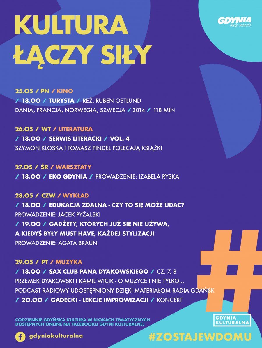 Macie ochotę wziąć udział w ekowarsztatach, posłuchać wykładów o modzie i zdalnej edukacji lub obejrzeć ciekawy film? I to wszystko nie wychodząc z domu? Sprawdźcie, jakie wydarzenia online polecają gdyńskie instytucje w tym tygodniu w ramach cyklu Kultura Łączy Siły. Każdy z pewnością znajdzie coś dla siebie.Wszystkie wymienione wydarzenia są dostępne online na Facebooku Gdynia Kulturalna. 25 maja – Poniedziałek - Kino Godz. 18.00 - „Turysta”, reż. Ruben OstlundDania/Francja/Norwegia/Szwecja, 2014, 118 min. Tomas i Ebba, zamożne szwedzkie małżeństwo, jadą z dwójką dzieci w Alpy Francuskie na kilka dni na narty. Chcą spędzić sielankowe krótkie zimowe wakacje w jednym z luksusowych hoteli. Pogoda dopisuje, świeci słońce, a ośnieżone stoki narciarskie wyglądają imponująco. Gdy wszyscy jedzą lunch na tarasie restauracji, nagle prosto z gór schodzi na nich lawina. Ebba instynktownie chroni swoje dzieci, Tomas natomiast zabiera telefon i ucieka. Nikomu nic się nie stało, ale po czymś takim trudno żyć tak, jak kiedyś. Tomas i Ebba starają się ocalić związek, ale najpierw muszą przemyśleć, kim są i jakie role pełnią. Sytuacja się komplikuje, gdy na jaw wychodzą skrywane dotąd tajemnice. Czy Tomas i Ebba będą na tyle odważni, aby pokonać własne słabości i uratować ich małżeństwo? Turysta to inteligentna intymna tragikomedia psychologiczna, przypominająca „Rzeź” Romana Polańskiego lub „Lśnienie” Stanleya Kubricka. Oparty na zaczerpniętej z biografii reżysera historii film nagrodzony Nagrodą Un Certain Regard na festiwalu w Cannes w 2014 roku i zgłoszony jako szwedzki kandydat do Oscara, jest też ciekawym przykładem rodzinnego dramatu. Jest nie tylko wnikliwą i dającą do myślenia wiwisekcją ról, jakie współczesne społeczeństwo nakłada na kobietę i mężczyznę będących razem w związku, lecz również ciekawą analizą sytuacji kryzysowych, jakie mogą się w nim pojawić. To również interesująca filmowa obserwacja mechanizmów działania pierwotnych ludzkich instynktów, a także ich wpływu na reakcje i zachowanie ludzi. Wykorzystujący najnowocześniejsze efekty specjalne film zachwyca inteligentną tragifarsową stylistyką, jakością i perfekcjonizmem zdjęć, zwłaszcza sceny zejścia lawiny, uznaną za najlepszą tego typu scenę w historii kina i naturalistycznej gry aktorskiej, w szczególności Lisy Loven Kongsli, Johannesa Kuhnke i Kristofera Hivju. „Indiewire” podało 5 powodów, dla których „Turysta” powinien być nominowany do Oscara: to film dyskursywny, o którym widz długo będzie rozmawiał po wyjściu z kina, jest niesamowicie zabawny, główni bohaterowie to para małżeńska, która z trudem znosi siebie nawzajem, film momentami przypomina Lśnienie, a Ruben Östlund jest wyniesiony na piedestał przez wielu naszych ukochanych europejskich twórców. Uwaga! Produkcja będzie dostępna tylko 25 maja na Facebooku Gdyni Kulturalnej. 26 maja – Wtorek - Literatura Godz. 18.00 - Serwis literacki vol.4 Szymon Kloska i Tomasz Pindel polecają książki Szymon Kloska – krytyk i aktywista literacki. O książkach opowiada w radio i telewizji, czasami pisuje w prasie drukowanej i innej. Prowadził liczne programy telewizyjne i audycje o literaturze, m.in.: „WOK – Wszystko o Kulturze”, „Książki na Lato” i „Myślnik”. Od przeszło dekady współprowadzi audycję „Piątka z literatury” w RMF Classic. Wieloletni pracownik Instytut Książki, od stycznia 2017 roku związany z programem Kraków Miasto Literatury UNESCO. Współtwórca Festiwalu Literatury dla Dzieci. Jest rzecznikiem Nagrody Literackiej Gdynia i kuratorem Festiwalu Miasto Słowa, który towarzyszy Nagrodzie. Tomasz Pindel – tłumacz, wykładowca i znawca literatury hiszpańskojęzycznej, autor książek: „Mario Vargas Llosa. Biografia” (2014), „Za horyzont. Polaków latynoamerykańskie przygody (2018), powieści Czy to się nagrywa?” (2011) oraz scenariusza do komiksu „W głowie tłumaczy” (2019). Od ponad dekady współprowadzi „Piątkę z literatury” w RMF Classic. 27 maja – Środa - Warsztaty Godz. 18.00 - Eko GdyniaProwadzenie: Izabela Ryska Izabela Ryska - absolwentka kierunku Biotechnologia leków Politechniki Gdańskiej, Wydział Chemiczny (2015). Ścieżkę zawodową związała z naturalnymi kosmetykami. Uczy jak tworzyć kosmetyki oraz pielęgnować skórę w sposób naturalny. Od listopada 2015 r. pracowała nad autorskim składem kosmetyku. Stworzyła projekt świecy do masażu. Świeca podczas topienia zamienia się w olejek do masażu o temperaturze zbliżonej do temperatury ludzkiego ciała. Pomysł został doceniony przez miasto Gdynię, jest laureatką Konkursu Gdyński Biznesplan 2017. Izabela prowadzi szkolenia z naturalnych kosmetyków w Wyższej Szkole Bankowej w Gdańsku, w Szkołach Żak, TEB oraz w Studium. 28 maja – Czwartek - Wykład Godz. 18.00 - Edukacja zdalna - czy to się może udać?Prowadzenie: prof. Jacek Pyżalski Godz. 19.00 - Gadżety, których już się nie używa, a kiedyś były MUST HAVE, każdej stylizacji.Prowadzenie: Agata Braun Ubranie to kod, który dzięki nabytym umiejętnościom społecznym jesteśmy w stanie interpretować. Istnieją jednak takie części garderoby, które znamy z widzenia i z wielu powodów nie potrafimy lub boimy się z nimi zaprzyjaźnić. Czym były męskie getry, co wolno włożyć do butonierki i dlaczego wciąż zapominamy o rękawiczkach - na te i inne pytania spróbujemy odpowiedzieć podczas dzisiejszego spotkania z modą XX wieku i nie tylko. 29 maja - Piątek - Muzyka Godz. 18.00 - Sax Club Pana Dyakowskiego cz. 3. i 4.Przemek Dyakowski i Kamil Wicik - o muzyce i nie tylko… Podcast radiowy udostępniony dzięki materiałom Radia Gdańsk. Godz.20.00 - Gadecki - Lekcje improwizacji - koncert LIVE!Klub Desdemona - KONCERT NIE ODBĘDZIE SIĘ -----------------------------------------