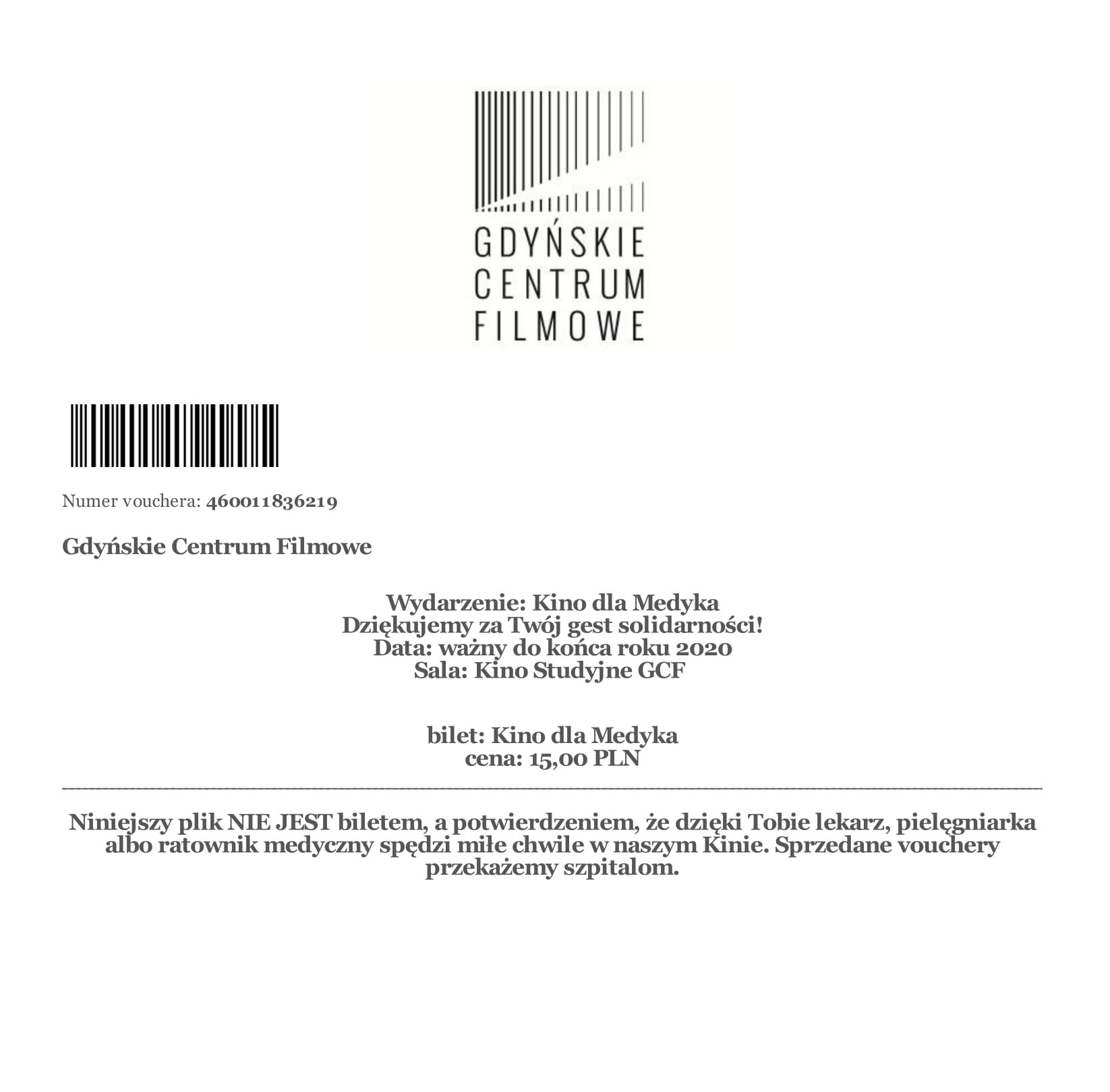 Można im bić brawo albo śpiewać na balkonach. Szyć maseczki ochronne i dostarczać posiłki. Wdzięczność wobec osób, które podczas pandemii narażają się dla nas wszystkich, można wyrazić na wiele sposobów. Na przykład zapewniając im miłe chwile relaksu wtedy, kiedy życie wróci już do normalności, a kina zostaną ponownie otwarte. Kup „zawieszony” bilet dla Medyka, w cenie 15 złotych, do Kina Studyjnego Gdyńskiego Centrum Filmowego. Skorzystają z niego lekarz, pielęgniarka albo ratownik medyczny. Po wznowieniu działalności przez Kino Studyjne GCF sprzedana pula „zawieszonych” biletów zostanie podzielona i przekazana szpitalom i jednostkom ochrony zdrowia. Bilety w ramach akcji „Kino dla Medyka” dostępne są online na stronie www.gcf.org.pl w zakładce „Kino Studyjne". Takie potwierdzenie otrzymuje mejlem ktoś, kto zdecyduje się kupić bilet do Kina Studyjnego GCF do wykorzystania przez lekarza, pielęgniarkę czy ratownika medycznego. Biorąc udział w akcji nie tylko zrobisz dobry uczynek, poprawiając nastrój komuś, kto dziś dzielnie stawia czoła epidemii dla dobra nas wszystkich, ale także pomożesz swojemu ulubionemu kinu przetrwać ten trudny czas. Galeria zdjęć Pobierz galerię Kup bilet do kina dla medyka // mat.prasowy Gdyńskiego Centrum Filmowego Pobierz zdjęcie Warunki pobierania Wszelkie prawa do zdjęć lub grafik prezentowanych w ramach portalu, należą do Prowadzącego portal lub do podmiotów z nim współpracujących i podlegają ochronie prawnej. Prowadzący portal zezwala na kopiowanie i przedstawianie utworów jedynie w celach niekomercyjnych oraz pod warunkiem zachowania go w oryginalnej postaci i zachowaniem kontekstu tematu, do którego zostało wykorzystaneprzez redakcję gdynia.pl. Opublikowane materiały powinny zawsze zawierać źródło, czyli adres strony www.gdynia.pl. Na publikowanie utworów w innych celach wymagana jest zgoda właściciela strony czyli Prowadzącego portal. Opublikowano: 28.04.2020 12:45 Autor: Marta Jaszczerska-Zawadzka (m.jaszczerska@gdynia.pl) Zmodyfikowano: 29.04.2020 08:56 Zmodyfikował: Marta Jaszczerska-Zawadzka
