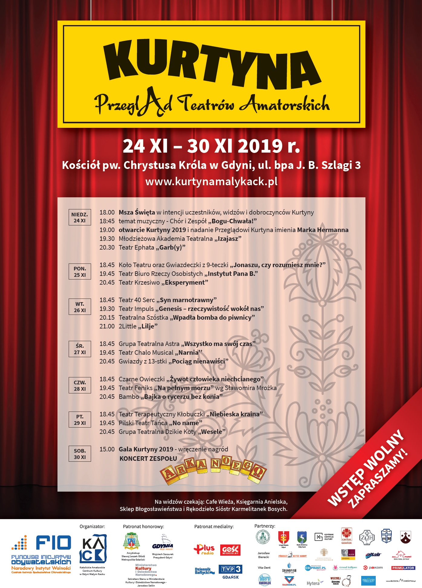 Po kilkunastu zróżnicowanych spektaklach, w najbliższą sobotę poznamy nazwę grupy teatralnej, która zostanie laureatem tegorocznej „Kurtyny”. Jury i widzowie obejrzeli już większość finalistów. Niespodzianką na zakończenie Przeglądu Teatrów Amatorskich będzie koncert Arki Noego.Jeszcze trzy piątkowe spektakle pozostały do pełnego przeglądu sztuk, które przygotowali finaliści tegorocznego Przeglądu Teatrów Amatorskich „Kurtyna”. W Małym Kacku od poprzedniej niedzieli, gdy zainaugurowano przegląd, wystąpiło już kilkanaście amatorskich grup, które zjechały do Gdyni z różnych miejsc w Polsce. Do ich podziwiania na żywo zapraszali m.in. prezydent Gdyni Wojciech Szczurek i wiceprezydent ds. gospodarki, Katarzyna Gruszecka-Spychała. Łącznie w małokackim kościele pw. Chrystusa Króla prezentuje się przez tydzień 28 grup, poddając się pod ocenę konkursowego jury. Każdego dnia od 18:45 publiczności prezentuje się kilka z nich. Przegląd bliski finiszu Ostatni teatralni amatorzy, którzy pokażą się w piątek, 29 listopada to Teatr Terapeutyczny Kłobuczki z „Niebieską krainą”, Pilski Teatr Tańca z „No name” oraz Grupa Teatralna Dzikie Koty ze sztuką „Wesele”. Relacje z poszczególnych występów wraz ze zdjęciami można śledzić na stronie internetowej wydarzenia. Gala już w sobotę Podsumowanie nastąpi już w sobotę, 30 listopada – punktualnie o 15:00 w kościele rusza gala finałowa tegorocznego przeglądu, podczas której poznamy laureatów „Złotej Kurtyny” o wartości 3000 złotych oraz dwóch nagród specjalnych po 1000 złotych. Nagrody ufundował Prezydent Miasta Gdyni, który objął też Przegląd Teatrów Amatorskich „Kurtyna” swoim honorowym patronatem.Emocje związane z nagrodami to nie wszystko – galę zakończy występ znanego zespołu Arka Noego, a wstęp na sobotnie wydarzenia jest bezpłatny, tak samo jak przez cały tydzień trwania przeglądu. Więcej niż amatorski teatr Warto podkreślić, że całe wydarzenie ma charakter integracyjny i na tych samych prawach i zasadach podczas „Kurtyny” rywalizują teatry, które tworzą aktorzy z niepełnosprawnościami, jak i grupy składające się z osób w pełni sprawnych. W swoich sztukach poruszają tematy ważne, ponadczasowe, często dotykające sfery duchowej. Miejscem spotkań i główną sceną teatralną jest wspomniany wcześniej budynek kościoła Chrystusa Króla na Małym Kacku. Organizatorem jest Stowarzyszenie Katolickie Amatorskie Centrum Kultury w Gdyni Małym Kacku. Projekt dofinansowany ze środków Programu Fundusz Inicjatyw Obywatelskich 2018. Galeria zdjęć Pobierz galerię Spektakle w ramach Przeglądu Teatrów Amatorskich „Kurtyna”, fot. Piotr Kwiatkowski / kurtynamalykack.pl Pobierz zdjęcie Spektakle w ramach Przeglądu Teatrów Amatorskich „Kurtyna”, fot. Piotr Kwiatkowski / kurtynamalykack.pl Pobierz zdjęcie Spektakle w ramach Przeglądu Teatrów Amatorskich „Kurtyna”, fot. Piotr Kwiatkowski / kurtynamalykack.pl Pobierz zdjęcie Spektakle w ramach Przeglądu Teatrów Amatorskich „Kurtyna”, fot. Piotr Kwiatkowski / kurtynamalykack.pl Pobierz zdjęcie Spektakle w ramach Przeglądu Teatrów Amatorskich „Kurtyna”, fot. Piotr Kwiatkowski / kurtynamalykack.pl Pobierz zdjęcie Spektakle w ramach Przeglądu Teatrów Amatorskich „Kurtyna”, fot. Piotr Kwiatkowski / kurtynamalykack.pl Pobierz zdjęcie Spektakle w ramach Przeglądu Teatrów Amatorskich „Kurtyna”, fot. Piotr Kwiatkowski / kurtynamalykack.pl Pobierz zdjęcie Spektakle w ramach Przeglądu Teatrów Amatorskich „Kurtyna”, fot. Piotr Kwiatkowski / kurtynamalykack.pl Pobierz zdjęcie Spektakle w ramach Przeglądu Teatrów Amatorskich „Kurtyna”, fot. Piotr Kwiatkowski / kurtynamalykack.pl Pobierz zdjęcie Spektakle w ramach Przeglądu Teatrów Amatorskich „Kurtyna”, fot. Piotr Kwiatkowski / kurtynamalykack.pl Pobierz zdjęcie Spektakle w ramach Przeglądu Teatrów Amatorskich „Kurtyna”, fot. Piotr Kwiatkowski / kurtynamalykack.pl Pobierz zdjęcie Spektakle w ramach Przeglądu Teatrów Amatorskich „Kurtyna”, fot. Piotr Kwiatkowski / kurtynamalykack.pl Pobierz zdjęcie Spektakle w ramach Przeglądu Teatrów Amatorskich „Kurtyna”, fot. Piotr Kwiatkowski / kurtynamalykack.pl Pobierz zdjęcie Spektakle w ramach Przeglądu Teatrów Amatorskich „Kurtyna”, fot. Piotr Kwiatkowski / kurtynamalykack.pl Pobierz zdjęcie Spektakle w ramach Przeglądu Teatrów Amatorskich „Kurtyna”, fot. Piotr Kwiatkowski / kurtynamalykack.pl Pobierz zdjęcie Spektakle w ramach Przeglądu Teatrów Amatorskich „Kurtyna”, fot. Piotr Kwiatkowski / kurtynamalykack.pl Pobierz zdjęcie Spektakle w ramach Przeglądu Teatrów Amatorskich „Kurtyna”, fot. Piotr Kwiatkowski / kurtynamalykack.pl Pobierz zdjęcie Spektakle w ramach Przeglądu Teatrów Amatorskich „Kurtyna”, fot. Piotr Kwiatkowski / kurtynamalykack.pl Pobierz zdjęcie Spektakle w ramach Przeglądu Teatrów Amatorskich „Kurtyna”, fot. Piotr Kwiatkowski / kurtynamalykack.pl Pobierz zdjęcie Spektakle w ramach Przeglądu Teatrów Amatorskich „Kurtyna”, fot. Piotr Kwiatkowski / kurtynamalykack.pl Pobierz zdjęcie Spektakle w ramach Przeglądu Teatrów Amatorskich „Kurtyna”, fot. Piotr Kwiatkowski / kurtynamalykack.pl Pobierz zdjęcie Spektakle w ramach Przeglądu Teatrów Amatorskich „Kurtyna”, fot. Piotr Kwiatkowski / kurtynamalykack.pl Pobierz zdjęcie Spektakle w ramach Przeglądu Teatrów Amatorskich „Kurtyna”, fot. Piotr Kwiatkowski / kurtynamalykack.pl Pobierz zdjęcie Spektakle w ramach Przeglądu Teatrów Amatorskich „Kurtyna”, fot. Piotr Kwiatkowski / kurtynamalykack.pl Pobierz zdjęcie Spektakle w ramach Przeglądu Teatrów Amatorskich „Kurtyna”, fot. Piotr Kwiatkowski / kurtynamalykack.pl Pobierz zdjęcie Spektakle w ramach Przeglądu Teatrów Amatorskich „Kurtyna”, fot. Piotr Kwiatkowski / kurtynamalykack.pl Pobierz zdjęcie Spektak
