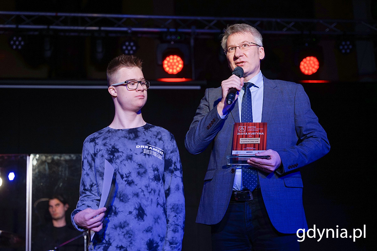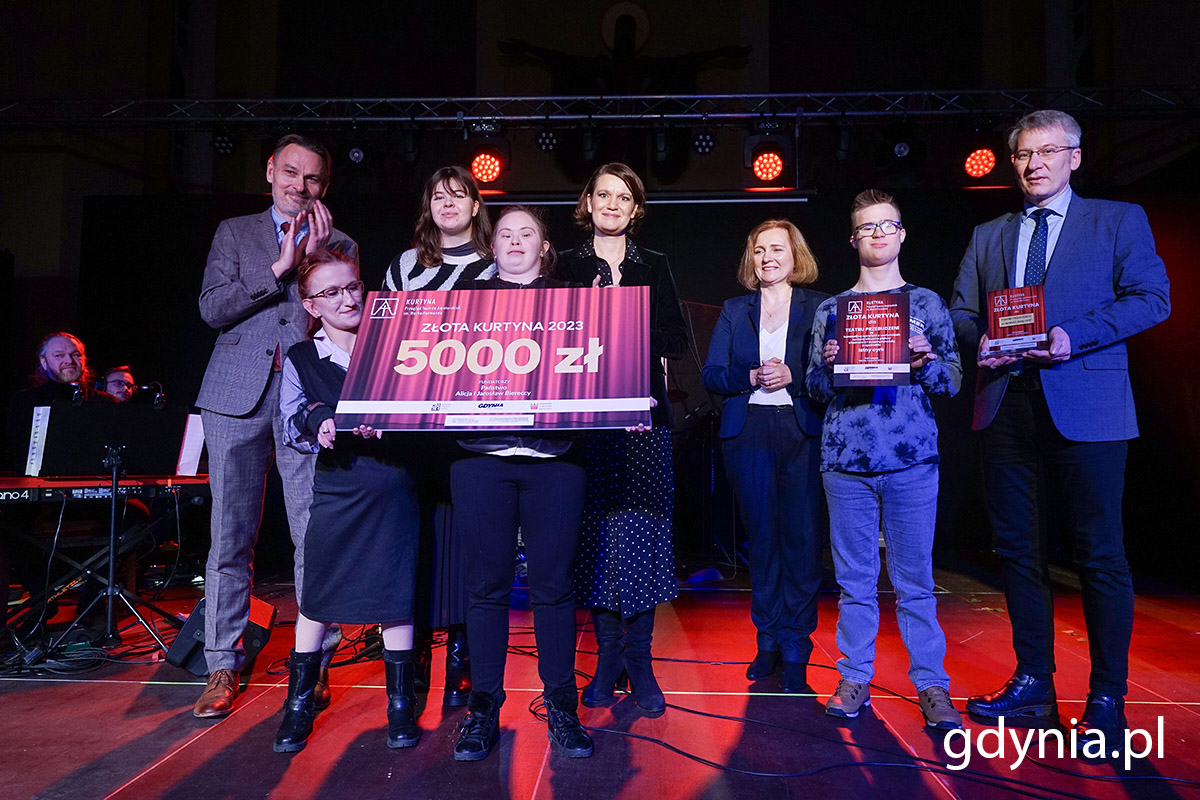 „Istny cyrk” w wykonaniu Grupy „Przebudzeni” z Ostródy nie tylko zachwycił publiczność VIII edycji przeglądu „Kurtyna”, ale również jury. Sztuka, opowiadająca o codzienności osób z niepełnosprawnościami, o przełamywaniu przez nie barier i walce o szczęście, o niezależność, napisana w oparciu o autentyczne przeżycia członków grupy, rozbiła tegoroczny bank „Kurtyny”. VIII edycja „Kurtyny”, czyli Przeglądu Teatrów Amatorskich im. Marka Hermanna w Gdyni Małym Kacku już za nami. Wydarzenie, zorganizowane przez Stowarzyszenie Katolickie Centrum Kultury w Gdyni Małym Kacku, trwało od 26 listopada. Widzowie w tym czasie obejrzeli spektakle szesnastu finalistów. Poziom przedstawień w tym roku był wyjątkowo wysoki. Na to również zwróciła uwagę Katarzyna Gruszecka-Spychała, wiceprezydentka Gdyni ds. gospodarki, członkini jury przeglądu. Finał VIII edycji „Kurtyny” - Przeglądu Teatrów Amatorskich im. Marka Hermanna w Gdyni Małym Kacku. Fot. Mirosław Pieślak - Ta „Kurtyna” była wyjątkowa. Po każdej jestem zachwycona, ale jeszcze po żadnej nie mogłam powiedzieć, że poziom spektakli był aż tak niezmiernie wysoki. Myślę, że również po raz pierwszy mieliśmy do czynienia z tak dużym zróżnicowaniem i to bardzo dobrze wróży temu przeglądowi. On pewnie długo zachowa w nazwie amatorski, bo taka jest przecież jego idea, ale sam przegląd staje się coraz bardziej profesjonalny. Ja jestem niezwykle dumna z tego, że taka impreza ma miejsce w Gdyni i oczywiście cieszę się, że nie tylko my, gdynianie, ją doceniamy, ale także zdobywa bardzo prestiżowe nagrody – powiedziała nam Katarzyna Gruszecka-Spychała. Tegoroczna „Kurtyna” zachwyciła Jak powiedział Jarosław Szydłak, Prezes Stowarzyszenia Katolickie Centrum Kultury w Gdyni Małym Kacku, organizator przeglądu, w tym roku poprzeczka została ustawiona wyjątkowo wysoko. Miało to związek z przyznaniem krótko przed festiwalem nagrody Prezydenta RP „Dla dobra wspólnego”. Finał VIII edycji „Kurtyny” - Przeglądu Teatrów Amatorskich im. Marka Hermanna w Gdyni Małym Kacku. Na zdj. m.in. Katarzyna Gruszecka-Spychała, wiceprezydentka Gdyni ds. gospodarki. Fot. Mirosław Pieślak - Za nami finał VIII „Kurtyny”, niezwykłej, bo była odpowiedzią na poprzeczkę, która została nam tuż przed „Kurtyną” postawiona, kiedy odbieraliśmy nagrodę Prezydenta RP „Dla dobra wspólnego”. Takie nagrody są wyzwaniem, podniesieniem poprzeczki. Tegoroczna „Kurtyna” przez grupy, które zakwalifikowały się do finału, temu zadaniu sprostała – podkreślił Jarosław Szydłak. Finał VIII edycji „Kurtyny” - Przeglądu Teatrów Amatorskich im. Marka Hermanna w Gdyni Małym Kacku. Fot. Mirosław Pieślak Dodał, że to nie był festiwal, w którym po dwóch czy trzech spektaklach można było typować, kto wygra, kto nie. - O wygranej zdecydowały detale. Tegoroczny festiwal był niesamowity pod względem choćby takiej atmosfery relacji międzyludzkich. Wielu przyjaciół odwiedziło Kurtynę, również odwiedził nas prezydent Wojciech Szczurek, który w tygodniu, między obowiązkami, wpadł do nas. Wierzymy, że IX jeszcze nie, ale X edycja „Kurtyny” może już wyjdzie z murów kościelnych i odbędzie się ona w Katolickim Centrum Kultury, którego budowa trwa w Centrum Nowej Kultury. Marzymy dalej, idziemy do przodu – zapowiedział Jarosław Szydłak. Wielki sobotni finał Finałowy tydzień zakończył się w sobotę, 2 grudnia. Uroczystej gali rozdania nagród towarzyszyła oprawa artystyczna studentów Państwowego Policealnego Studium Wokalno-Aktorskiego im. D. Baduszkowej w Gdyni. Wśród gości gali byli m.in. Katarzyna Gruszecka-Spychała wiceprezydent Gdyni i Wojciech Kaczmarczyk, Dyrektor Narodowego Instytutu Wolności, którzy skierowali słowa uznania do tegorocznych laureatów oraz pogratulowali organizatorom ósmej już edycji przeglądu. W tym roku na zwycięzców czekały nagrody o łącznej wartości 24 tys. zł. Pięć „Kurtyn Specjalnych” – każda o wartości 1,5 tys. zł - trafiło do: Teatru Reduta Śląska z Chorzowa, Teatru Krzesiwo z Warszawy, Grupy Teatralnej Bez Przesady z Ostródy, Teatru w Sadzie z Kowali koło Gdańska, Zespołu Niepospolite Ruszenie z Tuchlina. Jury wyróżniło również Pawła Zaufala i Tadeusza Wojciaszka z Teatru Ubogich z Katowic – dwóch indywidualistów współtworzących spektakl „Zbrodnia i Kara”. Laueraci VIII edycji „Kurtyny”. Fot. Mirosław Pieślak Gdyńska Kurtyna dla teatru z Łap „Gdyńska Kurtyna” o wartości 3 tys. zł, ufundowana przez prezydenta Gdyni Wojciecha Szczurka trafiła do Teatru Kaprys z Łap. Natomiast „Kurtyna medialna”, przyznawana od kilku lat przez Ekipę Medialną, trafiła do Alicji Wojnarowskiej. Finałowa trójka „Brązowa Kurtyna” o wartości 2 tys. zł, ufundowana przez Franciszkański Sekretariat Misyjny z Gdyni trafiła do Grupy Teatralnej w Kaczych Butach. Natomiast ze „Srebrną Kurtyną” o wartości 3 tys. zł, ufundowaną przez Narodowy Instytut Wolności Centrum Rozwoju Społeczeństwa Obywatelskiego, wyjechała z Gdyni Alicja Wojnarowska z Dębicy. Laueraci VIII edycji „Kurtyny”. Fot. Mirosław Pieślak Teatr „Przebudzeni” zwycięzcą VIII „Kurtyny” Zwycięzcą VIII edycji „Kurtyny” i zdobywcą „Złotej Kurtyny” 2023 o wartości 5 tys. zł, ufundowanej przez Alicję i Jarosława Biereckich został Teatr "Przebudzeni" z Ostródy za spektakl pt. „Istny Cyrk”. Laueraci VIII edycji „Kurtyny”. Fot. Mirosław Pieślak Nie tylko jury przyznawało nagrody, ale również widzowie. To oni właśnie zdecydowali o jednej z nagród - „Kurtynie Publiczności” o wartości 1 tys. zł, sponsorowanej przez Stowarzyszenie KACK Mały Kack - dla Teatru Reduta Śląska z Chorzowa. Dodatkowo, jeden z widzów ufundował dwie nagrody pn. „Nagroda Jednego Widza”, dla Teatru Kaprys z Łap
