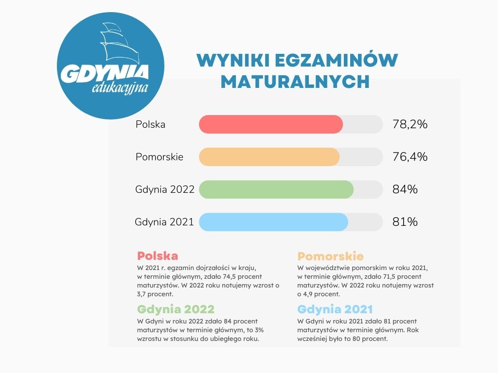 Do matury w 2022 roku przystąpiło 2506 uczniów ze szkół publicznych i prywatnych. 1595 osób zdawało egzamin dojrzałości w gdyńskich liceach, w tym liceach publicznych 1515 osób, 505 osób zdawało w technikach, z czego 453 w technikach publicznych. W części ustnej uczestniczyli tylko ci, którzy muszą przedstawić wynik uzyskany z takiego egzaminu w postępowaniu rekrutacyjnym na uczelnię zagraniczną. Maturę zdało 2489 absolwentów czyli zdawalność w Gdyni wyniosła 84 procent.