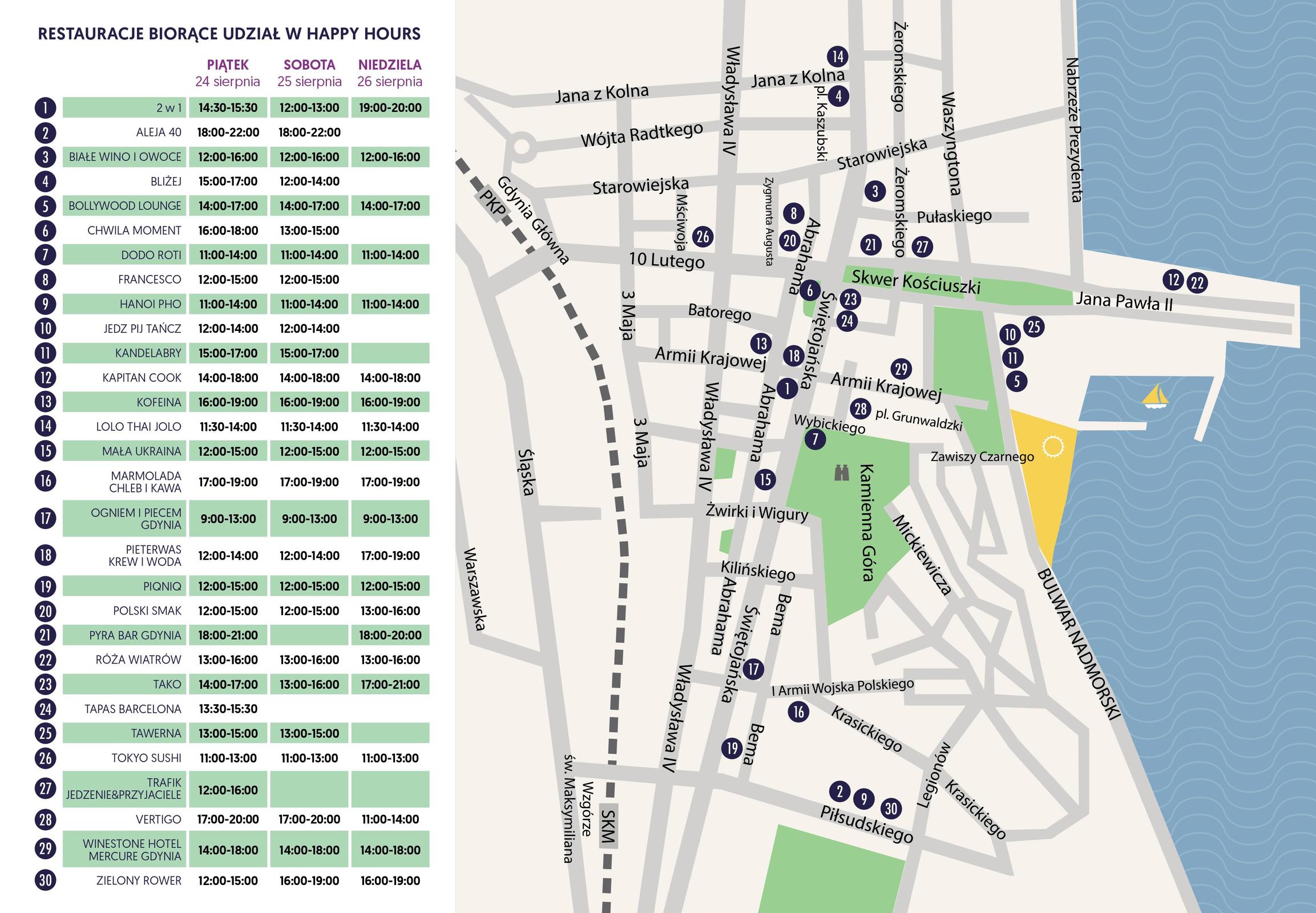 Smakosze i miłośnicy dobrej kuchni będą mogli wybrać się w kulinarną podróż po Gdyni. Będzie smacznie i aromatycznie. Dania degustacyjne, happy hours i konkursy – to atrakcje 10. edycji Weekendu Kulinarnego. Od 24 do 26 sierpnia z różnymi smakami miasta będzie można zapoznać się w 30 gdyńskich restauracjach.W ramach 10. Weekendu Kulinarnego będzie można odbyć prawdziwy rajd po gdyńskich restauracjach, a do tego wygrać nagrody. Wszyscy głodni kulinarnych doznań powinni już przygotowywać swoje kubki smakowe na to wydarzenie. Szefowie kuchni z lokali znajdujących się na Szlaku Kulinarnym Centrum Gdyni przygotują to, co najlepsze. Potrawy będą się opierać na kompozycjach ze świeżych składników prosto od dostawców z Kaszub. Kucharze stworzą mini dania degustacyjne oparte na tym, co wyróżnia ich restauracje, a jednocześnie zaprezentują esencję smaków Gdyni. To autorskie menu zadowoli wszystkich miłośników dobrej kuchni, a do tego będzie na każdą kieszeń. Ceny dań degustacyjnych to 5 i 10 złotych. To okazja do tego, by odwiedzić kilka restauracji i za kilkadziesiąt złotych spróbować ulubionych lub zupełnie nowych potraw oraz poznać różnorodność oferty kulinarnej gdyńskich lokali. Promocyjne ceny dań degustacyjnych obowiązywać będą podczas happy hours. Każda restauracja, która bierze udział w akcji, w poszczególne dni ma z góry ustalone godziny, kiedy można zjeść tam niedrogo. Poniżej prezentujemy mapkę miejsc i happy hours.To jednak nie wszystko. Oprócz smakowych wrażeń będzie jeszcze można wziąć udział w konkursach i wygrać: vouchery do restauracji, kosze upominkowe, poduszki z motywem morskim czy torby od Mana Mana.Pierwszy konkurs to rajd po gdyńskich restauracjach. Aby wziąć w nim udział należy, w dniach od 24 do 26 sierpnia, kupić danie w ramach happy hours w co najmniej trzech różnych restauracjach. Za zakup jednej potrawy, uczestnik otrzymuje naklejkę – każda restauracja ma inną. Po zebraniu trzech naklejek z trzech różnych lokali, trzeba je nakleić na kupon konkursowy – dostępny w restauracjach lub w recepcji gdyńskiego InfoBoksu, przy ul. Świętojańskiej 30. Kupon należy wrzucić do urny, która znajduje się w InfoBoksie, w godzinach jego otwarcia. W konkursie nie ma ograniczeń. Można wrzucić dowolną ilość kuponów. Zwycięzcami zostaną trzy osoby z największą liczbą zgłoszeń. Ogłoszenie wyników odbędzie się w poniedziałek, 27 sierpnia. Swoich sił można też spróbować w konkursie instagramowym. Zasady są proste. Wystarczy zrobić zdjęcie, na którym będzie widać, jak bawiliście się podczas Weekendu Kulinarnego. Może to być selfie czy fotografia dania itp.. Im kreatywniej, tym lepiej. Zdjęcie należy wstawić na własny profil na Instagramie, oznaczyć @kulinarnagdynia i dodać hashtag #kulinarnyrajdgdynia. Autorzy najciekawszych zdjęć wygrają nagrody.W happy hours biorą udział: Aleja 40, Białe Wino i Owoce Gdynia, Bliżej, Bollywood Lounge Gdynia, Chwila Moment, Dodo Roti, Restauracja Dwa w Jednym - '2w1', Pizzeria Francesco, Hanoi Pho, Jedz, Pij, Tańcz, Kandelabry Premium Pub – multitap, Kapitan Cook, Kofeina, Lolo Thai Jolo, Mała Ukraina, Marmolada Chleb i Kawa, Ogniem i Piecem Gdynia, Pieterwas Krew i Woda, Piqniq, Polski Smak, Restauracja Polski Smak, Pyra bar Gdynia, Róża Wiatrów, Tako, Tapas Barcelona, Tawerna, Tokyo Sushi Bar, Winestone Hotel Mercury Gdynia, Trafik Jedzenie&Przyjaciele, Vertigo Restobar i Zielony Rower. Do pobrania Regulamin konkursu instagramowego i "Rajdu po restauracjach" pdf323kb Opublikowano: 21.08.2018 10:21 Autor: Magdalena Czernek (magdalena.czernek@gdynia.pl) Zmodyfikowano: 13.07.2023 14:31 Zmodyfikował: Estera Grubert
