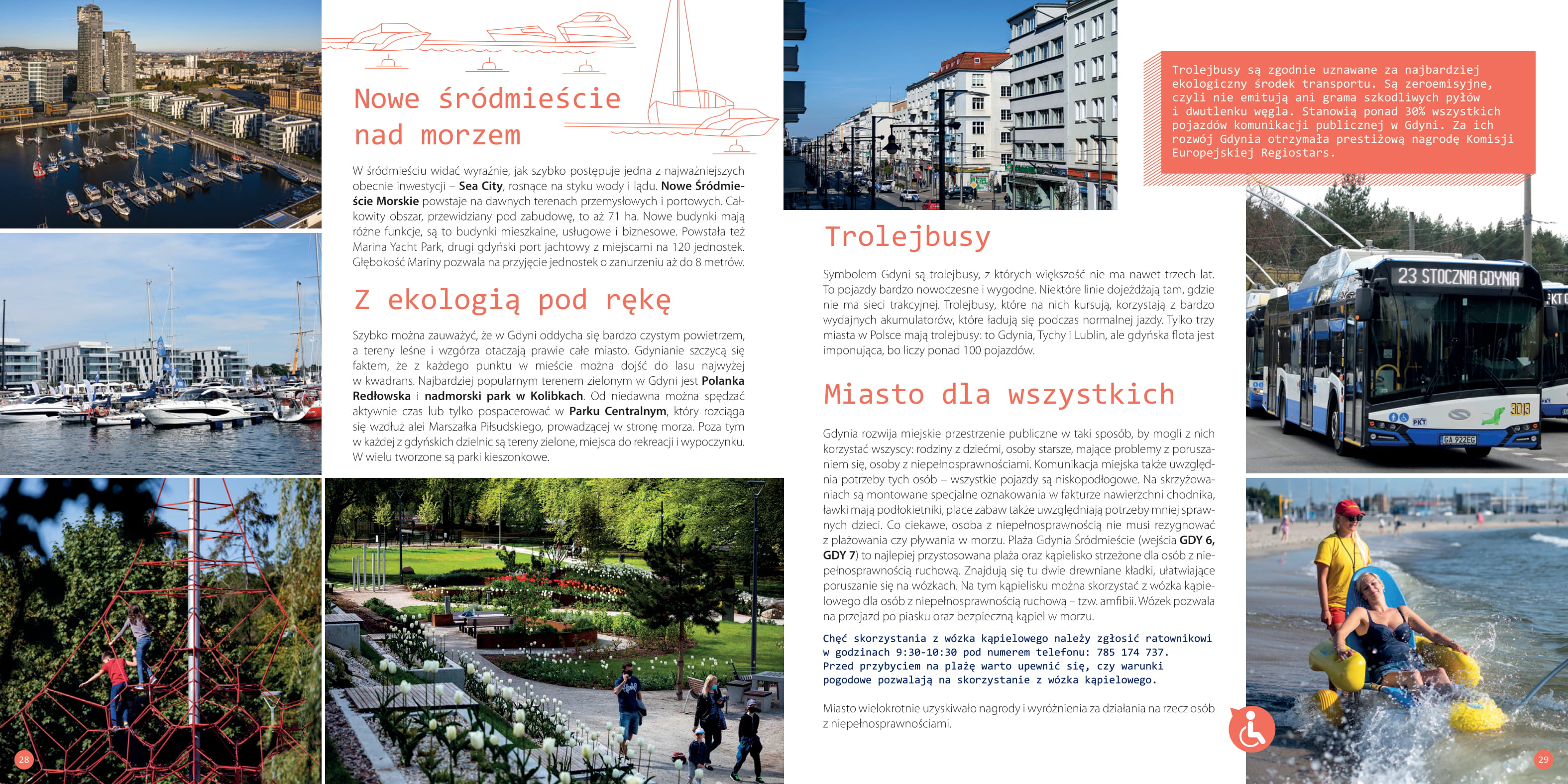 Jakie są największe atrakcje Gdyni? Czy da się ją zwiedzić w jeden lub dwa dni? Jakie lokalne wydarzenia warto zapisać sobie w kalendarzu? Nowy „Przewodnik po Gdyni” to prawdziwe kompendium wiedzy, nie tylko dla turystów! Tegoroczny „Przewodnik po Gdyni” to kolejne opracowanie w ramach serii nowych wydawnictw promujących miasto. Publikacja została przygotowana w języku polskim i angielskim. Jest dostępna w dwóch wersjach interaktywnych: na urządzenia mobilne oraz w wersji desktop (do wyświetlania na ekranie komputera). Klikając wybrany odnośnik, czytelnik przeniesie się bezpośrednio na stronę www, profil na Facebooku czy miejsce w Google Maps.Elektroniczna forma przewodnika to jednak nie wszystko. Wkrótce zostanie wydana również jego drukowana wersja. Będzie ona liczyć 84 strony. - „Przewodnik po Gdyni” to kolejna pozycja z nowej serii wydawnictw promujących miasto. Polecamy w nim największe gdyńskie atrakcje, ale też mniej znane symbole morskiej Gdyni i mnóstwo ciekawostek, które pozwolą spojrzeć na miasto świeżym okiem. Nie mogło zabraknąć informacji o kaszubskich korzeniach Gdyni i o okrętach na lądzie, czyli perłach gdyńskiego modernizmu. Gdynia to także kilometry pięknych, piaszczystych plaż oraz wspaniałe tereny leśne, które stanowią 46% jej powierzchni, i aż cztery rezerwaty przyrody, dlatego w sposób szczególny zachęcamy do aktywnego korzystania ze ścieżek edukacyjnych, wytyczonych szlaków pieszych i rowerowych czy odwiedzenia Leśnego Ogrodu Botanicznego w Marszewie - mówi Katarzyna Gruszecka-Spychała, wiceprezydent Gdyni ds. gospodarki. Poczuj smak szczęścia! Z przewodnika warto skorzystać zarówno wtedy, gdy Gdynię odwiedzamy tylko podczas weekendu ("Odkryj Gdynię w jeden lub w dwa dni"), jak i wtedy, gdy zdecydujemy się pozostać w mieście z morza i z marzeń na dłużej. To kompletny poradnik, dzięki któremu możemy poznać najciekawsze lokalne atrakcje, wydarzenia, ludzi oraz miejsca. Gdynia - tu chce się żyć! Dowiedz się, dlaczego gdynianie są najbardziej zadowoleni z miasta, w którym żyją! Gdynia to miasto dla wszystkich. Swoje miejsce znajdą tu zarówno rodziny z dziećmi, jak i osoby starsze, mające problemy z poruszaniem się czy z niepełnosprawnościami. Natura na wyciągnięcie ręki Dzięki swojemu położeniu Gdynia jest miastem wyjątkowo atrakcyjnym zarówno dla miłośników piaszczystych plaż, strzelistych klifów, jak i leśnych szlaków wędrownych i rowerowych. Różnorodne ukształtowanie terenu sprawia, że z jednej strony mieszkańcy mają dostęp do Morza Bałtyckiego, a z drugiej - do morenowych wzniesień, które do złudzenia przypominają te z typowo górskich terenów na południu Polski. Bądź naszym gościem Na szczególną uwagę odwiedzających Gdynię zasługuje rozdział „Bądź naszym gościem”. Co warto wiedzieć jeszcze przed przyjazdem? Jak dojechać do Gdyni i jak się po niej przemieszczać? Gdzie się zatrzymać? A gdzie wybrać się na zakupy? Na wszystkie te pytania mamy gotową odpowiedź. Przewodnik po Gdyni. Spis treści: Odkryj Gdynię w jeden lub w dwa dni (s. 4) TOP 12. Wybrane atrakcje Gdyni (s. 9) Zapisz w kalendarzu (s. 12) Natura na wyciągnięcie ręki (s. 16) Miejsca ze smakiem (s. 19) Ludzie i miejsca (s. 23) Po pierwsze – jakość życia (s. 27) Tu się robi biznes (s. 32) Bądź naszym gościem (s. 36) Mapa - TOP 12 (s. 40) /storage/uzytkownicy/p.jaloszewski@gdynia.pl/2021/2021-03-03 Poczuj smak szczescia/PrzewodnikGdynia_Desktop PL 05-03-2021 v1.pdf Do pobrania Przewodnik po Gdyni - PL - wersja DESKTOP pdf11647kb Przewodnik po Gdyni - PL - wersja MOBILE pdf11737kb Przewodnik po Gdyni - PL pdf36704kb Gdynia City Guide - EN - DESKTOP pdf11677kb Gdynia City Guide - EN - MOBILE pdf11775kb Gdynia City Guide - EN pdf36699kb Opublikowano: 18.03.2021 10:17 Autor: Paweł Jałoszewski (pawel.jaloszewski@gdynia.pl) Zmodyfikowano: 14.05.2021 14:49 Zmodyfikował: Paweł Jałoszewski