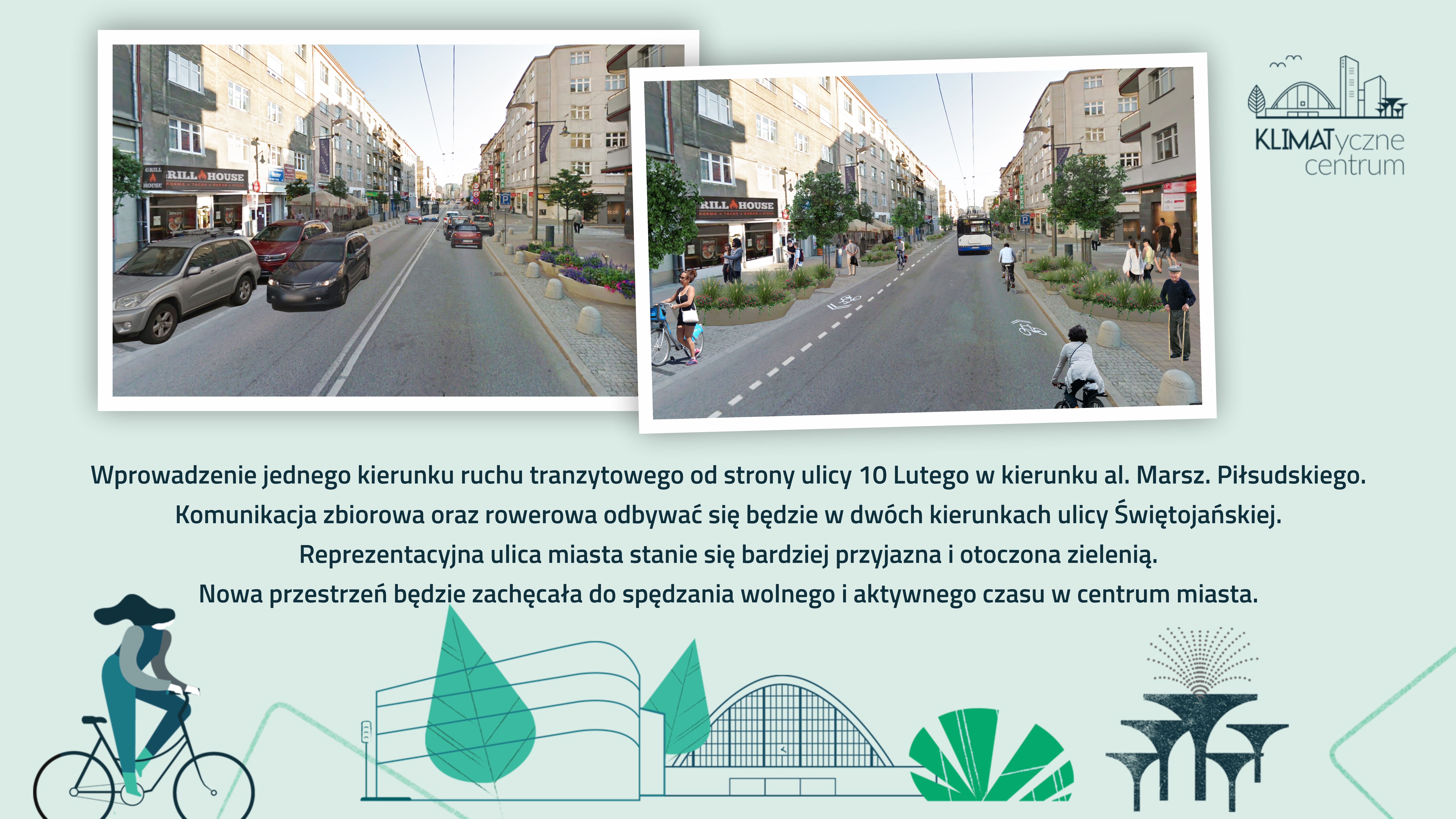 Od soboty, 4 lipca ulicą Świętojańską pojedziemy w jedną stronę, chyba że skorzystamy z roweru lub komunikacji miejskiej. Zmiana organizacji ruchu na głównej gdyńskiej arterii to kolejny element projektu KLIMATycznego Centrum Gdyni. Nowe oblicze słynnej ulicy Ulica Świętojańska to jeden z gdyńskich symboli. Kojarzą ją mieszkańcy i turyści. Znana jako prestiżowe miejsce handlu, dziś jako zagłębie dobrych restauracji i jedna z najchętniej odwiedzanych przez spacerowiczów ulic w Gdyni. To jeden z najważniejszych elementów dużej metamorfozy, którą przechodzi w ostatnich miesiącach centrum miasta – KLIMATycznego Centrum Gdyni.- Wdrażamy projekt, nad którym pracowaliśmy od wielu miesięcy i który będziemy konsekwentnie realizować także w najbliższych latach – mówi Wojciech Szczurek, prezydent Gdyni. - To konkretne działania związane ze zmianami klimatycznymi i ich wpływem na nasze najbliższe otoczenie. Centrum po tych zmianach będzie pełne życia, przyjazne i czyste, a rozwiązania, które przygotowaliśmy zmodyfikują też przyzwyczajenia transportowych naszych mieszkańców – dodaje prezydent Gdyni.Już od 4 lipca (sobota) wchodzi w życie zapowiadana wcześniej zmiana organizacji ruchu. Świętojańska od teraz będzie jednokierunkowa, przyjazna pieszym oraz nadal otwarta dla obustronnego ruchu komunikacji miejskiej i rowerów. Zmiany obejmują odcinek od wysokości skrzyżowania z ul. 10 Lutego do skrzyżowania z al. marsz. Piłsudskiego.- Dzięki projektowi KLIMATycznego Centrum przestrzeń miejska w sercu Gdyni będzie zielona, przyjazna i dostępna dla wszystkich. Metamorfoza ulicy Świętojańskiej to jedna z kluczowych zmian związanych z tym projektem. Jej celem jest zapewnienie pieszym i rowerzystom bezpieczeństwa i komfortu poruszania się po jednej z najważniejszych ulic naszego miasta. To kierunek rozwoju Gdyni jako europejskiej i nowoczesnej aglomeracji – mówi Marek Łucyk, wiceprezydent Gdyni ds. rozwoju. Rowery i trolejbusy na specjalnych prawach O wszystkich zmianach poinformuje nowe oznakowanie. Główna nowość, wprowadzenie jednokierunkowej organizacji ruchu obejmie samochody osobowe poruszające się na wspomnianym odcinku od ul. 10 Lutego do al. marsz. Piłsudskiego. Możliwe będzie poruszanie się jedynie w kierunku prowadzącym do Urzędu Miasta Gdyni.Rowerzyści zyskają za to nowy, ponad kilometrowy i szeroki na 1,5 metra pas rowerowy, który umożliwi im bezpieczną jazdę po odmienionej Świętojańskiej w obu kierunkach. Powstaną też nowe śluzy dla rowerów, które pozwolą bezpiecznie pokonać skrzyżowania z sygnalizacją świetlną. Tak samo jak do tej pory, w obu kierunkach będą poruszać się trolejbusy.Świętojańska już od dawna stanowi strefę tempo 30 – teraz egzekwowanie przepisów będzie łatwiejsze i skuteczniejsze dzięki zwężeniu pasa ruchu i usunięciu dotychczasowego podziału jezdni, co wymusi na kierowcach „osobówek" zdjęcie nogi z gazu. Warto zaznaczyć, że liczba miejsc parkingowych pozostanie niezmieniona. Co więcej, piesi zyskają więcej zieleni i przestrzeni przy początkowym fragmencie al. marsz. Piłsudskiego - dotychczasowy prawoskręt w Świętojańską zostanie przekształcony w przyjazną przestrzeń z trawnikiem i ławkami.Koszt zmiany organizacji ruchu na ul. Świętojańskiej, w tym koszt nowego oznakowania to około 80 tysięcy złotych. Celem zmian jest zapewnienie pieszym i rowerzystom większej wygody i bezpieczeństwa na jednej z najważniejszych ulic w mieście. Przestrzeń stanie się bardziej przyjazną pieszym. Zadanie jest częścią projektu KLIMATycznego Centrum Gdyni. Opublikowano: 24.06.2020 15:00 Autor: Kamil Złoch (kamil.zloch@gdynia.pl)