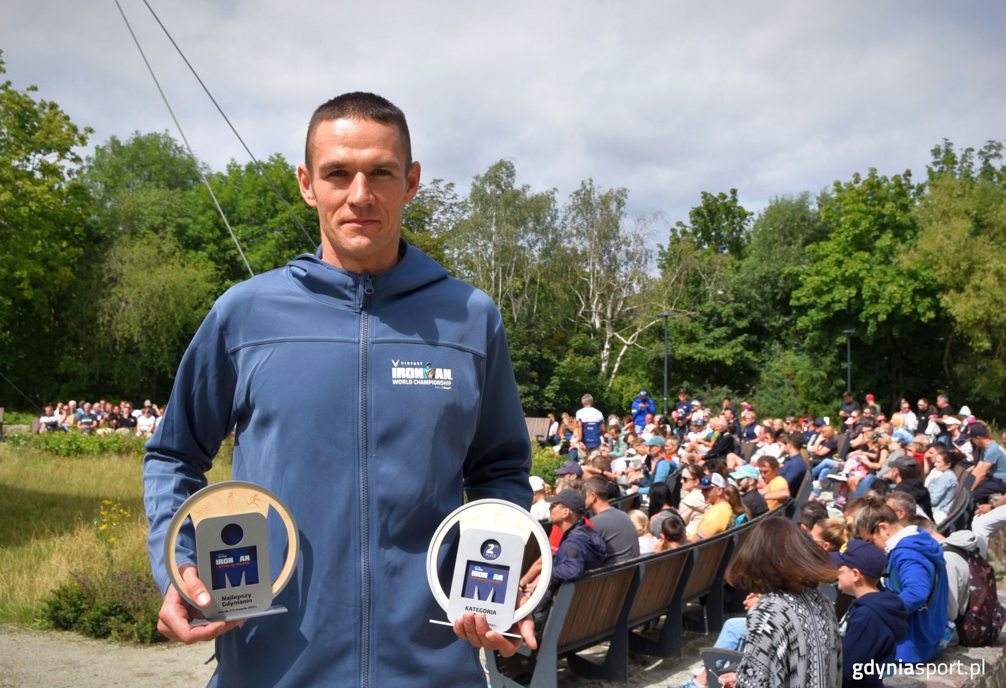 Niesamowite emocje, gorący doping i rywalizacja do samego końca – zakończyła się 11. edycja Enea IRONMAN Gdynia. W poniedziałek odbyła się dekoracja najlepszych zawodników na pełnym dystansie. Wyróżnienia wręczał dyrektor Gdyńskiego Centrum Sporu Przemysław Dalecki. – Enea IRONMAN Gdynia to nieodłączny element sportowych wydarzeń w naszym mieście. Już 11-krotnie, od 2013 roku, mogliśmy podziwiać zmagania sportowców w trzech konkurencjach: pływanie, rower i bieganie. Tegoroczna edycja, mimo że ze względu na warunki atmosferyczne, w niedzielę okrojona z części pływackiej, dostarczyła ponownie wielu emocji. Wystartowało łącznie kilka tysięcy uczestników, od imprez towarzyszących przeznaczonych dla biegaczy, amatorów i dzieci, do głównego wydarzenia, jakim był niewątpliwie pełen dystans IRONMAN. Kibice nie zawiedli. Wielu fanów przy trasie zawodów wpierało zawodników, a gorący doping z trybun na plaży witał finiszujących zawodnikówtworząc piękny, sportowy obraz – podsumował Dyrektor Gdyńskiego Centrum Sportu Przemysław Dalecki. Dyrektor GCS Przemysław Dalecki składający gratulacje za zajęcia miejsca na podium w Enea IRONMAN Gdynia. fot. Przemysław ŚwiderskiW poniedziałek 7 sierpnia odbyła się dekoracja najlepszych zawodników pełnego dystansu IRONMAN. Uroczystość miała miejsce w amfiteatrze na Kamiennej Górze. Nagrody otrzymali uczestnicy, którzy stanęli na podium w swojej kategorii wiekowej. Wyróżnienia wręczał Dyrektor Gdyńskiego Centrum Przemysław Dalecki.Następnie odbyło się wręczenie Slot Allocation, czyli przekazanie przepustek na Mistrzostwa Świata w IRONMAN.Organizator przyznał specjalną nagrodę „Najlepszy Gdynianin” dla miejscowego zawodnika, który ukończył najszybciej rywalizację w zawodach. Jako pierwszy mieszkaniec naszego miasta do mety dobiegł Paweł Reszke z rewelacyjnym wynikiem 8 godzin, 15 minut i 53 sekund – co dało mu 13. miejsce w klasyfikacji generalnej.Paweł Reszke wybrany najlepszym gdynianiem w Enea IRONMAN Gdynia 2023. fot. Marek Urbaniak / Gdyńskie Centrum SportuTo był niewątpliwie intensywny weekend w Gdyni. Od piątku do niedzieli toczyła się rywalizacja w wielu kategoriach. Od najmłodszych do najstarszych uczestników, każdy mógł wystartować i sprawdzić swoje umiejętności w imprezie z cyklu IRONMAN.Wszystkich zwycięzców oraz opisy poszczególnych wydarzeń znaleźć można w podsumowaniu tegorocznej edycji Enea IRONMAN Gdynia:PODSUMOWANIE ENEA IRONMAN GDYNIA 2023 Opublikowano: 08.08.2023 12:50 Autor: Paweł Stasiak (p.stasiak@gdyniasport.pl) Zmodyfikowano: 08.08.2023 12:56 Zmodyfikował: Agnieszka Janowicz