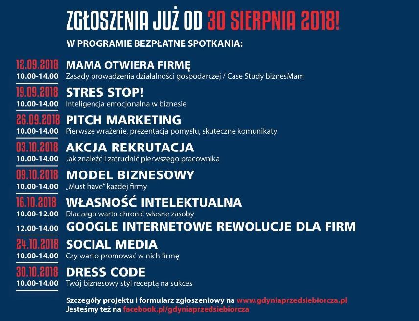 Uczestniczki projektu poznają m.in.: tajniki skutecznej komunikacji czy efektywnego szukania klienta i pracownika. Wiedzę zdobędą podczas ośmiu spotkań warsztatowych. Dowiedzą się tam o tym, jak prowadzić działalność gospodarczą, nauczą się podstaw marketingu, dress code’u, jak promować swój biznes w social mediach czy jak skutecznie rekrutować. Poznają też historie kobiet, które brały udział w poprzednich edycjach projektu. Podczas spotkania „case study” usłyszą, jakie firmy prowadzą BiznesMamy i jak osiągnęły sukces. Spotkania odbywać się będą raz w tygodniu – od 12 września do 30 października. Zajęcia poprowadzą m.in.: psychologowie, trenerzy i doradcy biznesowi, przedsiębiorcy-praktycy oraz wizażystka.