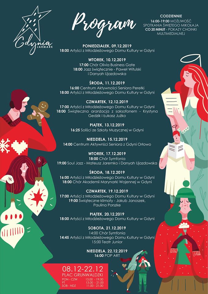 Przedświąteczny czas w Gdyni jak zawsze zapowiada się wyjątkowo. Nie zabraknie magicznej atmosfery, kolorowych światełek i wielu wydarzeń, które wprowadzą mieszkańców w niezwykły klimat. Powiew świątecznej radości w szczególny sposób będzie można poczuć na placu Grunwaldzkim. Na dwa tygodnie zamieni się on w świąteczne miasteczko. A ponadto rozświetlą go specjalnie zaprojektowane iluminacje. Wszystko za sprawą pierwszego Gdyńskiego Jarmarku Świątecznego. Rozpocznie się on 8 grudnia i potrwa do 22 grudnia. To idealna okazja do kupienia oryginalnych dekoracji i prezentów oraz do rozsmakowania się w świątecznych kulinarnych inspiracjach. Plac Grunwaldzki zmieni swoje oblicze, aby wprowadzić gdynian w bożonarodzeniową atmosferę. Jak za dotknięciem czarodziejskiej różdżki przekształci się w świąteczne miasteczko, którego nie sposób będzie nie zauważyć. Oświetlą je przygotowane specjalnie na tę okazje iluminacje. Jednak nie tylko dlatego to miejsce będzie przyciągać jak magnes. Jarmark Świąteczny to przede wszystkim niezapomniana atmosfera, o którą zadbają wystawcy, artyści i ulubiony gość wszystkich dzieci. Dekoracje i różnego rodzaju atrakcje dopełnią klimatu. Gdyński Jarmark Świąteczny rozpocznie się 8 grudnia o godz. 16.00 i będzie działać codziennie do 22 grudnia. Od poniedziałku do czwartku można go odwiedzać od godz. 13.00 do godz. 19.00, a w piątek od godz. 13.00 do godz. 21.00. Natomiast w weekendy jarmark będzie czynny od godz. 11.00 do godz. 21.00. Na odwiedzających czekać będzie 20 stoisk z bogatą ofertą świątecznych dekoracji i pomysłów na prezenty dla bliskich. Wszyscy zainteresowani znajdą tam m.in.: ręcznie wykonane ozdoby, stroiki, biżuterię, ceramiczne podkładki, obrazy, świece czy gotowe zestawy prezentowe. Będą też świąteczne wyroby i słodycze – np. pierniki czy bombonierki, a także aromatyczne kawy i herbaty oraz akcesoria do ich zaparzania. Coś dla siebie znajdą także smakosze. Na jarmarku nie zabraknie specjałów z różnych regionów Polski i świata. Skosztować lub zakupić będzie można m.in.: pierogi, regionalne wędliny, góralskie sery, chleb, bigos, litewskie specjały, węgierskie ciasto drożdżowe, greckie chałwy, miody, słodycze czy torty i domowej roboty wypieki. A na rozgrzewkę przygotowano gorącą czekoladę, herbatę świąteczną czy grzańca., miody z owocami, bakaliami i orzechami, ciasta i torty, chleb, rogale i bułeczki własnego wypieku. Jeśli mowa o Świętach, to nie można też zapomnieć o ulubionym gościu wszystkich dzieci. Święty Mikołaj odwiedzi Gdynię już 6 grudnia, jednak tym razem zadomowi się u nas na dłużej. Będzie go można spotkać na terenie jarmarku – między godz. 16.00 a 19.00, gdzie ma zamiar spacerować i wysłuchać życzeń każdego malucha. Zainteresowani mogą nawet uwiecznić tę chwilę. Święty Mikołaj będzie bowiem chętnie pozował do zdjęć. W muszli koncertowej zostanie zaaranżowany pokój Świętego Mikołaja, gdzie zostaną wykonane pamiątkowe fotografie.Najmłodsi będą także mogli zakosztować przejażdżki świąteczną karuzelą. O przyjemne spędzenie czasu z rodziną zadbają również lokalni artyści. Każdego popołudnia, między godz. 16.00 a 19.00, w muszli koncertowej atrakcje muzyczne zapewnią m.in.: Młodzieżowy Dom Kultury, Chór Symfonia, Teatr Junior, Kuźnia Talentów. Występy na scenie każdego dnia będą trwały od 60 do 90 minut. W wybrane dni można też liczyć na inne atrakcje. Jedną z nich będą warsztaty kulinarne dla dzieci, które odbędą się 17 grudnia w restauracji Muszli. Opublikowano: 22.11.2019 14:31 Autor: Paweł Jałoszewski (pawel.jaloszewski@gdynia.pl) Zmodyfikowano: 18.12.2019 13:58 Zmodyfikował: Weronika Rozbicka