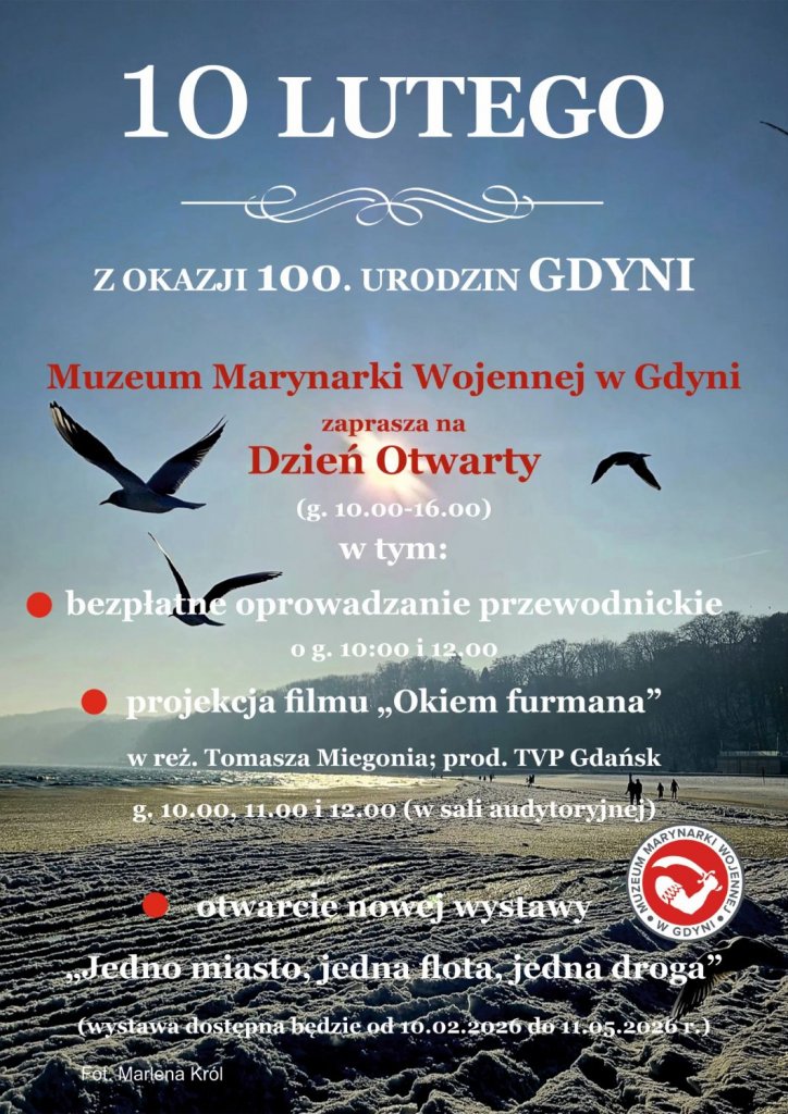 Gdynia świętuje 100. urodziny — świętujmy razem w Muzeum Marynarki Wojennej! 10 lutego zapraszamy na Dzień Otwarty Muzeum Marynarki Wojennej w Gdyni, w godz. 10:00–16:00. W programie: bezpłatne oprowadzanie z przewodnikiem o godz. 10:00 i 12:00, projekcja filmu „Okiem furmana” (reż. Tomasz Miegoń, prod. TVP Gdańsk) o godz. 10:00, 11:00 i 12:00 – sala audytoryjna, uroczyste otwarcie nowej wystawy „Jedno miasto, jedna flota, jedna droga”, godz. 11:00. Wystawa będzie dostępna od 10.02.2026 do 11.05.2026 r. To idealna okazja, by poznać morską historię Gdyni i spędzić czas w wyjątkowej atmosferze!Zapraszamy serdecznie! Kontakt Muzeum Marynarki Wojennej w Gdyni sekretariat@muzeummw.pl 58 620 13 81 (wew. 10) Opublikowano: 30.01.2026 14:49 Autor: Paweł Jałoszewski (pawel.jaloszewski@gdynia.pl) Zmodyfikowano: 30.01.2026 14:50 Zmodyfikował: Paweł Jałoszewski