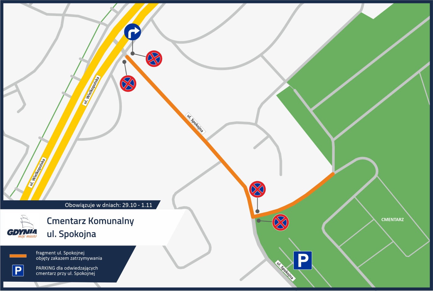 Jak dojechać do największych gdyńskich cmentarzy w okresie Wszystkich Świętych? Zapowiadamy zmiany w organizacji ruchu i dodatkowe kursy autobusów od 26 października do 2 listopada. Od 29 października do 2 listopada cmentarze komunalne będą otwarte przez całą dobę. W tym okresie, w związku z organizacją dnia Wszystkich Świętych i przewidywanym wzmożonym ruchem pieszych, wprowadzony zostaje całkowity zakaz wjazdu samochodem na teren gdyńskich cmentarzy komunalnych (nie dotyczy pojazdów służb porządkowych i obsługi cmentarza).Osoby starsze (powyżej 75. roku życia) oraz osoby z niepełnosprawnością będą mogły skorzystać z wjazdów na gdyńskie cmentarze komunalne w dni powszednie w godz. 8.00-10.00 do 28.10. i po 2.11. w tych samych godzinach.Biura ZCK przy ul. Witomińskiej i przy ul. Rzemieślniczej w Kosakowie 29 i 31.10 będą czynne dla interesantów w godz. 8.00-15.00.Na stronie internetowej zck.pl znajduje się skrót do aplikacji Grobonet, umożliwiającej wyszukanie grobów osób zmarłych pochowanych na gdyńskich cmentarzach komunalnych, zgłoszenie chęci opłacenia miejsca grzebalnego oraz wgląd do wirtualnych spacerów po cmentarzach. Zmiany w organizacji ruchu: Cmentarz komunalny przy ul. Witomińskiej w Gdyni Od 29 października (sobota) do 1 listopada (wtorek) na ul. Witomińskiej będzie obowiązywał jeden kierunek ruchu – od skrzyżowania z ulicami Zielną i Bursztynową do skrzyżowania z ul. Warszawską. Od strony ul. Warszawskiej na ul. Witomińską będą mogły wjechać jedynie autobusy komunikacji miejskiej oraz pojazdy służb miejskich i rowerzyści. Pozostali uczestnicy ruchu, w tym taksówki, będą mogli dostać się w rejon cmentarza tylko od ul. Kieleckiej. Z ul. Śląskiej w lewo w ul. Warszawską będą mogły skręcić jedynie autobusy komunikacji miejskiej oraz pojazdy służb miejskich. Przez skrzyżowanie ul. Śląskiej z al. Marsz. Piłsudskiego (węzeł im. Franciszki Cegielskiej) w kierunku Chyloni będzie można przejechać jedynie wiaduktem przebiegającym nad jezdnią al. Marsz. Piłsudskiego. Nie będzie możliwości wyjazdu z ul. Zjazdowej na ul. Witomińską. Na skrzyżowaniu ulic Kieleckiej, Rolniczej, Witomińskiej i Konwaliowej nie będzie można skręcić w lewo z ul. Kieleckiej w ul. Konwaliową, a z ul. Witomińskiej będzie można pojechać tylko w prawo w ul. Rolniczą. Na ul. Kieleckiej zostaną wprowadzone dwa pasy ruchu w kierunku ul. Witomińskiej.Podobnie jak w ubiegłych latach będzie można parkować na pasie ruchu ul. Witomińskiej pomiędzy ul. Zielną a główną bramą cmentarza (po stronie cmentarza). Na końcu tego odcinka zostanie wyznaczony tymczasowy postój taksówek. Natomiast postój znajdujący się naprzeciwko budynku Zarządu Cmentarzy Komunalnych zostanie zawieszony. Parking przy cmentarzu będzie w całości przeznaczony dla osób z niepełnosprawnościami. Na odcinku ul. Witomińskiej pomiędzy główną bramą cmentarza a ul. Warszawską będzie obowiązywać zakaz zatrzymywania się. Na parkingu przy bramie cmentarza będzie pętla autobusowa. Zmiany w organizacji ruchu: Cmentarz komunalny przy ul. Spokojnej w Gdyni Między 29 października a 1 listopada po obu stronach ul. Spokojnej – od skrzyżowania z ul. Wielkopolską do drogi dojazdowej do cmentarza, jak i ta droga – będzie obowiązywać zakaz zatrzymywania. Z wlotu ul. Spokojnej na skrzyżowanie z ul. Wielkopolską będzie można skręcić tylko w prawo. Kierowcy będą mogli skorzystać z parkingu przy ul. Spokojnej za drogą dojazdową do cmentarza. Zmiany w organizacji ruchu: Cmentarz Marynarki Wojennej przy ul. A. Muchowskiego Od 29 października do 1 listopada na ulicach Miegonia oraz Muchowskiego zostanie wprowadzony jeden kierunek ruchu – od ul. Dickmana do ul. Arciszewskich. Zmiany w organizacji ruchu: Cmentarz komunalny w Kosakowie Zmiany w organizacji ruchu obowiązują 1 listopada 2022 roku. Tego dnia zostaje wprowadzony: objazd do cmentarza komunalnego przy ul. Rzemieślniczej przez wieś Pierwoszyno prowadzi ulicami Żeromskiego – Kaszubską – Rumską – Rzemieślniczą; zakaz zatrzymywania się po stronie cmentarza na ul. Rzemieślniczej. Nie dotyczy pojazdów komunikacji miejskiej; zakaz zatrzymywania się po lewej stronie ul. Żeromskiego – na odcinku od ronda do ul. Kaszubskiej. Nie dotyczy pojazdów komunikacji miejskiej; zakaz zatrzymywania się po obu stronach ul. Leśnej – na odcinku od ul. Rumskiej do ul. Brzozowej; ruch jednokierunkowy na ul. Rzemieślniczej – w kierunku ul. Rumskiej – do ul. Chrzanowskiego. Zmiany w komunikacji miejskiej Wzmożona obsługa komunikacyjna nekropolii w Gdyni oraz w obsługiwanych gdyńską komunikacją miejską gminach sąsiednich, realizowana będzie w dniach od 26 października do 2 listopada. Dojazd w bezpośrednią bliskość cmentarzy możliwy jest wyłącznie transportem zbiorowym. W wielu miejscach autobusy i trolejbusy traktowane będą priorytetowo w stosunku do samochodów osobowych. W dniach od 30 października do 2 listopada zaangażowany zostanie cały dostępny tabor i kierowcy, a także pojazdy wypożyczone z innych miast, w innych niż gdyńskie barwach. Zachęcamy do skorzystania z komunikacji miejskiej w dojazdach na cmentarze. Pełne rozkłady jazdy dostępne są na stronie: zkmgdynia.pl.Dodatkowa obsługa komunikacyjna w poszczególne dni przedstawia się następująco: Środa – piątek, 26-28 października Obowiązują stałe rozkłady jazdy, ważne w dni powszednie nauki szkolnej. Obsługę linii 105 – dowożącej pasażerów do Cmentarza Komunalnego w Kosakowie – zapewnia się autobusami przegubowymi. Linia 190 do Cmentarza Witomińskiego w Gdyni w razie potrzeb wzmacniana będzie dodatkowymi autobusami, poza stałym rozkładem jazdy. Sobota – niedziela, 29-30 października Obowiązują stałe rozkłady jazdy (w sobotę – sobotnie, w niedzielę – świąteczne), od których wprowadza się odstępstwa opisane p
