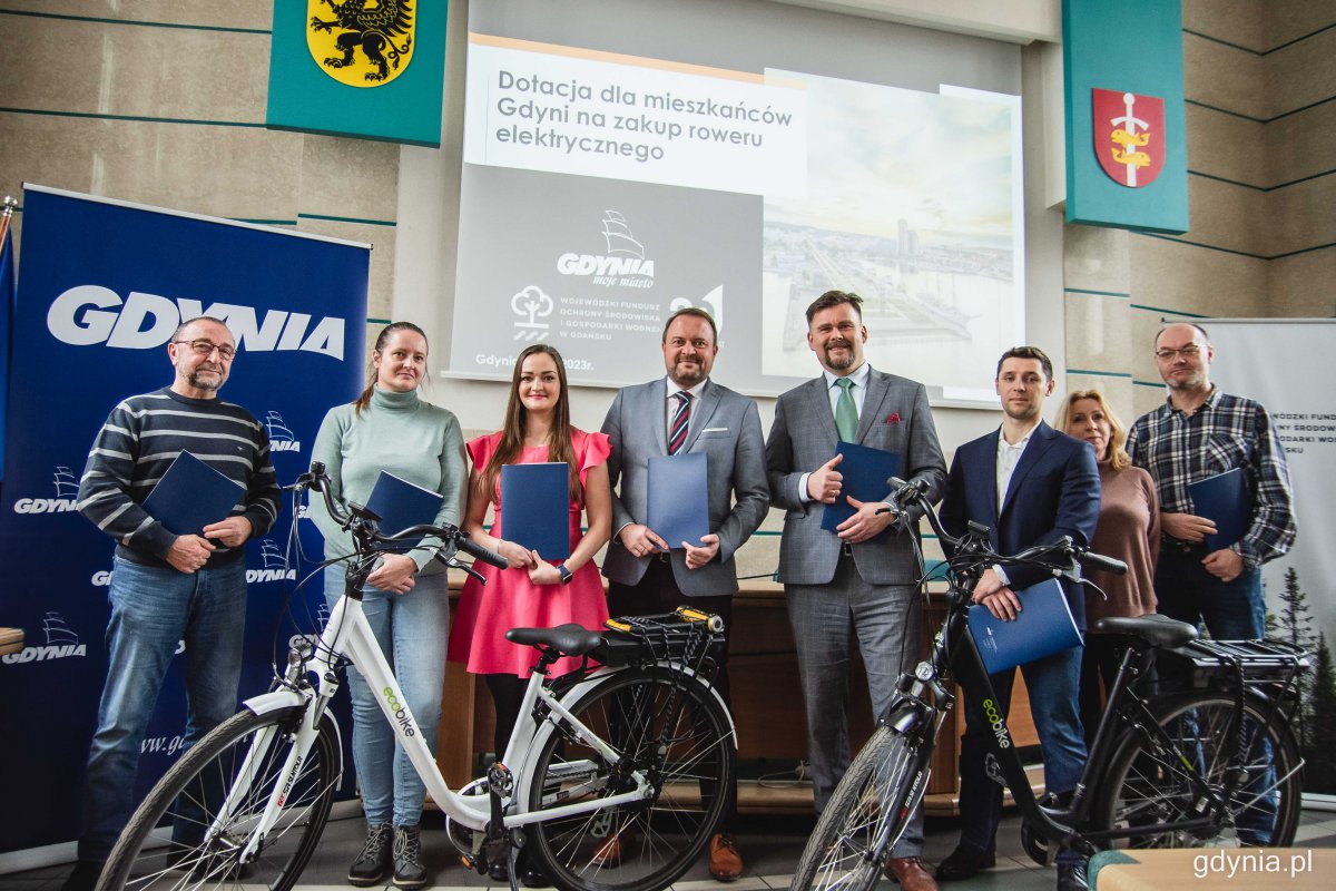 15 lutego podpisano umowę dotyczącą dotacji na zakup e-rowerów między miastem, a przedstawicielami Wojewódzkiego Funduszu Ochrony Środowiska i Gospodarki Wodnej w Gdańsku. Przy tej okazji udało się dokonać pierwszych formalności – swoje umowy dotyczące dotacji na zakup e-rowerów podpisało sześcioro mieszkańców Gdyni, którzy złożyli swoje wnioski jeszcze przy poprzednim rozdaniu. Już niebawem będą mogli skorzystać z nowych pojazdów. Do końca bieżącego roku nowe rowery z dotacją będzie mogło zakupić w sumie 80 osób. Na zdjęciu wiceprezydent Gdyni ds. rozwoju, Marek Łucyk (czwarty z lewej) i Szymon Gajda, prezes WFOŚiGW w Gdańsku (piąty z lewej) oraz mieszkańcy, którzy otrzymali dotację na rower// fot. Kamil Złoch W tegorocznej edycji na zakup rowerów elektrycznych przez gdynian zostanie przyznanych łącznie 200 tysięcy złotych, z czego połowa tej sumy to dofinansowanie ze środków WFOŚiGW. Mieszkańcy, którzy nie zakwalifikowali się do programu dotacji w poprzednim roku z powodu wykorzystania puli środków przeznaczonych na ten cel, zgodnie z zapisami Uchwały Rady Miasta Gdyni z dnia 27 kwietnia 2022 r. w sprawie zasad udzielenia dotacji celowej na zakup roweru elektrycznego, znaleźli się automatycznie na liście wnioskujących w roku 2023, z zachowaniem pierwotnej kolejności zgłoszeń.Co ważne, wszystkie zasady udzielania dotacji dla mieszkańców pozostały bez zmian i nadal przysługuje dofinansowanie w wysokości odpowiadającej aż 50% wartości poniesionych kosztów kwalifikowanych, jednak nie więcej niż 2 500 zł.Warto wspomnieć, że w 2022 roku gdynianie złożyli w tej sprawie ponad 1100 wniosków. Opublikowano: 23.02.2023 14:13 Autor: Dominika Sobiech (dominika.sobiech@gdynia.pl) Zmodyfikowano: 23.02.2023 14:15 Zmodyfikował: Dominika Sobiech