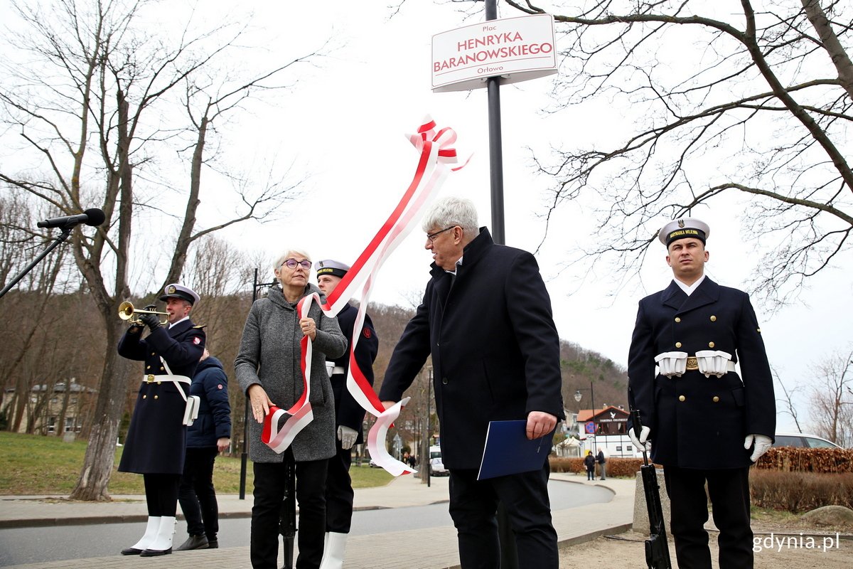Wszechstronny twórca, piewca miasta, portu, stoczni, nadmorskich, gdyńskich pejzaży i ludzi morza. Blisko związany z Orłowem, stworzonym do tego, by przenosić je na płótno. Henryk Baranowski, jeden z najbardziej rozpoznawalnych gdyńskich malarzy, ma swój plac w Orłowie. Uroczystość nadania imienia odbyła się 23 marca. Uczestniczyli w niej – gdynianie, pasjonaci Orłowa, dzieci ze szkoły podstawowej Montessori Latawiec w Małym Kacku, samorządowcy, marynarze Marynarki Wojennej RP. Joanna Zielińska, przewodnicząca Rady Miasta Gdyni odsłania wraz z synem malarza, Arturem Baranowskim-Barendtem tablicę z nazwą placu // Fot. Przemysław Kozłowski Warto wspomnieć, że prace Henryka Baranowskiego można obecnie obejrzeć na wystawie „Marynista nie jedno ma imię” w Muzeum Marynarki Wojennej przy ul. Zawiszy Czarnego 1B. Wystawa dostępna do 5 czerwca br. Opublikowano: 30.03.2023 12:23 Autor: Dominika Sobiech (dominika.sobiech@gdynia.pl)