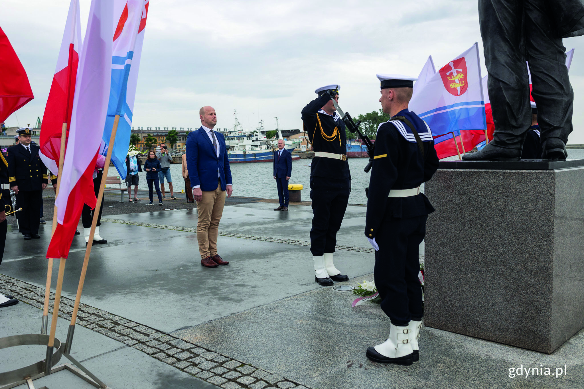 W niedzielę, 23 lipca z okazji 160. rocznicy urodzin Tadeusza Wendy odbyły się uroczyste obchody na molo Rybackim. Przed pomnikiem budowniczego gdyńskiego portu odbyły się uroczystości z wojskową asystą honorową. Miasto Gdynię reprezentował Bartosz Bartoszewicz, wiceprezydent Gdyni ds. jakości życia.Z okazji 160. rocznicy urodzin Tadeusza Wendy, przed jego pomnikiem, kwiaty złożył Bartosz Bartoszewicz, wiceprezydent Gdyni ds. jakości życia // fot. Karol Stańczak 160 lat temu na świat przyszedł człowiek, który stworzył gdyński port, kładąc tym samym podwaliny pod rozwój naszego miasta. 29 maja 2021 roku w ramach kulminacji obchodów roku Tadeusza Wendy w Gdyni odsłonięto na ostrodze molo Rybackiego pomnik budowniczego gdyńskiego portu. Opublikowano: 27.07.2023 11:07 Autor: Dominika Sobiech (dominika.sobiech@gdynia.pl)