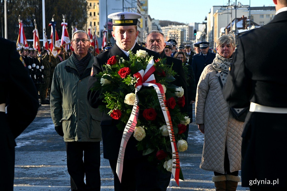 28 listopada 1918 roku marszałek Józef Piłsudski wydał dekret, w którym rozkazał utworzyć Marynarkę Wojenną. Mija 105 lat od tego ważnego wydarzenia. Z tej okazji w Gdyni odbyły się oficjalne uroczystości. Podczas nich poświęcono krzyż przy Kwaterze Pamięci na cmentarzu Marynarki Wojennej, co symbolicznie zakończyło proces powstawania tego ważnego miejsca, które przypomina o bohaterstwie polskich żołnierzy i marynarzy. Marynarka Wojenna od 105 lat broni interesów państwa i stoi na straży morskich granic Rzeczypospolitej Polskiej. Święto tej formacji przypada 28 listopada. Z tej okazji w Gdyni zorganizowano oficjalne uroczystości. Obchody rozpoczęły się po południu w poniedziałek, 27 listopada od uroczystego capstrzyku przy Kwaterze Pamięci na cmentarzu Marynarki Wojennej. To miejsce symboliczne – poświęcone pamięci polskich marynarzy. Podczas uroczystości poświęcono krzyż, który ma nawiązywać do masztu na statku czy okręcie. Ten akt zwieńczył realizację tej inwestycji. – Kto nie szanuje i nie ceni swojej przeszłości, ten nie jest godzien szacunku, teraźniejszości, ani prawa do przyszłości. Te słowa marszałka Józefa Piłsudskiego były, są i będą naszym drogowskazem. Stojąc dzisiaj przy Kwaterze Pamięci Cmentarza Marynarki Wojennej pragniemy oddać hołd wszystkim naszym poprzednikom, bohaterom naszej trudnej historii. To w tym miejscu są pochowani ludzie, którzy oddali młode lata swojego życia na tworzenie obecnej Marynarki Wojennej. Dziś to my wypełniamy te zobowiązania i staramy się godnie kontynuować rozpoczęte przez nich dzieło. Pragnę podziękować wszystkim, którzy przyczynili się do powstania tak godnego miejsca poświęconego pamięci polskich marynarzy – mówił podczas uroczystości wiceadm. Jarosław Ziemiański, inspektor Marynarki Wojennej.– Dzisiejsza uroczystość kończy proces powstawania Kwatery Pamięci. Poświęcenie krzyża symbolicznie zamyka drogę, którą podjęliśmy jako współczesne pokolenie, wykonując testament i ostatnią wolę admirała Unruga. Bardzo się cieszę, że Gdynia po raz kolejny udowadnia, że myślimy o nowoczesności i o przyszłości, a także z dumą patrzymy na historię naszego miasta i Marynarki Wojennej. Niech ta kwatera pamięci zawsze przypomina o bohaterstwie żołnierza polskiego, polskiego marynarza – mówi Wojciech Szczurek, prezydent Gdyni. Podczas popołudniowych obchodów nie zabrakło apelu pamięci, a także wybrzmiała salwa honorowa. Jednym z punktów była też ceremonia otwarcia wystawy Instytutu Pamięci Narodowej w Gdańsku. Na koniec uczestnicy uroczystości złożyli kwiaty przed Kwaterą Pamięci.Jacek Siewiera - szef BBN, prezydent Gdyni Wojciech Szczurek i wiceadm. Krzysztof Jaworski - dowódca Centrum Operacji Morskich - dowódca Komponentu Morskiego podczas capstrzyku z okazji 105. rocznicy utworzenia Marynarki Wojennej // fot. Mirosław PieślakWtorek, 28 listopada to kolejny dzień obchodów. Rano podniesiono wielką galę banderową na okrętach Marynarki Wojennej. Potem w Kościele Garnizonowym Marynarki Wojennej odbyła się msza święta w intencji Marynarki Wojennej.Główne uroczystości zorganizowano przed pomnikiem Polski Morskiej. Odbył się tam uroczysty apel, w którym wzięli udział m.in. samorządowcy, przedstawiciele Marynarki Wojennej i służb mundurowych, a także mieszkańcy. Rozpoczęło go odegranie hymnu narodowego z jednoczesnym podniesieniem flagi państwowej na maszt. Następnie z pokładu ORP „Błyskawicy” oddano świąteczny salut armatni. Potem wręczono odznaczenia wyróżniającym się żołnierzom. Nie zabrakło też życzeń dla marynarzy. – W tę ważną rocznicę chcę podziękować marynarskiej rodzinie za codzienną służbę, stawianie czoła wszelkim wyzwaniom i szybkie reagowanie w sytuacjach kryzysowych. Życzę całej kadrze Marynarki Wojennej, personelowi, pracownikom resortu obrony narodowej, a także miłośnikom bezkresu morza kolejnych lat pełnienia służby i wszelkiej pomyślności – mówił gen. broni Marek Sokołowski, dowódca generalny rodzajów sił zbrojnych.– Dzisiaj oddajemy hołd wszystkim bohaterom pięknie pisanej historii Marynarki Wojennej. Z okazji święta chciałbym życzyć wszystkim żołnierzom w marynarskich mundurach, by spełniły się ich aspiracje, proces modernizacji polskiej Marynarki Wojennej był kontynuowany, a polski marynarz pływał na najbardziej nowoczesnych okrętach, dając nam poczucie bezpieczeństwa i zabezpieczenia interesów gospodarczych Rzeczypospolitej. W imieniu społeczności Gdyni chciałbym wyrazić wielki szacunek i podziękowania żołnierzom za ich codzienną służbę – powiedział prezydent Gdyni. Kolejnym punktem było złożenie wiązanek kwiatów przed pomnikiem. Obchody zakończyła defilada Kompanii i Orkiestry Reprezentacyjnej Marynarki Wojennej.Defilada podczas uroczystości z okazji 105. rocznicy utworzenia Marynarki Wojennej // fot. Magdalena CzernekObchody były połączone z wernisażem wystawy „Koniec Odysei? Powroty do Ojczyzny drogą morską Gdynia-Gdańsk 1945-1948” przygotowanej przez gdański oddział Instytutu Pamięci Narodowej. Można ją oglądać na nabrzeżu Pomorskim. Na 18 panelach można się dowiedzieć więcej m.in. o: repatriacji ludności cywilnej, powrocie do Gdyni statków i okrętów czy żołnierzy. Galeria zdjęć Pobierz galerię Marynarze ze zniczami pamięci podczas uroczystego capstrzyku z okazji 105. rocznicy utworzenia Marynarki Wojennej // fot. Mirosław Pieślak Pobierz zdjęcie Przy mikrofonie: wiceadm. Jarosław Ziemiański - inspektor Marynarki Wojennej. W rzędzie(od lewej): Jacek Siewiera - szef BBN, Wojciech Szczurek - prezydent Gdyni i wiceadm. Krzysztof Jaworski - dowódca Centrum Operacji Morskich - dowódca Komponentu Morskiego // fot. Mirosław Pieślak Pobierz zdjęcie Prezydent Gdyni Wojciech Szczurek podczas capstrzyku z okazji 105. rocznicy utworzeni
