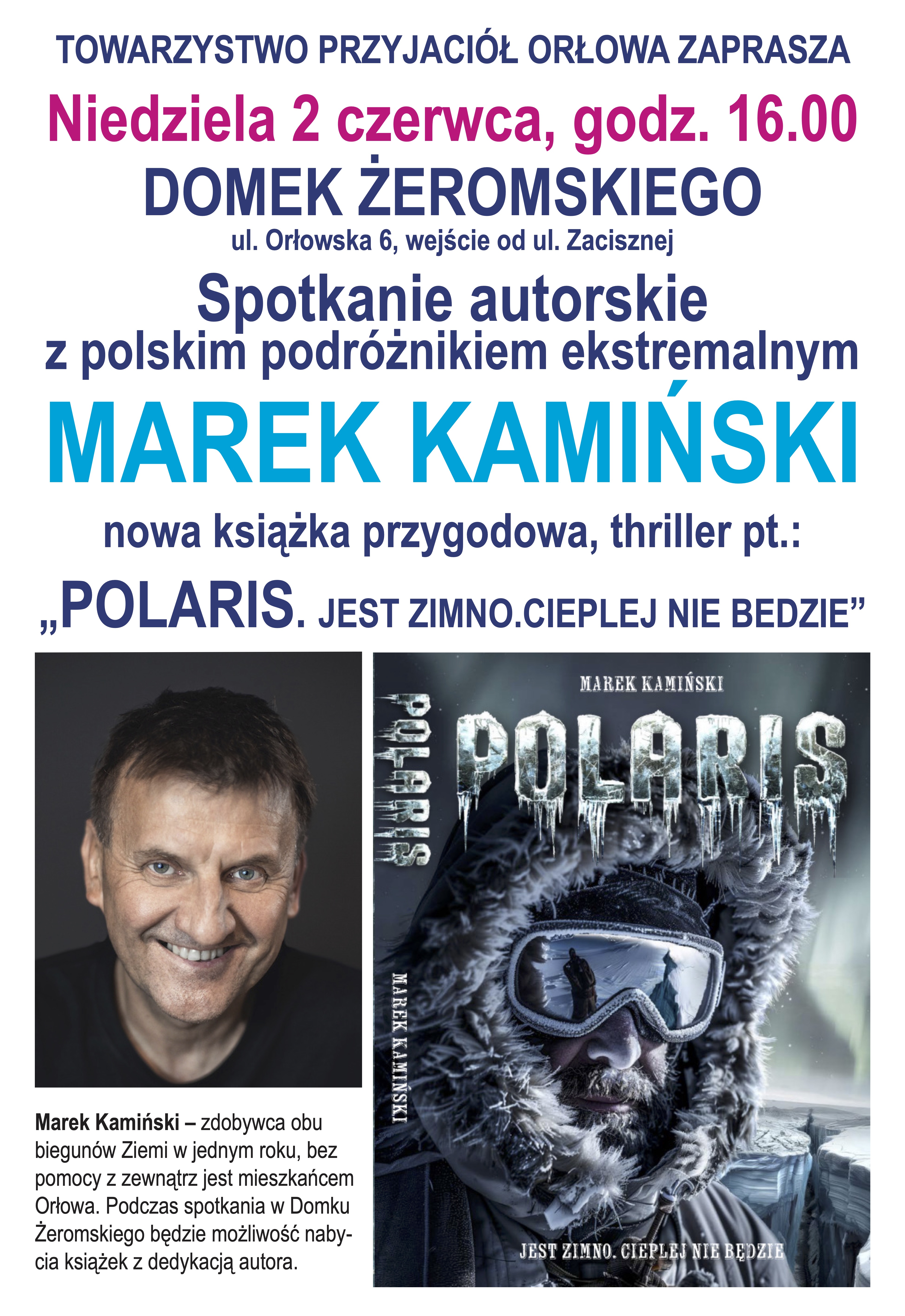 Sławomir Kitowski i Towarzystwo Przyjaciół Orłowa zapraszają w niedzielę, 2 czerwca o godz. 16.00 do Domku Żeromskiego na spotkanie autorskie z polskim podróżnikiem ekstremalnym Markiem Kamińskim, mieszkańcem Orłowa. Zdobywca obu biegunów Ziemi przedstawi swoją nową książkę przygodową, thriller pt. „POLARIS. Jest zimno. Cieplej nie będzie”. Będzie okazja do rozmowy i nabycia książki z dedykacją. Orłowo ul. Orłowska 6, wejście od ul. Zacisznej, wstęp wolny. Opublikowano: 23.05.2024 11:40 Autor: Dominika Sobiech (dominika.sobiech@gdynia.pl) Zmodyfikowano: 23.05.2024 14:35 Zmodyfikował: Dominika Sobiech