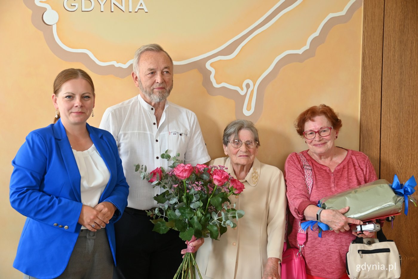 Co mówią gdyńscy stulatkowie, zapytani o sekret długiego życia? Pogoda ducha, zadowolenie z życia, bycie aktywnym. To szacowne grono 4 września powiększyło się o Panią Janinę Strusiewicz-Ochman, która spotkała się z prezydent Gdyni Aleksandrą Kosiorek. Na zdjęciu od lewej: prezydent Aleksandra Kosiorek oraz Pani Janina z córką i przyjacielem rodziny (fot. Karolina Szypelt)Z okazji urodzin pani Janina spotkała się w gdyńskim magistracie z prezydent Aleksandrą Kosiorek. Nie zabrakło życzeń, kwiatów i upominków. Jubilatka zaznaczyła, że nie zamierza zwalniać tempa. Jak podkreśliła, miło byłoby, gdyby w tym samym gronie mogła świętować 116. urodziny.Janina Strusiewicz-Ochman urodziła się 4 września 1924 roku. Walczyła o wolność ojczyzny w czasie II wojny światowej. Dzięki odwadze i odrobinie szczęścia udało jej się uciec z obozu pracy w Niemczech. Jej ojciec był ostatnim kwatermistrzem Powstania Warszawskiego. Ona sama wyszła za mąż za marynarza, który w 1939 roku bronił Helu przed najeźdźcą.Pani Janinie życzymy kolejnych lat w dobrym zdrowiu! Opublikowano: 12.09.2024 12:36 Autor: Dominika Sobiech (dominika.sobiech@gdynia.pl)