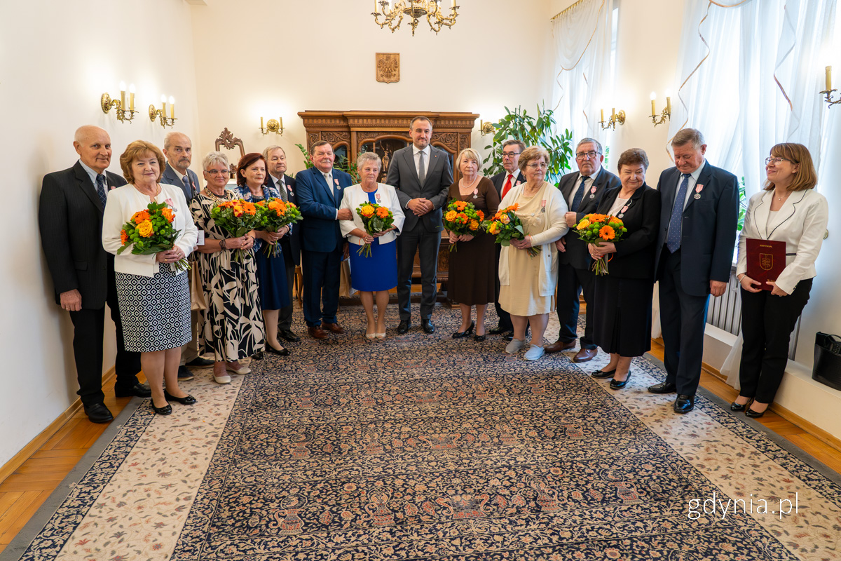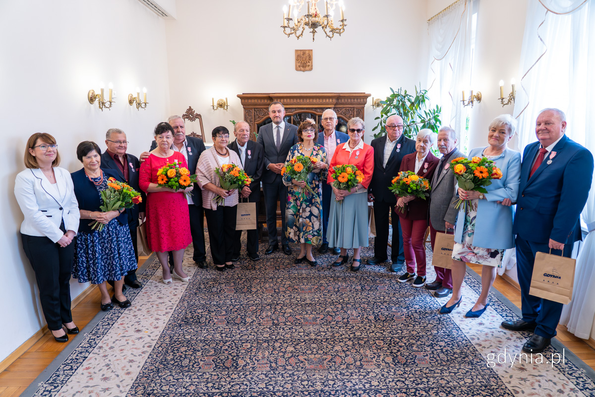 Małżeństwa z długoletnim stażem uhonorowane Uroczystości wręczenia Medali za Długoletnie Pożycie Małżeńskie to już tradycja. Kilka razy w roku gdyńscy małżonkowie z co najmmniej 50-letnim stażem spotykają się w Urzędzie Stanu Cywilnego w Gdyni. 22 września, kolejne pary odebrały odznaczenia z rąk Tomasza Augustyniaka, wiceprezydenta Gdyni. Były kwiaty, łzy wzruszenia i uśmiechy pełnych dumy bliskich.Medal za Długoletnie Pożycie Małżeńskie nadaje Prezydent Rzeczypospolitej Polskiej. Odznaczeni nim mogą być małżonkowie, którzy przeżyli co najmniej 50 lat w jednym związku małżeńskim. Zgłoszenia jubileuszu wraz z wnioskiem o nadanie medali dokonują zainteresowani. Jubileusz uświetnił krótki koncert uczennicy Szkoły Muzycznej w Gdyni, Kaliny Twarowskiej przy akompaniamencie Macieja Gałązki.Jubilaci z godz. 13:00 wraz z wiceprezydentem Tomaszem Augustyniakiem i Iwoną Tyczyńską, zastępcą kierownika USC w Gdyni // fot. Michał SałataO godz. 13:00 medale odebrali:Krystyna i Lech Banasiakowie / Barbara i Romuald Czesnowscy / Gabriela i Marian Dobrolińscy / Ewa i Janusz Dziubińscy / Krystyna Hellich-Ilijewa i Nikoła Ilijew / Felicja i Witold Jagiełkowie / Ewa i Bogusław Jakubowscy.Jubilaci z godz. 14:00 wraz z wiceprezydentem Tomaszem Augustyniakiem i Iwoną Tyczyńską, zastępcą kierownika USC w Gdyni // fot. Michał SałataO godz. 14:00 medale odebrali:Irena i Jarosław Kaławie / Krystyna i Janusz Langowie / Wita Ludwichowska-Pawłowska i Roman Pawłowski / Iwona i Jacek Matuszewscy / Grażyna i Andrzej Pietkiewiczowie / Barbara i Jerzy Ronkowscy.Jubilaci z godz. 15:00 wraz z wiceprezydentem Tomaszem Augustyniakiem i Iwoną Tyczyńską, zastępcą kierownika USC w Gdyni // fot. Michał SałataO godz. 15:00 medale odebrali:Elżbieta i Zenon Rosińscy / Zofia i Jerzy Sobczykowie / Elżbieta i Piotr Szutenbergowie / Teresa i Jan Topyłowie / Wiesława i Stanisław Tudkowie / Krystyna i Stanisław Waszniewscy / Elżbieta i Edward Wionczkowie.Z okazji Złotych Godów składamy serdeczne gratulacje wszystkim Parom świętującym ten wyjątkowy jubileusz.Niech kolejne wspólne lata będą wypełnione miłością i wzajemnym szacunkiem.Życzymy dużo zdrowia, codziennej radości. Niech każdy dzień przynosi nowe powody do uśmiechu i wdzięczności za wspólną drogę. Seniorzy świętują. Barwny marsz przeszedł ulicą Świętojańską Uśmiechnięci i zadowoleni z życia – tacy właśnie są gdyńscy seniorzy. Ulicami miasta przeszedł marsz z okazji Międzynarodowego Dnia Osób Starszych.Barwny marsz odbył się już po raz siódmy w Gdyni. Seniorzy przy akompaniamencie orkiestry świętowali Pomorski Dzień Seniora. Tłumnie wyruszyli sprzed Urzędu Miasta, następnie podążyli ulicą Świętojańską. Przemarsz dotarł na plac Kaszubski, gdzie prezydent Gdyni Aleksandra Kosiorek i wiceprezydent Gdyni Tomasz Augustyniak wygłosili okolicznościowe przemówienia. Marsz Seniora w Gdyni organizuje Fundacja Adaptacja, na co dzień wspierająca osoby starsze.Gdyńscy seniorzy uczcili Międzynarodowy Dzień Osób Starszych // fot. Michał Puszczewicz Opublikowano: 09.10.2025 10:10 Autor: Dominika Sobiech (dominika.sobiech@gdynia.pl) Zmodyfikowano: 09.10.2025 10:25 Zmodyfikował: Dominika Sobiech