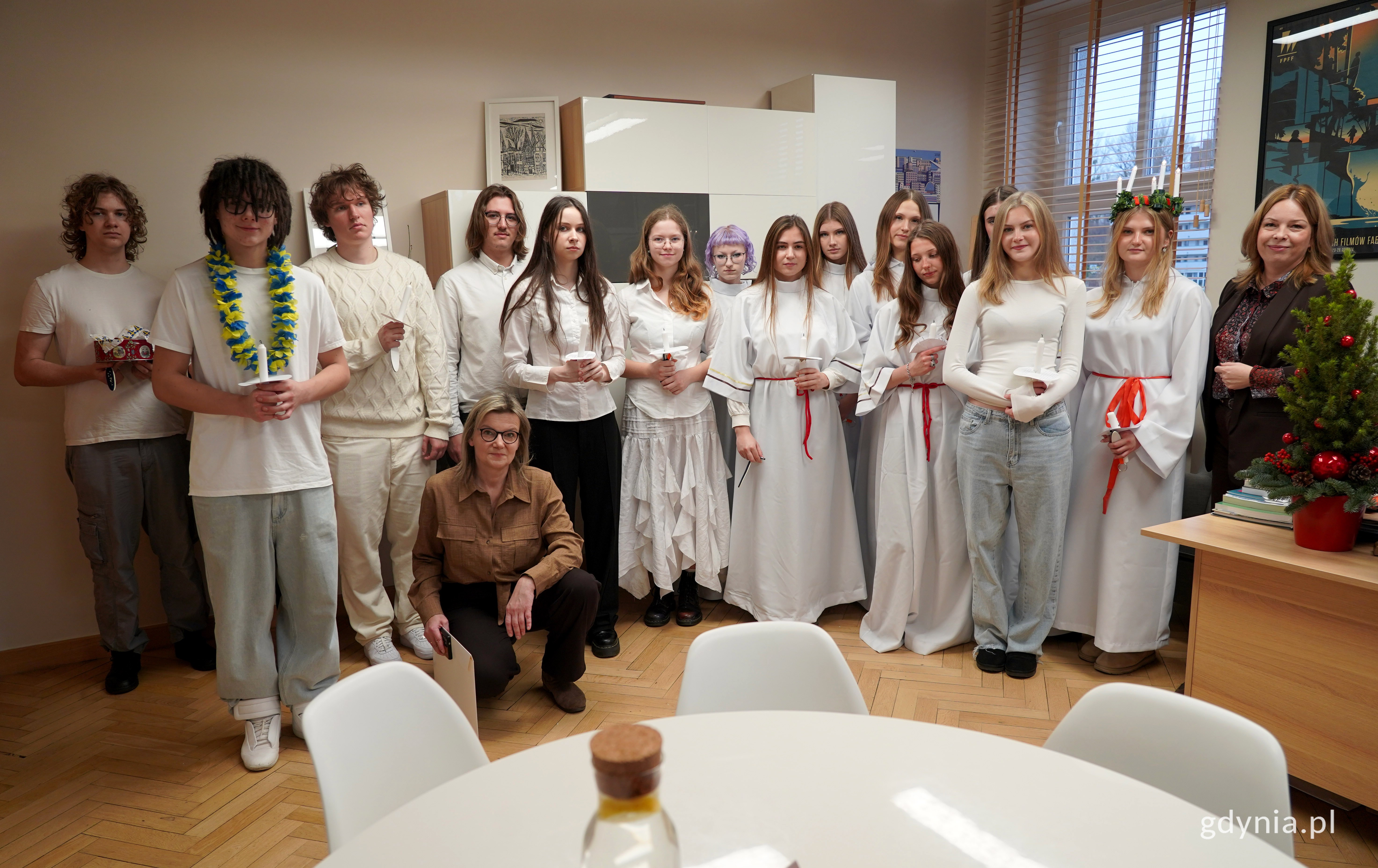 12 grudnia korytarze gdyńskiego magistratu rozświetliła procesja dziewcząt i chłopców w białych szatach niosących świece i śpiewających kolędę Sankta Lucia. Prowadziła ich św. Łucja, patronka światła. Były szwedzkie pieśni adwentowe i słodkie pierniczki. Tak uczniowie II Liceum Ogólnokształcącego kultywują pochodzącą ze Szwecji tradycję. Uczniowie II LO z nauczycielką j. szwedzkiego Anną Ćwiklińską-Rutką w gabinecie wiceprezydentki Oktawii Gorzeńskiej // fot. Karolina SzypeltOrszak św. Łucji przywitała wiceprezydentka Oktawia Gorzeńska. Było śpiewanie świątecznych pieśni, rozmowy wokół edukacji oraz słodkie pierniczki. Goście zostali obdarowani drobnymi upominkami.Kult św. Łucji z Syrakuz pochodzi z Włoch, jednak najbardziej okazałą oprawę ma w Skandynawii, głównie w Szwecji i Norwegii, gdzie 13 grudnia organizowane są procesje na cześć patronki. Data ta symbolizuje wydłużający się dzień, w którym św. Łucja przychodzi ze światłem i je rozdaje. Dziewczęta ubrane w białe suknie ze świecami w dłoniach przemierzają ulice. Towarzyszą im chłopcy w spiczastych czapkach (gwiezdni chłopcy). Uczestnicy częstują pierniczkami i kawą, dla pokrzepienia po ciężkiej nocy. Jak na Skandynawię przystało, tradycja tradycją, ale nie należy nikogo wyłączać czy sprawiać, by poczuł się niechciany. Dlatego do wspólnego pochodu zapraszane są dzieci i młodzież różnych wyznań oraz ci, dla których Szwecja nie jest krajem urodzenia. Opublikowano: 18.12.2025 11:54 Autor: Dominika Sobiech (dominika.sobiech@gdynia.pl)