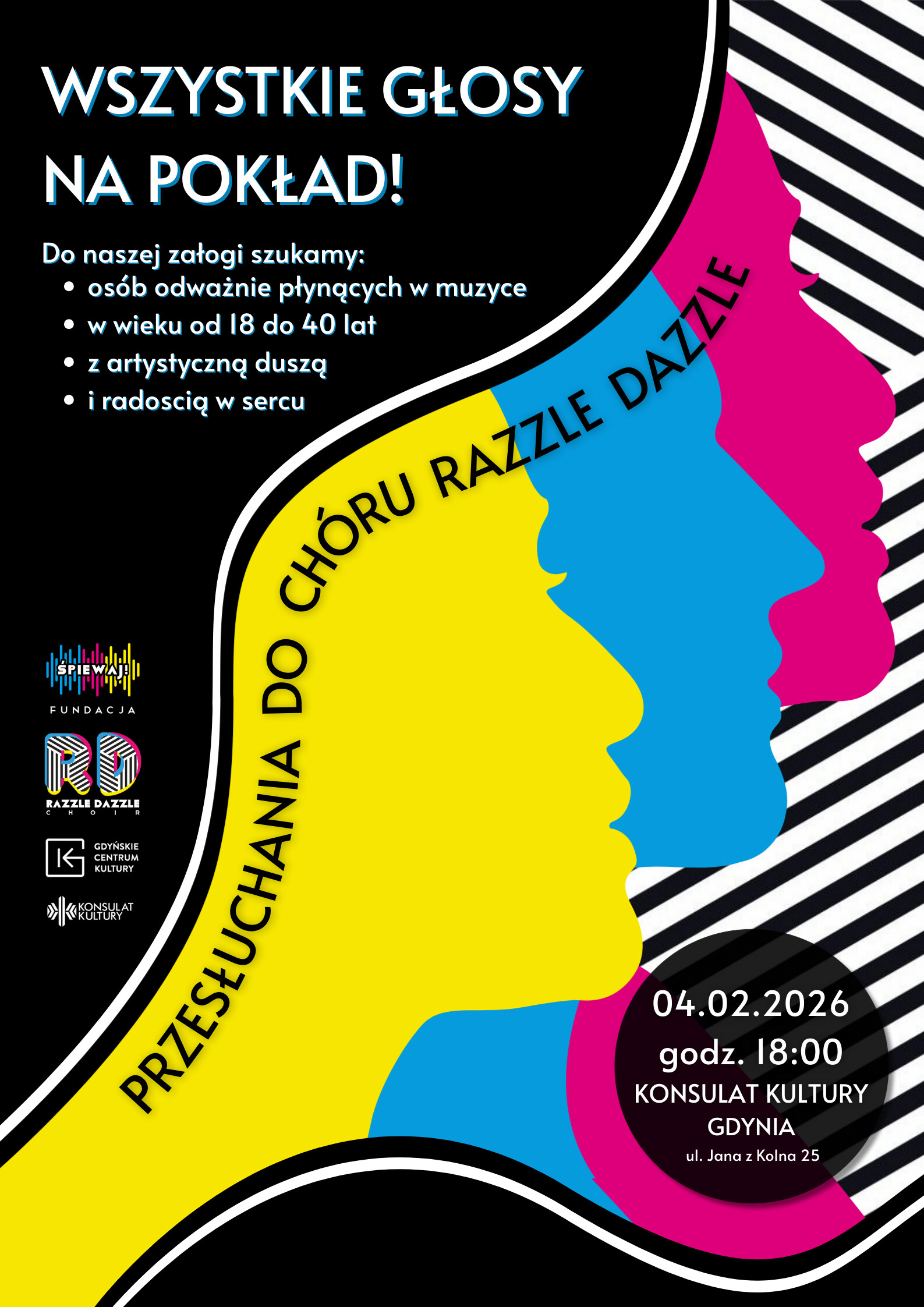 4 lutego o godz. 18:00 w Konsulacie Kultury (ul. Jana z Kolna 25) Razzle Dazzle Choir prowadzić będzie przesłuchania do chóru. Poszukiwane są głosy lekkie i donośne w wieku 18-40 lat. Chór od 2018 roku płynie pod banderą Fundacji „Śpiewaj!” – Best NGO w Gdyni 2022. Nie przegap okazji i wypłyń na szerokie wody pełne dźwięków z załogą Razzle Dazzle!Szczegóły na stronie www.razzledazzle.pl. Opublikowano: 29.01.2026 14:57 Autor: Dominika Sobiech (dominika.sobiech@gdynia.pl) Zmodyfikowano: 29.01.2026 15:34 Zmodyfikował: Dominika Sobiech