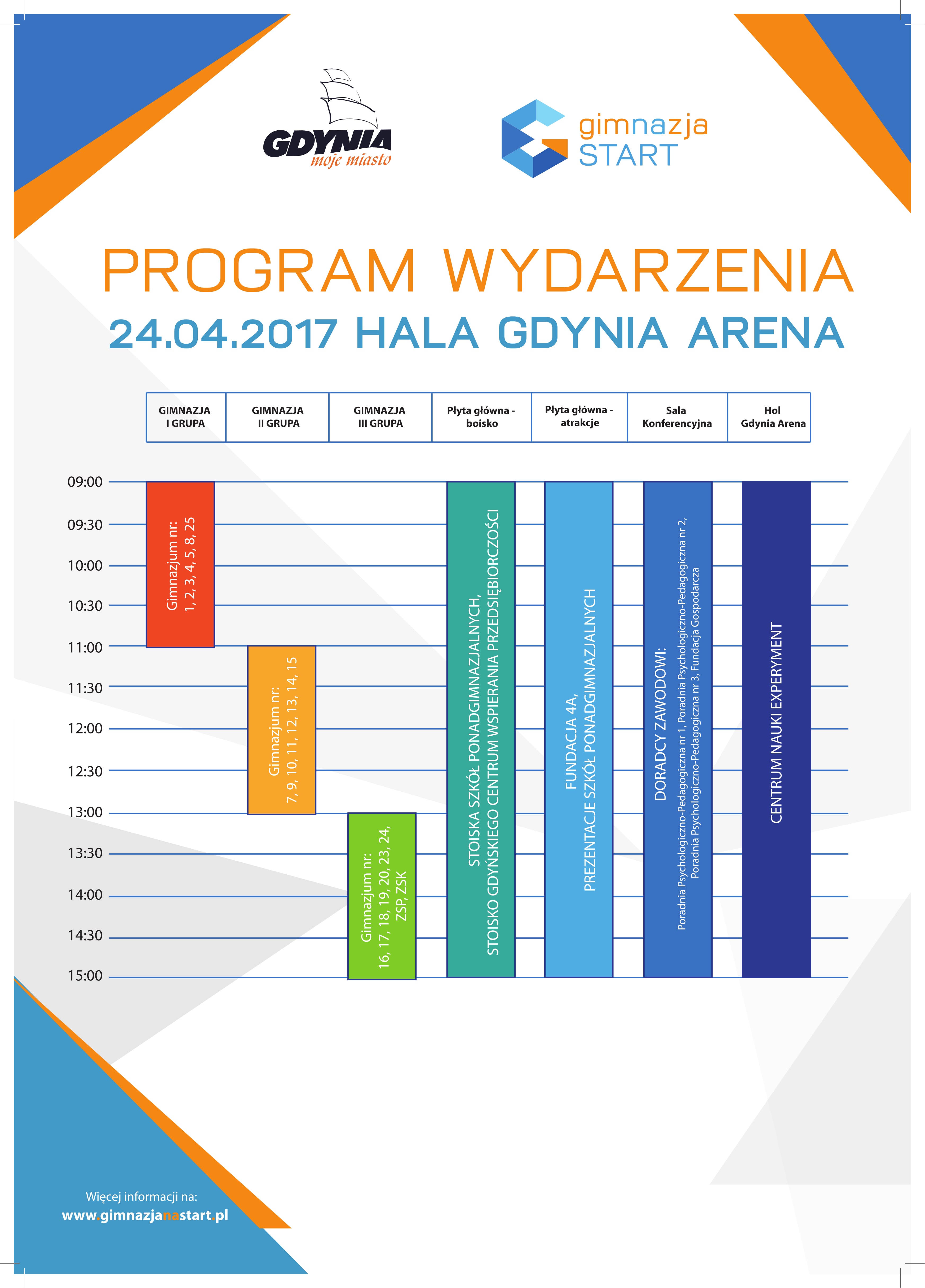 Już 24 kwietnia w hali Gdynia Arena odbędzie się kolejna edycja giełdy szkół „Gimnazja na Start”! Na wydarzenie zapraszamy uczniów klas III gdyńskich gimnazjów.W programie między innymi: - prezentacje gdyńskich szkół ponadgimnazjalnych - spotkania z doradcami zawodowymi - oferta gdyńskiego Centrum Wspierania Przedsiębiorczości - Fundacja 4A i pokaz drukowania 3D- eksperymenty fizyczne w wykonaniu Centrum Nauki EXPERYMENT Program Giełdy Szkół: Więcej informacji o wydarzeniu na stronie: www.gimnazjanastart.pl oraz na Facebooku Do pobrania PROGRAM "GIMNAZJA NA START" do pobrania pdf393kb Opublikowano: 11.04.2017 15:56 Autor: Aleksandra _Rzewuska (a.rzewuska@gdynia.pl) Zmodyfikowano: 13.04.2017 09:48 Zmodyfikował: Aleksandra Rzewuska
