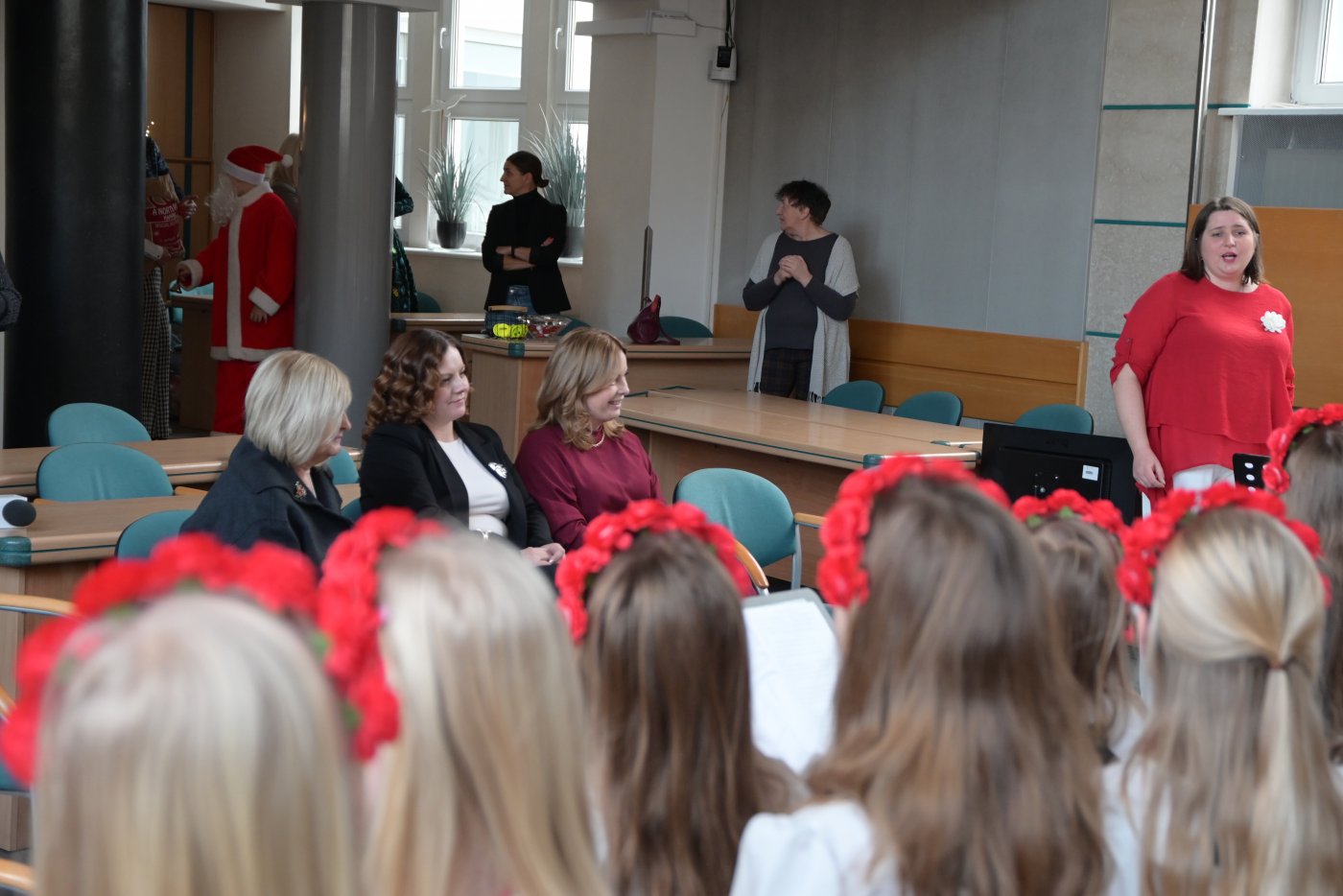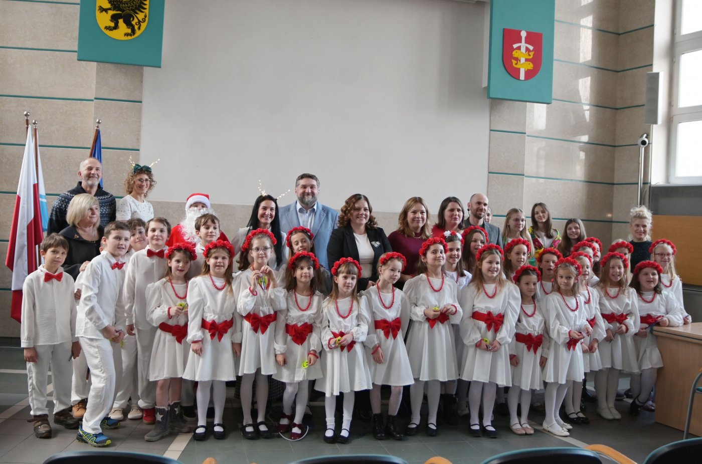 Kto tak pięknie śpiewa – pytali pracownicy Urzędu Miasta Gdyni, kiedy mijali salę, w której zwykle obradują radni. Uczniowie Szkoły Podstawowej nr 13 tradycyjnie odwiedzili gdyński urząd i zaprezentowali świąteczny repertuar, pod batutą kierowniczki chóru Halyny Panas. Ponad trzydziestu uczniów „trzynastki” zaśpiewało polskie kolędy i przedstawiło świąteczny program. Przybyliśmy z kolędami polskimi, z piosenką do pań prezydent i urzędników z naszego Urzędu Miasta i chcemy wprowadzić państwa w świąteczną atmosferę. Przedstawimy pieśni przygotowane przez zespół. Są to dzieci od klasy najmłodszej, od pierwszej do piątej włącznie – mówi dyrektor Szkoły Podstawowej nr 13, Jolanta Matulewicz. Przygotowaniami do świątecznego programu, zajęła się nauczycielka Halyna Panas. Mamy wspaniałe dzieci, z którymi występujemy. Śpiewamy, lubimy śpiewać, śpiewamy dzisiaj kolędy, śpiewamy polskie piosenki i zagraniczne. Dziś odwiedziliśmy państwa, żeby złożyć muzyczne życzenia – mówi kierowniczka chóru Szkoły Podstawowej nr 13, Halyna Panas. Hektor z klasy 7a podkreśla, że przygotowania zajęły bardzo dużo czasu, ale uczniowie ze Szkoły Podstawowej nr 13 w Gdyni lubią występować, więc czasochłonne przygotowania, to dla nich sama przyjemność. Jedna próba mogła nam zająć nawet dwie i pół godziny, no ale cóż, do takich występów trzeba się przygotować – podsumował Hektor, który podczas wizyty pełnił rolę świętego Mikołaja. Prezydent Gdyni, Aleksandra Kosiorek i wiceprezydentka Oktawia Gorzeńska, nie pozostały dłużne małym kolędnikom i odwdzięczyły się świątecznymi podarkami. Galeria zdjęć Pobierz galerię Uczniowie SP nr 13 podczas spotkania z prezydent Gdyni, Aleksandrą Kosiorek, wiceprezydentką, Oktawią Gorzeńską, przewodniczącym Rady Miasta Tadeuszem Szemiotem podczas wspólnego zdjęcia (fot. Dorota Patzer) Pobierz zdjęcie Uczniowie SP nr 13 wykonali świąteczny program (fot. Dorota Patzer) Pobierz zdjęcie Kolędownicy z SP nr 13 przedstawili świąteczny program i zaśpiewali świąteczne piosenki (fot. Dorota Patzer) Pobierz zdjęcie Uczniowie SP nr 13 zaśpiewali świateczne piosenki przed publicznością: prezydent Gdyni, Aleksandrą Kosiorek, wiceprezydent Gdyni Oktawią Gorzeńską (fot. Dorota Patzer) Pobierz zdjęcie Kolędownicy z SP nr 13 przedstawili autorski program i zaśpiewali świąteczne piosenki (fot. Dorota Patzer) Pobierz zdjęcie Kolędownicy z SP nr 13 przedstawili autorski program i zaśpiewali świąteczne piosenki (fot. Dorota Patzer) Pobierz zdjęcie Kolędownicy z SP nr 13 przedstawili autorski program i zaśpiewali świąteczne piosenki (fot. Dorota Patzer) Pobierz zdjęcie Kolędownicy z SP nr 13 przedstawili autorski program i zaśpiewali świąteczne piosenki (fot. Dorota Patzer) Pobierz zdjęcie Prezydent Gdyni, Aleksandra Kosiorek, przekazała młodym kolędnikom świąteczne prezenty (fot. Dorota Patzer) Pobierz zdjęcie Warunki pobierania Wszelkie prawa do zdjęć lub grafik prezentowanych w ramach portalu, należą do Prowadzącego portal lub do podmiotów z nim współpracujących i podlegają ochronie prawnej. Prowadzący portal zezwala na kopiowanie i przedstawianie utworów jedynie w celach niekomercyjnych oraz pod warunkiem zachowania go w oryginalnej postaci i zachowaniem kontekstu tematu, do którego zostało wykorzystaneprzez redakcję gdynia.pl. Opublikowane materiały powinny zawsze zawierać źródło, czyli adres strony www.gdynia.pl. Na publikowanie utworów w innych celach wymagana jest zgoda właściciela strony czyli Prowadzącego portal. Opublikowano: 18.12.2025 11:14 Autor: Dorota Patzer (dorota.patzer@gdynia.pl) Zmodyfikowano: 23.12.2025 10:59 Zmodyfikował: Aleksandra Dylejko