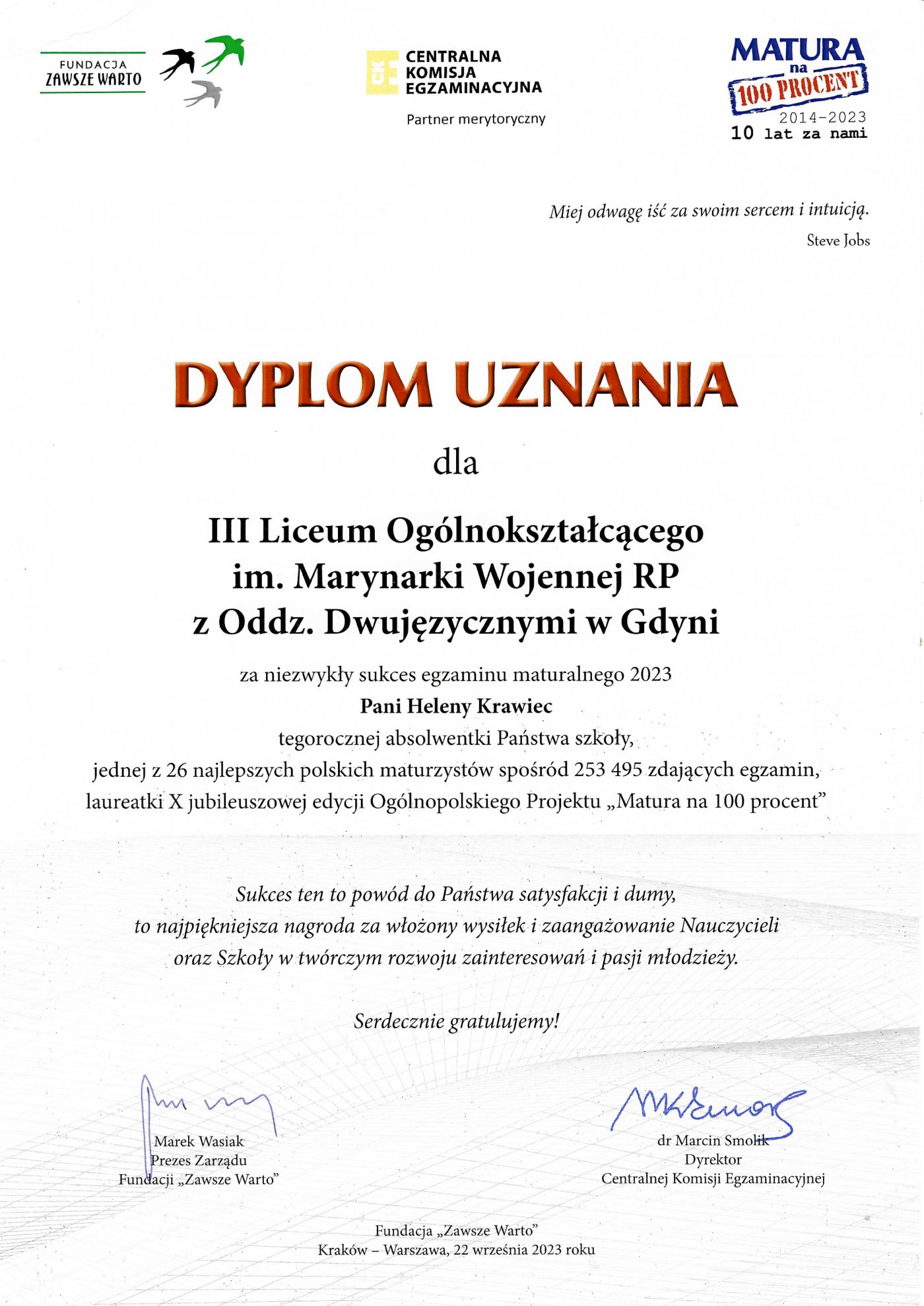 Od dziesięciu lat Fundacja „Zawsze Warto” we współpracy z Centralną Komisją Egzaminacyjną organizuje „Ogólnopolski Projekt Matura na 100 procent”. W piątek, 22 września, najlepsi maturzyści spotkali się w Centrum Nauki Kopernik w Warszawie. W elitarnym gronie znalazła się absolwentka Trójki. Projekt „Matura na 100%” ma na celu wyróżnianie i docenienie najlepszych polskich maturzystek i maturzystów, a także szkół i środowisk, które tworzą warunki do osiągania znakomitych wyników na maturze. W piątek, 22 września, w Centrum Nauki Kopernik w Warszawie odbyła się uroczysta gala podsumowująca X edycję Ogólnopolskiego Projektu „Matura na 100 procent”. Gospodarzami Gali byli: Adam Struzik – Marszałek Województwa Mazowieckiego i Rafał Trzaskowski – Prezydent Miasta Stołecznego Warszawy. - To wyjątkowy dzień dla zdolnych młodych ludzi, podsumowanie pewnego etapu w ich życiu. Gdyńska edukacja od lat utrzymuje się na wysokim poziomie, czego dowodem jest sukces absolwentki gdyńskiej Trójki i znakomite wyniki absolwentów kolejnych dwóch szkół. Miniony rok szkolny był kolejnym trudnym rokiem jednak nasze środowisko edukacyjne mimo to osiągnęło kolejne sukcesy jak chociażby znakomite wyniki matur stawiające Gdynię w czołówce największych polskich miast – mówi Bartosz Bartoszewicz, wiceprezydent Gdyni ds. jakości życia. Nie zabrakło przedstawiciela miasta Gdyni – Bartosza Bartoszewicza, wiceprezydenta ds. jakości życia, który pojechał pogratulować jednej z finalistek razem z Wiesławem Kosakowskim, dyrektorem III LO. W elitarnym gronie 26 finalistów, które najlepiej zdały tegoroczny egzamin maturalny znalazła się bowiem Helena Krawiec – absolwentka klasy humanistycznej III Liceum Ogólnokształcącego im. Marynarki Wojennej RP w Gdyni. Uczennica uzyskała ze wszystkich zdawanych egzaminów maturalnych co najmniej 90 procent punktów, w tym 100 procent punktów z następujących egzaminów: ustnych – z języka polskiego oraz z języka angielskiego oraz pisemnych: język polski – poziom podstawowy, język polski – poziom rozszerzony, filozofia – poziom rozszerzony. Absolwentka gdyńskiej Trójki została przyjęta na Uniwersytet Warszawski, gdzie od 1 października będzie studentką Międzydziedzinowych Indywidualnych Studiów Humanistycznych i Społecznych (MISH). Do egzaminu dojrzałości w 2023 roku przystąpiło w całym kraju ponad ćwierć miliona absolwentów szkół ponadpodstawowych. Tylko 294 tegorocznych maturzystek i maturzystów uzyskało ze wszystkich egzaminów – zarówno obowiązkowych, jak i dodatkowych – w części ustnej oraz w części pisemnej wynik od 90 do 100 procent. Właśnie z tej grupy najlepszych maturzystek i maturzystów wyłonione zostało wąskie grono najlepszych maturzystów. Wśród finalistów znaleźli się uczniowie trzech gdyńskich liceów. Podobnie jak laureatka, znakomity wynik na maturze uzyskała absolwentka także III Liceum Ogólnokształcącego im. Marynarki Wojennej RP Zofia Hejenkowska, Kacper Jank z VI Liceum Ogólnokształcącego im. Wacława Sierpińskiego oraz Hanna Praska-Wenderlich z II Liceum Ogólnokształcącego im. Adama Mickiewicza. Wszystkim gratulujemy i trzymamy kciuki za dalsze sukcesy. Galeria zdjęć Pobierz galerię Dyplom uznania dla III LO // fot. III LO Pobierz zdjęcie Warunki pobierania Wszelkie prawa do zdjęć lub grafik prezentowanych w ramach portalu, należą do Prowadzącego portal lub do podmiotów z nim współpracujących i podlegają ochronie prawnej. Prowadzący portal zezwala na kopiowanie i przedstawianie utworów jedynie w celach niekomercyjnych oraz pod warunkiem zachowania go w oryginalnej postaci i zachowaniem kontekstu tematu, do którego zostało wykorzystaneprzez redakcję gdynia.pl. Opublikowane materiały powinny zawsze zawierać źródło, czyli adres strony www.gdynia.pl. Na publikowanie utworów w innych celach wymagana jest zgoda właściciela strony czyli Prowadzącego portal. Opublikowano: 25.09.2023 08:44 Autor: Zuzanna Kasprzyk (z.kasprzyk@gdynia.pl) Zmodyfikowano: 28.09.2023 12:18 Zmodyfikował: Agnieszka Janowicz