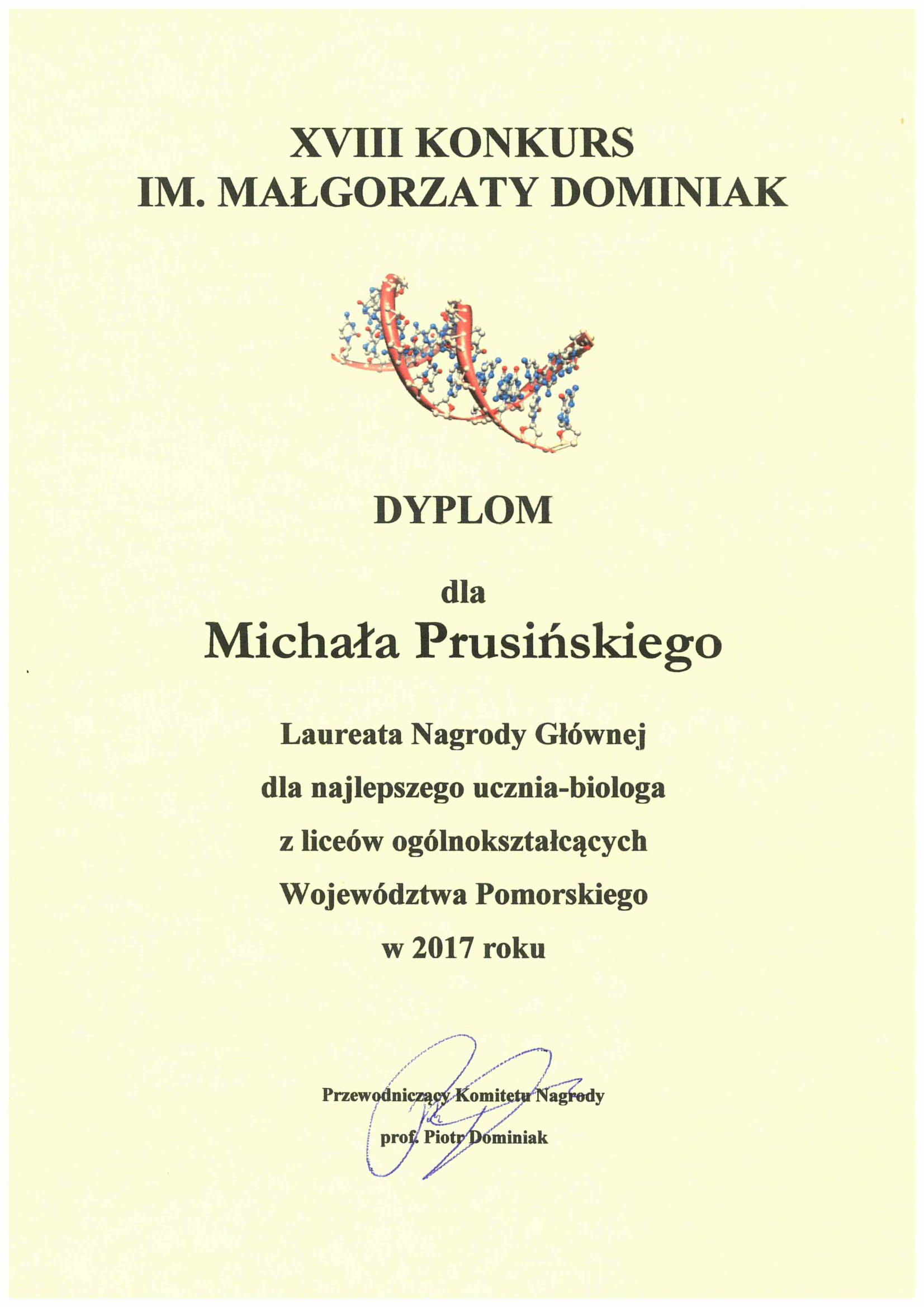 Uczeń I Akademickiego LO w Gdyni, Michał Prusiński, został laureatem prestiżowego Konkursu im. Małgorzaty Dominiak na najlepszego ucznia biologa z liceów ogólnokształcących z województwa pomorskiego w 2017 r.Wielkim sukcesem zakończyły się jego trzyletnie zmagania z biologią. Michał w 2017 roku został laureatem etapu centralnego Olimpiady Biologicznej, co zapewniło mu zwolnienie z matury z wynikiem 100% i preferencje na renomowane studia. Praca badawcza Michała pod kierunkiem mgr inż. Leszka Ciesielskiego pt. „Charakterystyka bioty śluzowców w wybranym rezerwacie Trójmiejskiego Parku Krajobrazowego na tle regionu" została wyróżniona w Warszawie. We wcześniejszych latach Michał był laureatem etapu okręgowego Olimpiady Biologicznej, a jego prace były wyróżnione niezależnie przez Regionalnego Konserwatora Przyrody i Nadleśnictwa Gdańsk oraz Trójmiejski Park Krajobrazowy. Wraz z całym zespołem prowadzonym przez dyrektora szkoły z Koła Pasjonatów Biologii w I ALO, z powodzeniem brał udział w kolejnych edycjach konkursu E(x)plory. Gratulujemy pasji badawczej i wybitnych wyników Michałowi i uczniom I Akademickiego LO w Gdyni! Opublikowano: 25.06.2017 10:38 Autor: Aleksandra _Rzewuska (a.rzewuska@gdynia.pl)