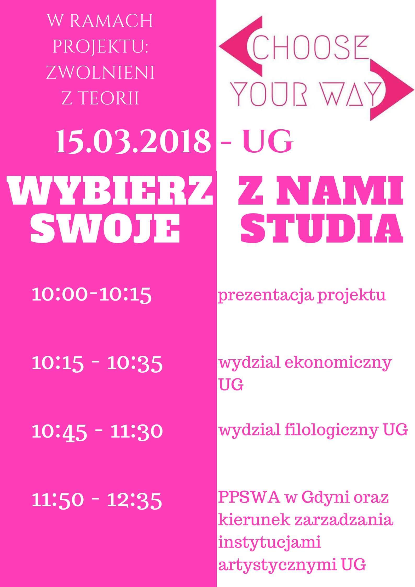 Dominika Chrząszcz, Paulina Koziorzemska, Anna Kabath i Marianna Wolff są uczennicami trzeciej klasy II Liceum Ogólnokształcącego z Oddziałami Dwujęzycznymi im. Adama Mickiewicza w Gdyni i w tym roku szkolnym biorą udział w olimpiadzie "Zwolnieni z Teorii". W naszej ocenie wielu młodych ludzi nie ma pomysłu na siebie i na to co robić po maturze. Wybór studiów, przyszłości i swojej własnej drogi życiowej to niełatwa decyzja - mówią uczennice gdyńskiej "Dwójki". I dodają:- Tutaj z pomocą przychodzimy my i nasz projekt społeczny, który powstał z myślą o osobach młodych, niezdecydowanych, które nie są jeszcze pewne jaką drogę wybrać.Już w marcu, specjalnie dla gdyńskich gimnazjalistów i w ramach projektu "Choose your way", zostaną zorganizowane spotkania ze studentami Uniwersytetu Gdańskiego i Politechniki Gdańskiej. Pierwsze spotkanie odbędzie się 15 marca o godzinie 10:00 w auli II Liceum Ogólnokształcącego w Gdyni ul. Wolności 22 B. Kolejne spotkanie, potwierdzone przez władze Gdańskiego Uniwersytetu Medycznego, odbędzie się 27 marca o godzinie 9.00 również w II LO. Studenci szczegółowo opowiedzą o kierunkach, uczelniach i perspektywach zatrudnienia, co na pewno pomoże licealistom w podjęciu decyzji o wyborze szkoły. Wszelkie informacje na temat projektu i dat planowanych spotkań można znaleźć na stronie projektu na Facebooku. Wszystkich zainteresowanych zapraszamy do obserwowania i śledzenia działań licealistek i ich niezwykłego, społecznego projektu. Opublikowano: 14.03.2018 08:53 Autor: Aleksandra _Rzewuska (a.rzewuska@gdynia.pl) Zmodyfikowano: 26.03.2018 08:50 Zmodyfikował: Dorota Nelke