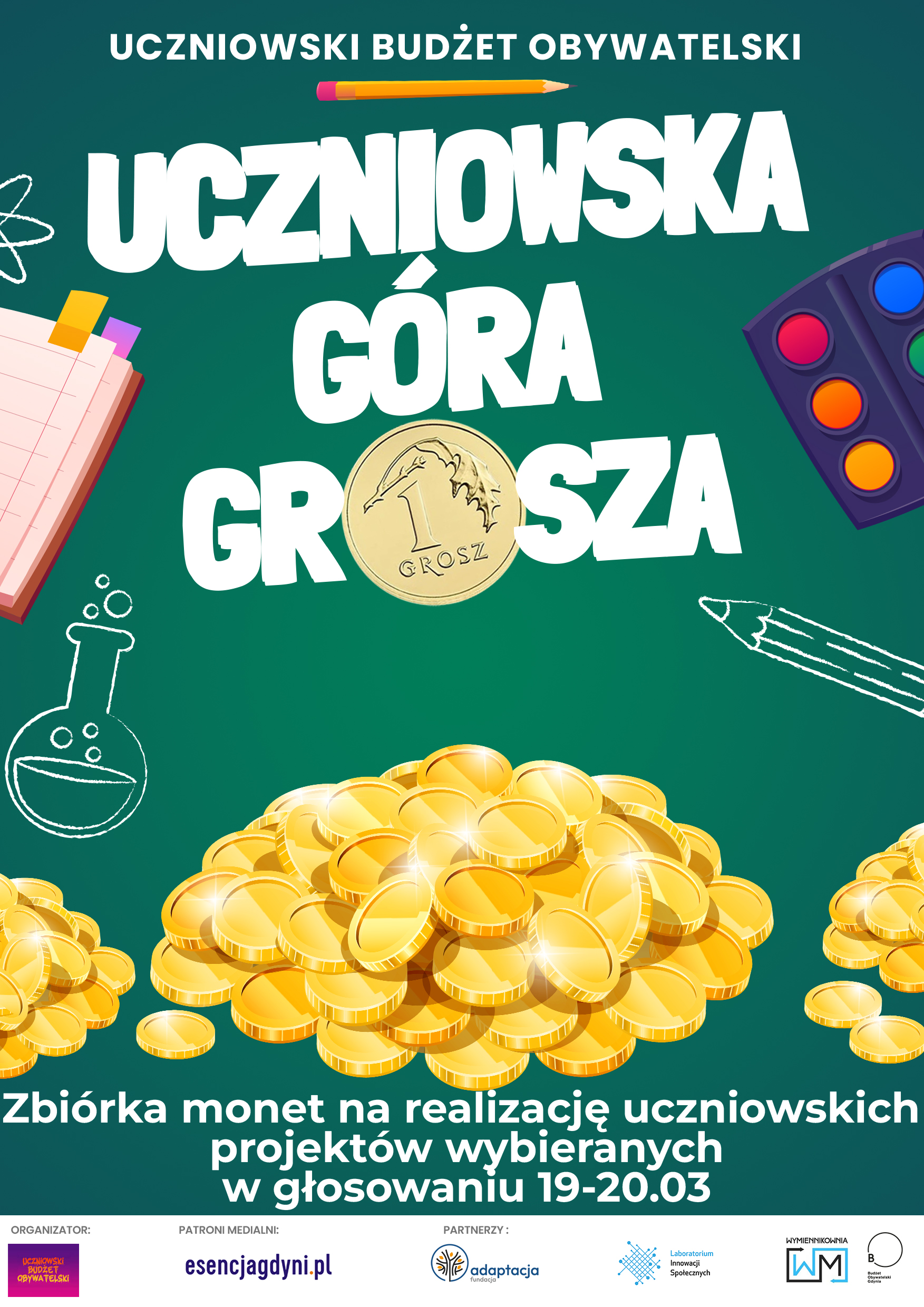 W czternastu Gdyńskich szkołach dobiega końca akcja „Uczniowska góra grosza” w ramach III już edycji Uczniowskiego Budżetu Obywatelskiego. To jedna z wielu opcji wsparcia tej inicjatywy, nie tylko przez samych uczniów, ale wszystkich mieszkańców Gdyni. Uczniowska góra grosza to zbiórka monet, które w całości zostaną przeznaczone na realizację projektów, wybieranych w głosowaniach organizowanych w szkołach, w ramach Uczniowskiego Budżetu Obywatelskiego. Specjalnie oznaczone puszki, do których można wrzucać „złote” monety wystawione są w następujących lokalizacjach: Szkole Podstawowej nr 6,Szkole Podstawowej nr 12, Szkole Podstawowej nr 17, Szkole Podstawowej nr 26, Szkole Podstawowej nr 29, Szkole Podstawowej nr 31, Szkole Podstawowej nr 37, Szkole Podstawowej nr 39,Szkole Podstawowej nr 40, Szkole Podstawowej nr 43, Szkole Podstawowej nr 52, Specjalnym Ośrodku Szkolno-Wychowawczym nr 2,XVII Liceum Ogólnokształcącym. UBO to pomysł dwojga uczniów I Akademickiego Liceum Ogólnokształcącego w Gdyni – Hanny Wcisło i Stanisława Koryckiego. Projekt działa na zasadach podobnych do tradycyjnego budżetu obywatelskiego, jednak w tym przypadku uczniowie szkół uczestniczących w projekcie sami zgłaszają swoje pomysły, a także uczestniczą w procesie głosowania. 3 lata temu, kiedy wystartowała inicjatywa Uczniowskiego Budżetu Obywatelskiego wzięły w niej udział dwie szkoły, teraz pod skrzydłami UOB jest już 26 placówek. Akcja ma na celu nie tylko zaangażowanie uczniów i uczennic w życie społeczne, ale przy okazji promuje proekologiczną postawę. Góra grosza jest jedną z proponowanych metod zbiórki funduszy na zgłaszane przez uczniów projekty ulepszenia przestrzeni w szkołach. W tym roku oprócz zbiórki pieniędzy, dzięki współpracy z organizacją „Ubrania do Oddania” możliwe było również oddanie odzieży przekazując tym samym 1 zł za każdy kilogram pozyskanych rzeczy. Dzięki akcji „Strażnicy Klimatu” uczniowie mogli zebrać potrzebne fundusze, poprzez oszczędność energii, lub niższe zużycie wody na jednego ucznia. Poza wspomnianymi działaniami, szkoły mogą zbierać środki na własną rękę, organizując m.in. różne kiermasze. - Genialna inicjatywa Młodych mieszkańców Gdyni. Z dumą przywołuję sukces poprzednich edycji i zachęcam zarówno szkoły, jak i mieszkańców do aktywnego udziału w akcji. Szkołom, które biorą w nich udział życzę powodzenia w dalszej drodze do zrealizowania pomysłów w ramach budżetów uczniowskich. Z żywym zainteresowaniem będę śledził jakie pomysły spotkają się z uznaniem szkolnych społeczności – mówi Bartosz Bartoszewicz, wiceprezydent Gdyni ds. jakości życia. Po zakończeniu zbiórki, w pierwszej połowie lutego będą ogłoszone kwoty pieniędzy jakie zebrały szkoły. Następnie przy pomocy organizatorów uczniowie będą tworzyć i składać swoje projekty. Cała akcja zakończy się w marcu głosowaniem i ogłoszeniem zwycięzców.- Dzięki zaangażowaniu wiceprezydenta Bartosza Bartoszewicza szkoły na start otrzymały po 1000 zł. W międzyczasie placówki mogły we własnym zakresie podejmować działania promocyjne np. kiermasze, zrzutki, zbiórki itp., by zasilić swoje budżety. Uczniowska Góra Grosza jest akcją, dzięki której szkoły będą miały możliwość zebrania środków. Zbiórka jest adresowana nie tylko do społeczności szkolnej, ale też wszystkich mieszkańców – wyjaśnia Stanisław Korycki. "Uczniowski Budżet Obywatelski" organizowany jest przy wsparciu partnera strategicznego Fundacji Adaptacja oraz partnerów merytorycznych Laboratorium Innowacji Społecznych, w tym z Wymiennikownią – Młodzieżowym Centrum Innowacji Społecznych i Designu, portalem Esencja Gdyni oraz Wydziałem Edukacji w Gdyni. Informacji na temat tych wydarzeń można szukać m.in. na facebooku UBO, oraz na Instagramie. Do pobrania plakat promujący akcję Uczniowska Góra Grosza 2024 jpg1677kb Opublikowano: 18.01.2024 16:38 Autor: Aleksandra Regulska (aleksandra.regulska@gdynia.pl) Zmodyfikowano: 19.01.2024 15:38 Zmodyfikował: Agnieszka Janowicz