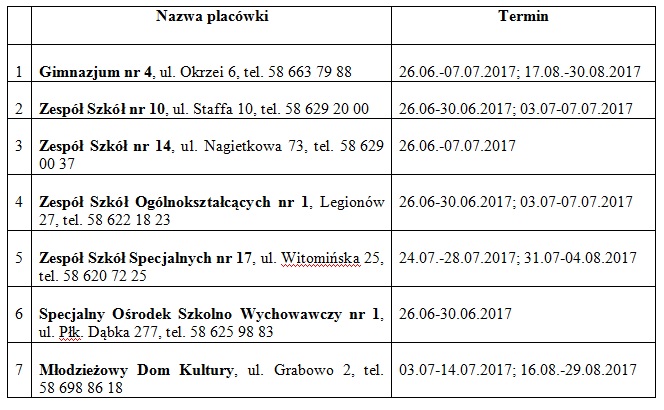 W trosce o komfort i wypoczynek najmłodszych mieszkańców, Gmina Miasta Gdyni jak co roku dofinansowuje program „Akcja Lato”, realizowany w gdyńskich placówkach oświatowych. Jest to oferta skierowana do dzieci i młodzieży, pozostających w mieście w czasie wakacji letnich. W tym roku w zajęciach przygotowanych przez siedem gdyńskich placówek, przygotowano miejsca dla ok. 550 uczestników. Oferta „Akcji Lato 2017” obejmuje m.in. organizację wycieczek krajoznawczych po Trójmieście i Kaszubach, wycieczki do ZOO, zawody i zajęcia ruchowe, wizyty w galeriach i muzeach, warsztaty artystyczne, gry i zabawy sportowe na salach gimnastycznych czy boiskach szkolnych.Gdzie i kiedy: Dodatkowo:W sierpniu każdego roku Gdynia organizuje również projekt „Gdynia Business Week” czyli intensywny, siedmiodniowy kursu dla uczniów gdyńskich szkół ponadgimnazjalnych, który ma na celu pogłębianie wiedzy w zakresie przedsiębiorczości i wzorowany jest na amerykańskim programie szkoły letniej Washington Business Week. W roku bieżącym organizację "GDYNIA BUSINESS WEEK" zaplanowano w terminie od 19 do 25 sierpnia. Gdynia aktywnie współpracuje z organizacjami pozarządowymi, które co roku otrzymują dotacje na organizację wypoczynku letniego dla dzieci i młodzieży z rodzin ubogich i zagrożonych wykluczeniem społecznym. W roku 2017 w ramach tej oferty dzieci i młodzież będą miały możliwość skorzystania z propozycji: - Gdyńskiego Stowarzyszenia "Familia", które organizuje półkolonie dla podopiecznych świetlic socjoterapeutycznych „Familia I” oraz „Familia II”, - Stowarzyszenia na rzecz Dzieci i Młodzieży "Vitava", dla dzieci ze świetlicy socjoterapeutycznej „Vitava” - Parafii Rzymsko-Katolickiej p.w. Matki Boskiej Różańcowej dla dzieci z dzielnicy Pustki Cisowskie-Demptowo.Więcej informacji o wszystkich ofertach wypoczynku letniego dla najmłodszych gdynian w artykule: "Wakacje w Gdyni". Opublikowano: 04.07.2017 12:17 Autor: Aleksandra _Rzewuska (a.rzewuska@gdynia.pl) Zmodyfikowano: 10.07.2017 08:41 Zmodyfikował: Aleksandra Rzewuska