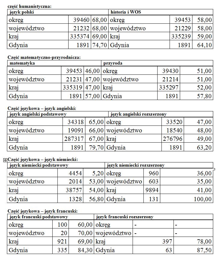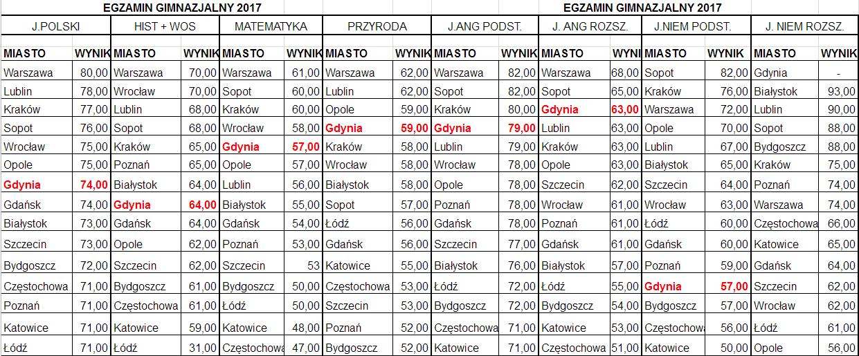 Znamy już oficjalne wyniki egzaminu gimnazjalnego 2017. Nasi gimnazjaliści zasłużyli na wspaniałe wakacje. Na tle województwa jak i całego kraju Gdynia ponownie wypadła znakomicie – powyżej średniej z każdej części egzaminu!Serdecznie gratulujemy uczniom dobrych wyników, a pedagogom konsekwentnego, wysokiego poziomu nauczania w gdyńskich szkołach! Wyniki egzaminu gimnazjalnego 2017: Opublikowano: 23.06.2017 11:02 Autor: Aleksandra _Rzewuska (a.rzewuska@gdynia.pl) Zmodyfikowano: 23.06.2017 11:04 Zmodyfikował: Aleksandra Rzewuska