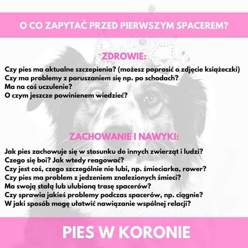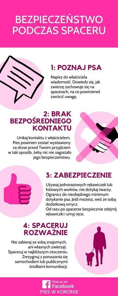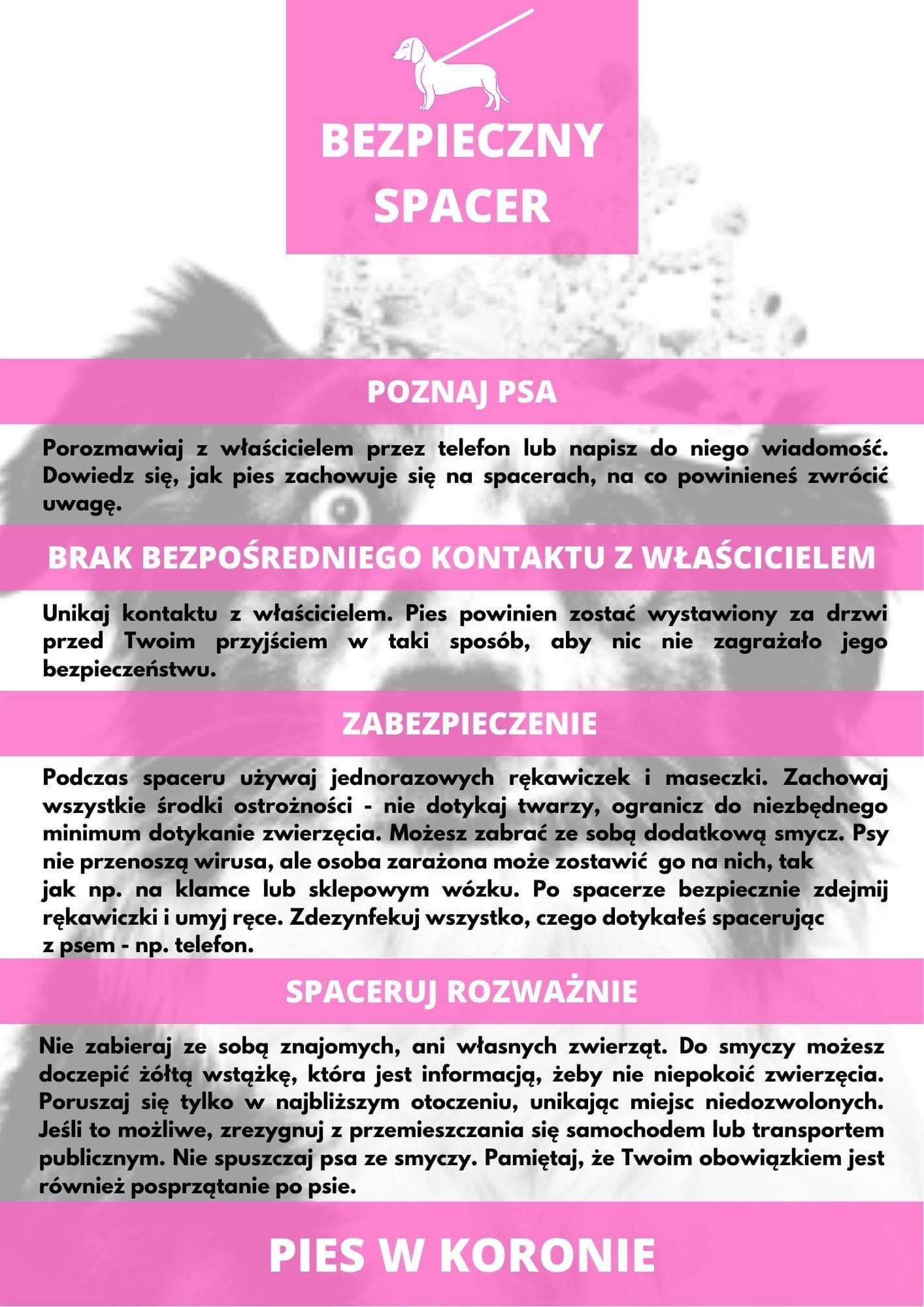 Jesienna fala zachorowań na COVID-19 powoduje, że coraz więcej osób zostaje objętych kwarantanną lub obawia się wyjścia z domu. Uniemożliwia to właścicielom psów wyjście na zewnątrz z pupilami w celu załatwienia ich potrzeb, nie wspominając o dłuższych spacerach. Obowiązek wyprowadzania psa możemy powierzyć rodzinie, sąsiadom bądź znajomym. Co jednak zrobić, gdy nie mamy kogo poprosić o pomoc? Ten problem rozwiązuje grupa wsparcia Pies w Koronie, która liczy już ponad 67 tysięcy osób. Dołącz do nich!O tej wspaniałej inicjatywie pisaliśmy już na początku kwietnia, kiedy obostrzenia były bardziej rygorystyczne, a wychodzenie z domu było dozwolone wyłącznie w uzasadnionych przypadkach. Obecnie jednak znacznie więcej mieszkańców Gdyni osób przebywa na kwarantannie niż kilka miesięcy temu, a co za tym idzie – więcej psiarzy może potrzebować pomocy. Grupa Pies w Koronie – inicjatywa psiarzy dla właścicieli czworonogówPodczas pierwszej fali koronawirusa, w połowie marca powstała grupa Pies w Koronie na Facebooku, która miała służyć usystematyzowaniu wiedzy na temat bezpieczeństwa zwierząt w czasie pandemii. Od tej pory mieszkańcy Gdyni i innych miast (osoby niepełnosprawne, przebywające na kwarantannie, seniorzy, kobiety w ciąży i wszyscy, którzy obawiają się wychodzenia z domu) mogą poprosić wolontariuszy o opiekę nad ich czworonogiem. Do grupy dołącza również wielu gdynian , którzy chcą udzielić pomocy innym – w formie spaceru z psem lub opieki nad dowolnym zwierzęciem. Jak mogę otrzymać pomoc lub ją zaoferować?Jeśli potrzebujesz pomocy, zapisz się do grupy, a następnie napisz post, oznaczając go hashtagami wg schematu #potrzebuję #gdynia #dzielnica. Umieść również najważniejsze informacje dotyczące twojego pupila, np. czy ciągnie na spacerach, chodzi powoli, atakuje koty, jakie zabawy lubi itp., a także wyjaśnij, dlaczego potrzebujesz pomocy i na jaki czas. Dla przyciągnięcia większej uwagi możesz dodać zdjęcie swojego pupila. Wkrótce odezwą się do ciebie wolontariusze z Gdyni!Z kolei jeśli chcesz zaoferować pomoc, dołącz do grupy, napisz post i uzupełnij tagi #pomogę #gdynia #dzielnica. Możesz też napisać, w jakich godzinach masz czas na wyprowadzanie psa bądź na ile dni możesz zapewnić zwierzęciu dom tymczasowy. Administratorzy proszą, by nie dodawać tła i zdjęć, ponieważ jest to zarezerwowane dla osób zgłaszających się po pomoc.Warto wspomnieć również o tym, że powstał plakat, który można wydrukować, a następnie powiesić w okolicy. Wystarczy jedynie uzupełnić dane kontaktowe. Dzięki temu o oferowanej pomocy mogą dowiedzieć się starsi mieszkańcy Gdyni, którzy nie korzystają z Internetu i Facebooka. Pies w Koronie – jak zachować bezpieczeństwo?Przede wszystkim należy podkreślić, że – zgodnie ze stanowiskiem Głównego Inspektoratu Weterynarii – nie ma dowodów na to, jakoby zwierzęta towarzyszące mogły roznosić chorobę. Założyciele grupy Pies w Koronie dokładają wszelkich starań, aby pomaganie psiarzom odbywało się w jak najbezpieczniejszy sposób – zarówno dla wolontariuszy, właścicieli, jak i samych czworonogów. Właśnie dlatego opracowano podstawowe zasady i zalecenia gwarantujące bezpieczeństwo. Zobacz poniższe grafiki.Warto również wspomnieć o powstaniu strony www.pieswkoronie.org, na której znajdziemy wszystkie aktualne informacje na temat akcji oraz profilu na Facebooku reprezentującego grupę Pies w Koronie. Opublikowano: 27.10.2020 14:05 Autor: Agata Madejska (a.madejska@gdynia.pl) Zmodyfikowano: 03.11.2020 09:08 Zmodyfikował: Dorota Marszałek Jalowska