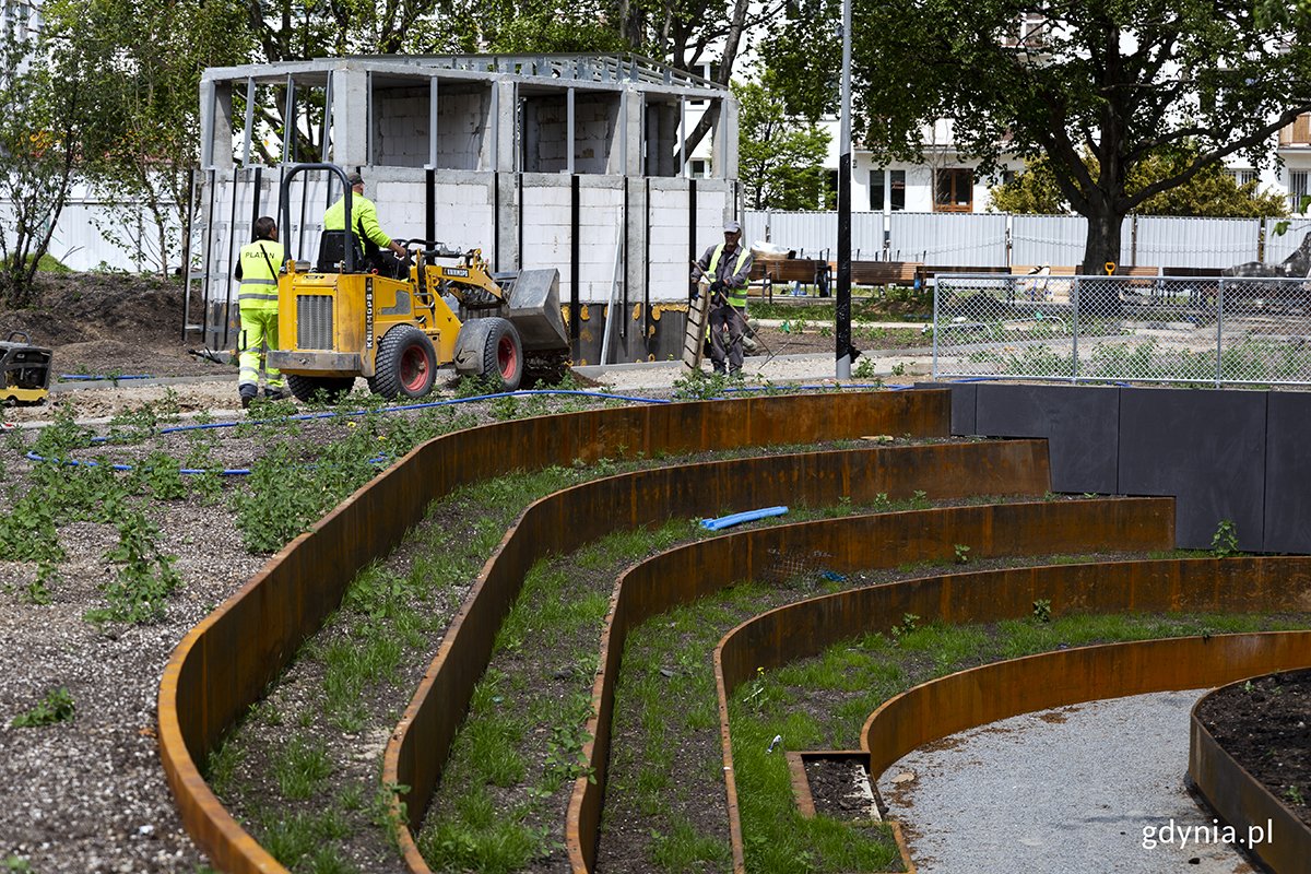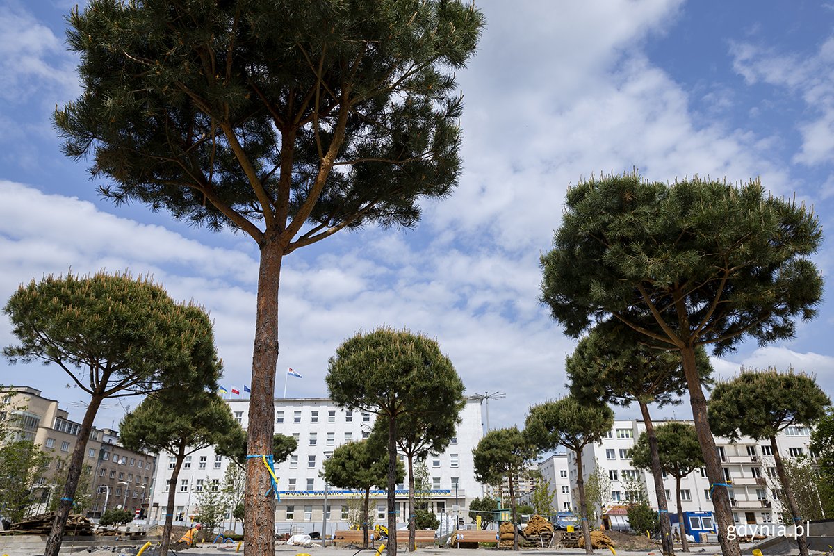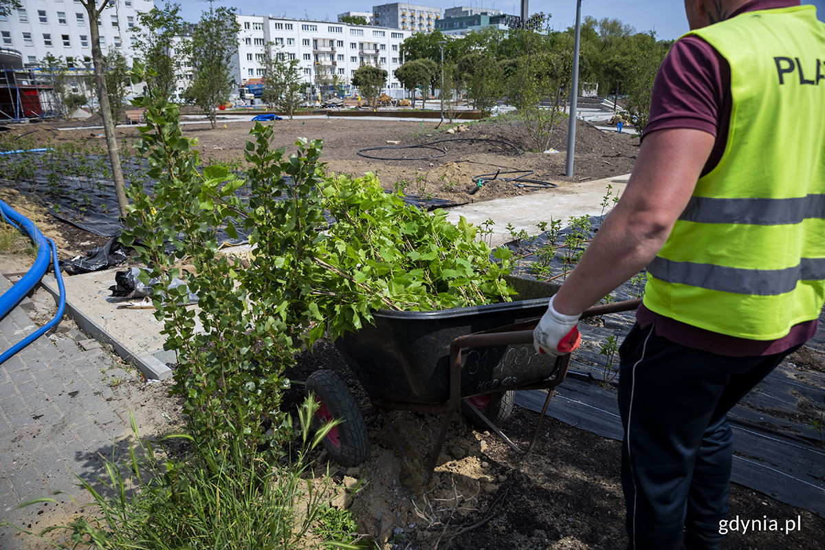 Prace budowlane i zagospodarowanie terenu 3. części Parku Centralnego na finiszu. Obok zachowanych drzew posadzono nowe, choć dzięki bardzo dobremu materiałowi szkółkarskiemu – o rozmiarach drzew kilkuletnich. Gatunki rodzime przeplatają się z obcymi, kolekcjonerskimi, tak by park miał walory poznawcze i był piękny cały rok. Otwarcie zaplanowano na koniec sierpnia. Spacerując po zamkniętej jeszcze trzeciej części Parku Centralnego, można już teraz zauważyć, że będzie to miejsce zarówno do poznawania i podziwiania bogatej roślinności, jak i do odpoczynku i rekreacji. Posadzono już wiele gatunków roślin, które wkomponowano pomiędzy zachowane stare drzewa, a prace budowlane i mała architektura są na ukończeniu. – Całymi latami teren przed Urzędem Miasta zajmował parking. Oczywiście niezwykle potrzebna infrastruktura, wiadomo że mnóstwo mieszkańców potrzebuje przyjechać czy to do urzędu, czy po prostu do Śródmieścia, ale on nie zniknie, tylko przeniesie się pod ziemię, tak aby pełnić swoją funkcję, a jednocześnie nie straszyć na powierzchni. Tymczasem tutaj zyskamy fantastyczne miejsce do spędzania czasu, do organizowania różnych przyjemności. Myślę, że zmierzamy w dobrym kierunku i że rzeczywiście poprawi to jakość życia w mieście. W Gdyni nie jest łatwo poprawiać jakość życia, bo jeżeli zaczyna się z bardzo wysokiego pułapu, to trudno wymyślić coś jeszcze. Ale jestem przekonana, że Park Centralny to właśnie takie coś jeszcze. Ja odliczam dni i myślę, że mieszkańcy czynią podobnie, a otwarcie tuż przed początkiem nowego roku szkolnego. Już dzisiaj zapraszam – mówi Katarzyna Gruszecka-Spychała, wiceprezydentka Gdyni ds. gospodarki. Na spacer po parku zabiera nas Hanna Niedźwiecka-Pasternak, zastępczyni naczelnika Wydziału Ogrodnika Miasta. Wkoło pracują ludzie i maszyny, język polski miesza się z ukraińskim - jedni wożą taczkami rośliny, inni je sadzą, ktoś podlewa te już posadzone. Od pracy udaje oderwać się na kilka minut kierownika budowy, który w cieniu zachowanej, potężnej jabłoni z maleńkimi już owocami na gałęziach (jesienią będzie można się częstować) opowiada o zaawansowaniu robót.Prace nasadzeniowe w 3. części Parku Centralnego. Fot. Przemysław Kozłowski – Generalnie mamy na ukończeniu wszystkie prace budowlane i zagospodarowanie terenu. Do końca czerwca powinniśmy zamknąć etap budowy stricte, gdzie jeździ sprzęt i są prace czysto budowlane. W lipcu jeszcze będą trwały prace związane z pielęgnacją zieleni, z nasadzeniami drobnymi, a w sierpniu powinny być odbiory całej inwestycji i przekazanie do użytkowania – mówi Sebastian Michalski, kierownik budowy. - Właśnie skończyliśmy wykonanie ścieżki toru wrotkarskiego asfaltowego. Trwają ostatnie prace drogowe, w tym dodatkowy zakres ścieżki rowerowej przed Urzędem Miasta, montaże oświetlenia, ostatnich balustrad i nawierzchni mineralnych. Także została już drobnica – podsumowuje kierownik i znika w ukończonym już garażu podziemnym. Zachowana stara jabłoń, tarasowe trawniki do odpoczynku, ozdobne kule i wejście do podziemnego garażu. Fot. Przemysław KozłowskiNiemal gotowe są dwa stawy - biologiczny, przy skateparku w 2. części parku, który czeka tylko na napełnienie wodą i wsadzenie roślin; i betonowy o głębokości maksimum 8 cm, gdzie latem będzie można się pochlapać i pobrodzić, a jak zimą ściśnie mróz - pojeździć na łyżwach. Obok tryśnie podświetlana fontanna. Stoi już pawilon z magazynem lodowiska i przyszłą wypożyczalnią łyżew, toaletą i gastronomią oraz plac zabaw. Między roślinami wije się asfaltowy tor wrotkarski i miękka ścieżka biegowa z wykładziny EPDM. Całości dopełnią leżaki, hamaki, ozdobne, lustrzane kule, ławki i mnóstwo zieleni.Ścieżka biegowa z miękkiej wykładziny EPDM. Fot. Przemysław Kozłowski Sosna – symbol nadmorskiego parku Hanna Niedźwiecka-Pasternak prowadzi do najbardziej reprezentacyjnej część parku, naprzeciwko Urzędu Miasta. Tu, na dachu podziemnego parkingu, znajduje się główny plac, na którym królują sosny, o kształcie przypominającym olbrzymie grzyby lub słynne z Teneryfy drzewa smocze.Hanna Niedźwiecka-Pasternak, zastępczyni naczelnika Wydziału Ogrodnika Miasta, fot. Przemysław Kozłowski – To nasze pospolite sosny, ale będą utrzymywane w formie pinii z płasko formowaną koroną. Są dużych rozmiarów, więc już od razu robią wrażenie rosnących tu od kilku lat. Natomiast dookoła mamy bardzo ciekawe sosny wielopniowe odmiany Watereri, też są już bardzo duże. Jest też sosna czarna. Ogólnie materiał szkółkarski jest bardzo wysokiej jakości, więc możemy zobaczyć naprawdę duże drzewa i bardzo dobrej jakości. Co oprócz sosen? – W sumie zostało posadzonych 156 drzew. Różne ciekawe gatunki. Park daje nam możliwość stworzenia i posadzenia takich gatunków, które nie tylko pełnią funkcje przyrodnicze, ale też edukacyjne, takie żeby poobserwować ciekawe odmiany. Ogólnie mamy w parku bardzo dużo drzew w formie piennej. To jest tutaj dosyć charakterystyczne i bardzo atrakcyjne – opowiada zastępczyni ogrodnika miejskiego i wskazuje na inny wielopniowy gatunek – grujecznik, występujące w Japonii i Chinach drzewo liściaste. - Wokół placu rosną wiśnie. Z liściastych drzew mamy też wzdłuż ulicy Świętojańskiej jarzęby mączne, odmiana Magnifica o ciekawym, jasno niebieskawym zabarwieniu. Mamy także tulipanowce, ambrowiec, wierzby w różnych odmianach - wierzby płaczące, wierzby o pędach o zabarwieniu pomarańczowym. Posadzone też zostały krzewy i w tej chwili sadzone są pnącza. Nasadzenia w 3. części Parku Centralnego. Fot. Przemysław KozłowskiJakie krzewy i pnącza? – Są hortensje, a w miejscach zacienionych mamy tawliny i będą też pnącza, które zarosną skarpy, głównie winorośl japoń