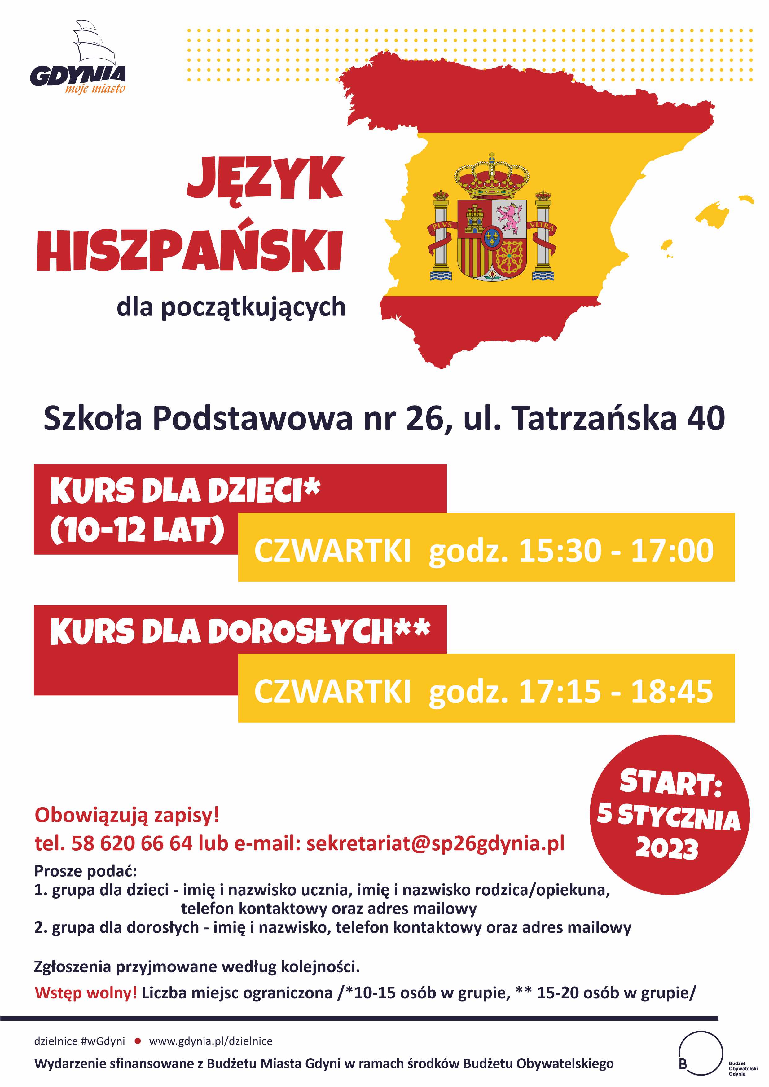 Od 5 stycznia rusza kurs dla początkujących z języka hiszpańskiego. Zajęcia przeznaczone są dla dzieci w wieku 10 – 12 lat i potrwają do 22 czerwca. Zapisy prowadzone są pod adresem e-mail: sekretariat@sp26gdynia.pl lub tel. 58 620 66 64 w godz. 07:30 – 15:30.W wiadomości należy podać: imię i nazwisko ucznia zapisanego na kurs, imię i nazwisko rodzica/opiekuna prawnego, telefon kontaktowy oraz adres e-mail.O przyjęciu na kurs decyduje kolejność zgłoszeń.Zajęcia odbywać się będą w Szkole Podstawowej nr 26, ul. Tatrzańska 40 w Gdyni, w grupach grupa 10-15 osobowych, 30 spotkań po 90 minut w czwartki w godzinach 15:30- 17:00.Każdy z uczestników kursu otrzyma materiały do nauki języka.Zajęcia są dla osób chętnych i zainteresowanych nauką tego pięknego języka. Jest to projekt realizowany w ramach Budżetu Obywatelskiego Gdynia, koordynatorem jest Wydział Edukacji UM Gdyni. Opublikowano: 27.12.2022 11:15 Autor: Dorota Matejczyk (dorota.matejczyk@gdynia.pl) Zmodyfikowano: 05.01.2023 15:52 Zmodyfikował: Paweł Jałoszewski