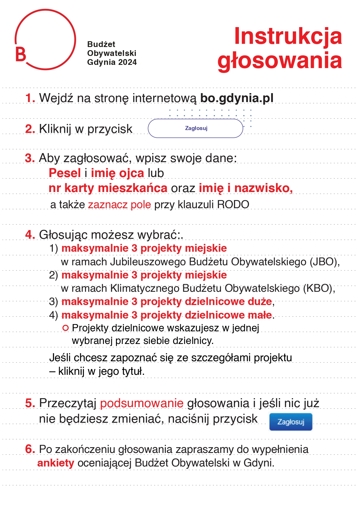 Potańcówka, warsztaty kreatywne, wspólne pieczenie babeczek… i Budżet Obywatelski! W najbliższych dniach podczas kilku różnych wydarzeń odbywających się w naszym mieście będzie można oddać głos na ulubione projekty BO2024. Na uczestników będą czekać nie tylko atrakcje, ale także specjalne stoiska do głosowania, a w razie potrzeby i wsparcie na każdym etapie procesu. Głosowanie w gdyńskim Budżecie Obywatelskim rozpoczęło się w poniedziałek, 2 września i potrwa 15 dni. Tym samym do 16 września włącznie mieszkańcy i mieszkanki mogą wybierać z puli 279 projektów te, których realizacji chcą najbardziej. Lista wszystkich projektów, wraz z ich opisami, jest dostępna na stronie internetowej Budżetu Obywatelskiego. – Wybieramy 4 razy 3, czyli po maksymalnie trzy projekty w czterech kategoriach. Trzy miejskie w ramach Jubileuszowego Budżetu Obywatelskiego, trzy Klimatycznego Budżetu Obywatelskiego oraz trzy dzielnicowe duże i trzy dzielnicowe małe, w ramach jednej dzielnicy. Projekty wybieramy online, więc można to zrobić w każdej wolnej chwili w domu albo w dowolnie wybranym czasie i miejscu. Głosowanie trwa zaledwie kilka minut. Zachęcam do udziału, na Państwa głosy czeka wiele ciekawych pomysłów gdynian i gdynianek – mówi Tomasz Augustyniak, wiceprezydent Gdyni. Głosowanie w gdyńskim Budżecie Obywatelskim prowadzone jest wyłącznie online, za pośrednictwem strony internetowej www.bo.gdynia.pl. Udział w głosowaniu może wziąć każda osoba mieszkająca w Gdyni – bez względu na wiek, czy adres zameldowania. Wystarczy wpisać swój PESEL i imię ojca lub numer Karty Mieszkańca oraz imię i nazwisko, a następnie podążać za instrukcją. Osoby, które nie mają dostępu do Internetu lub mają jakieś pytania, mogą oddać głos w stacjonarnych punktach głosowania. W najbliższych dniach będzie można także oddać głos w trakcie specjalnych wydarzeń w Domach Sąsiedzkich oraz w Wymiennikowni. 4.09 (środa) w godz. 16.00-19.00: Piknik kreatywny w Domu Sąsiedzkim Gdynia Przystań Śmidowicza 49 6.09 (piątek) w godz. 18.30-21.30: Potańcówka na ZOHa w Domu Sąsiedzkim w Gdynia Przystań Opata Hackiego 33 10.09 (wtorek), godz. 16.30-19.30: warsztaty artystyczne w Domu Sąsiedzkim w Gdynia Przystań Lipowa 15 11.09 (środa) w godz. 17.00-20.00: WSPÓLNE GŁOSOWANIE W BUDŻECIE OBYWATELSKIM w Wymiennikownia 12.09 (czwartek): godz. 17.30-19.00: warsztaty kreatywne w Domu Sąsiedzkim w Gdynia Przystań Widna 2A W punkcie głosowania można skorzystać ze sprzętu udostępnionego przez Laboratorium Innowacji Społecznych, ale też z własnego telefonu lub tabletu. – Będziemy czekać na osoby, które chciałyby oddać głos, a także na tych, którzy mają pytania związane z Budżetem Obywatelskim. W razie potrzeby pomożemy przejść proces krok po kroku. To trwa naprawdę kilka minut – mówi Magdalena Warmowska z Działu Diagnoz i Partycypacji LIS, jednostki koordynującej proces gdyńskiego Budżetu Obywatelskiego. Wyniki głosowania poznamy do 20 września. W tej edycji do rozdysponowania jest ponad 13 milionów złotych, a w dzielnicach z największą frekwencją zostaną zrealizowane dodatkowe projekty. Opublikowano: 03.09.2024 15:00 Autor: Ksenia Pisera (k.pisera@lis.gdynia.pl) Zmodyfikowano: 03.09.2024 16:31 Zmodyfikował: Magdalena Czernek
