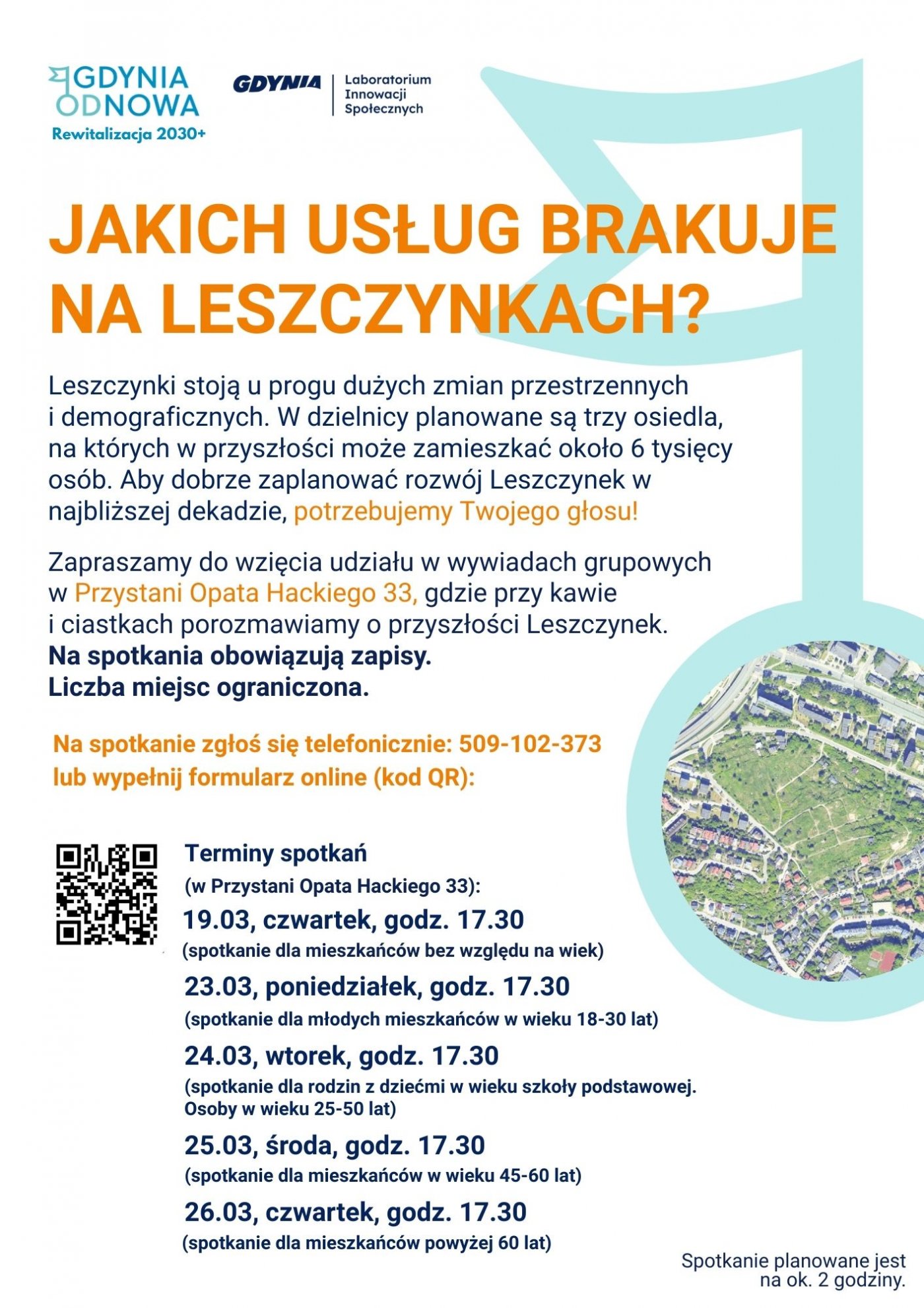 Mieszkasz na Leszczynkach? Chcemy poznać Twoje zdanie. Laboratorium Innowacji Społecznych rozpoczyna w marcu wywiady grupowe (tzw. fokusy), podczas których rozmowy toczyć się będą wokół usług, jakich potrzebuje dzielnica – teraz i w przyszłości. Do udziału zaproszeni są wszyscy zainteresowani. Dlaczego teraz? Leszczynki stoją u progu dużych zmian. Kluczowym miejscem planowanych przemian jest Wzgórze Orlicz-Dreszera – ponad dziesięciohektarowy teren w centrum dzielnicy, który przez lata funkcjonował jako osiedle substandardowej zabudowy. Przeprowadzony w ramach rewitalizacji program osłonowy umożliwił dawnym mieszkańcom skorzystanie z pomocy finansowej i organizacyjnej miasta w znalezieniu innego miejsca do życia. Obecnie teren jest w większości niezamieszkały. Trwa procedura zmiany miejscowego planu zagospodarowania przestrzennego, która może otworzyć drogę do powstania nowego osiedla dla około dwóch tysięcy mieszkańców.To jednak nie jedyne miejsce potencjalnych zmian. W kilkuletniej perspektywie są inwestycje mieszkaniowe na stoku morenowym przy ul. Widok. Trwa budowa osiedla także na terenie dawnego T.O.S.-u. Łącznie w tych trzech lokalizacjach mogłoby zamieszkać nawet około 6 tysięcy nowych osób. Oznacza to, że Leszczynki w ciągu dekady mogą się zupełnie odmienić.Tak duży napływ nowych mieszkańców rodzi pytania o przyszłość usług w dzielnicy. Pomysł na badanie wyszedł od Komitetu Rewitalizacji i znalazł swoje miejsce w nowym Gminnym Programie Rewitalizacji Gdyni 2030+. To dobry moment, żeby porozmawiać o potrzebach, oczekiwaniach i obawach. Co jest ważne? Na spotkaniach i podczas rozmów z mieszkańcami najczęściej pojawiały się obawy o miejsca w szkołach i przedszkolach, liczbę żłobków, infrastrukturę drogową czy ofertę rekreacyjną. Opinie będą skonfrontowane z rzetelną analizą dostępności: usług społecznych, takich jak żłobki, przedszkola i szkoły, usług zdrowotnych, infrastruktury kulturalnej i sąsiedzkiej, np. bibliotek czy domów sąsiedzkich, przestrzeni rekreacyjnych – parków, skwerów i placów zabaw, usług komercyjnych. Badanie obejmie zarówno ocenę obecnej sytuacji w dzielnicy, jak i prognozę potrzeb, które mogą pojawić się wraz z napływem nowych mieszkańców. Dla kogo? W marcu odbędzie się seria spotkań z różnymi grupami związanymi z dzielnicą – ekspertami miejskimi, radnymi, aktywistami i samymi mieszkańcami. Istotne jest, żeby każde z tych środowisk mogło zabrać głos. Harmonogram spotkań dla mieszkańców: 19 marca, poniedziałek, godz. 17:30 – spotkanie otwarte dla mieszkańców, 23 marca, poniedziałek, godz. 17:30 – spotkanie dla młodych mieszkańców w wieku 18-30 lat, 24 marca, wtorek, godz. 17:30 – spotkanie dla rodzin z dziećmi w wieku szkoły podstawowej. Osoby w wieku 25-50 lat. 25 marca, środa, godz. 17:30 – spotkanie dla mieszkańców w wieku 45-60 lat, 26 marca, czwartek, godz. 17:30 – spotkanie dla mieszkańców w wieku powyżej 60 lat. Miejsce: Przystań, ul. Opata Hackiego 33Na spotkania obowiązują zapisy. Liczba miejsc jest ograniczona.Zgłoszenia przyjmuje Bartosz Chruścielski z agencji badawczej Inny Format, nr tel. 509 102 373.Formularz zgłoszeniowy znajduje się tutaj.Wiedza i doświadczenie uczestników spotkań będą ważnym punktem odniesienia dla całego procesu badawczego i pomogą lepiej zrozumieć potrzeby dzielnicy w kontekście planowanych zmian. Co dalej z wynikami? Wyniki badania posłużą jako podstawa do dalszych decyzji planistycznych dotyczących rozwoju usług w dzielnicy. Zebrane opinie i analizy pomogą odpowiedzieć na pytanie, jakie funkcje powinny pojawić się m.in. na terenie Wzgórza Orlicz-Dreszera.Jeśli mieszkasz na Leszczynkach i chcesz opowiedzieć o swoich potrzebach i oczekiwaniach — zapraszamy na spotkania między 19 a 26 marca. Galeria zdjęć Pobierz galerię Plakat promujący badania fokusowe na Leszczynkach (mat. Laboratorium Innowacji Społecznych) Pobierz zdjęcie Warunki pobierania Wszelkie prawa do zdjęć lub grafik prezentowanych w ramach portalu, należą do Prowadzącego portal lub do podmiotów z nim współpracujących i podlegają ochronie prawnej. Prowadzący portal zezwala na kopiowanie i przedstawianie utworów jedynie w celach niekomercyjnych oraz pod warunkiem zachowania go w oryginalnej postaci i zachowaniem kontekstu tematu, do którego zostało wykorzystaneprzez redakcję gdynia.pl. Opublikowane materiały powinny zawsze zawierać źródło, czyli adres strony www.gdynia.pl. Na publikowanie utworów w innych celach wymagana jest zgoda właściciela strony czyli Prowadzącego portal. Opublikowano: 10.03.2026 13:30 Autor: Karolina Ford-Kłopotowska (k.ford-klopotowska@lis.gdynia.pl)
