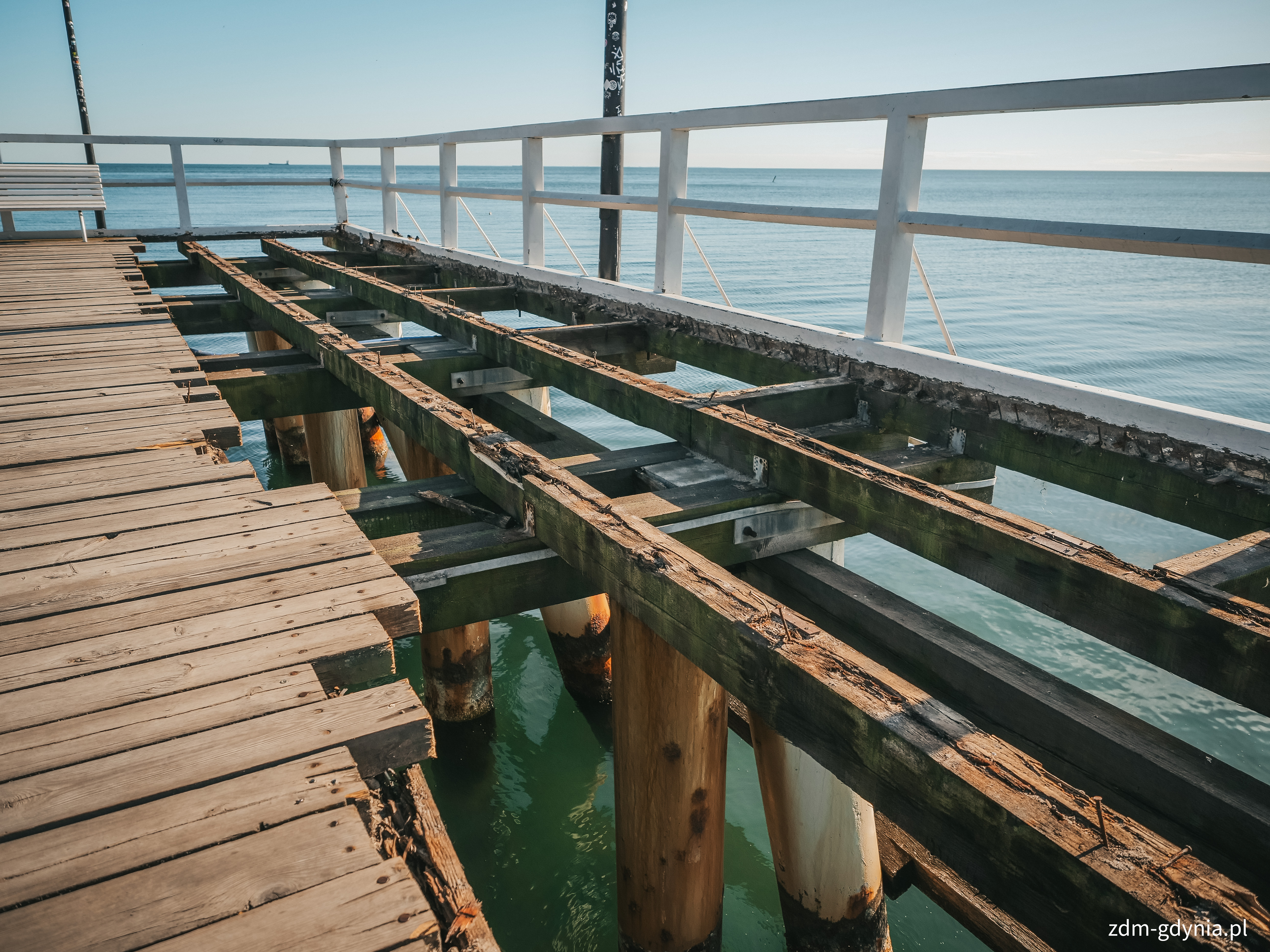 Głowica mola w Orłowie, czasowo wygrodzona w związku z prowadzonymi od początku kwietnia pracami konserwacyjno-utrzymaniowymi, pozostanie niedostępna dla spacerowiczów. Decyzja podyktowana jest względami bezpieczeństwa. W ramach rozpoczętych 8 kwietnia robót wykonywano standardowe prace przygotowujące obiekt do sezonu turystycznego, obejmujące naprawę barier i krawężników, uzupełnianie ubytków, malowanie oraz wymianę uszkodzonych desek pokładu. Korozja ujawniona podczas prac W trakcie prac, po demontażu skorodowanego krawężnika okazało się, że znajdującą się pod nim konstrukcja nośna jest skorodowana. Sytuacja wymagała dodatkowej oceny technicznej oraz sporządzenia szczegółowej opinii dotyczącej stanu obiektu w tym miejscu. Molo w Orłowie jest regularnie kontrolowane pod kątem stanu technicznego przez pracowników Zarządu Dróg Miejskich w Gdyni. Po zdjęciu części pokładu okazało się, że należy wymienić belki konstrukcji nośnej w części głowicowej. Po otrzymaniu opinii technicznej zdecydowaliśmy o utrzymaniu zamknięcia tego fragmentu mola do czasu przeprowadzenia remontu. Bezpieczeństwo użytkowników pozostaje naszym priorytetem – podkreśla Michał Felon, dyrektor Zarządu Dróg Miejskich w Gdyni. Opinia techniczna: głowica wymaga naprawy Po zdjęciu części pokładu ujawniono uszkodzone belki konstrukcji nośnej głowicy mola (fot. Marcin Mielewski, Zarząd Dróg Miejskich) Odebrana 29 kwietnia ekspertyza wykazała, że na całej szerokości końcowej części mola bariera nie zapewnia bezpieczeństwa użytkowników. W związku z tym głowica mola pozostanie wyłączona z użytkowania do czasu wykonania remontu całego mola. Kolejny etap: dokumentacja i remont Obecnie Zarząd Dróg Miejskich przygotowuje się do zlecenia dokumentacji i przeprowadzenia remontu obiektu.Końcowy fragment mola pozostanie zamknięty do czasu wykonania całości remontu. Pozostała część obiektu pozostaje dostępna dla spacerowiczów. Opublikowano: 30.04.2026 14:15 Autor: Marcin Mielewski (marcin.mielewski@zdm-gdynia.pl) Zmodyfikowano: 30.04.2026 15:58 Zmodyfikował: Jakub Winiewski